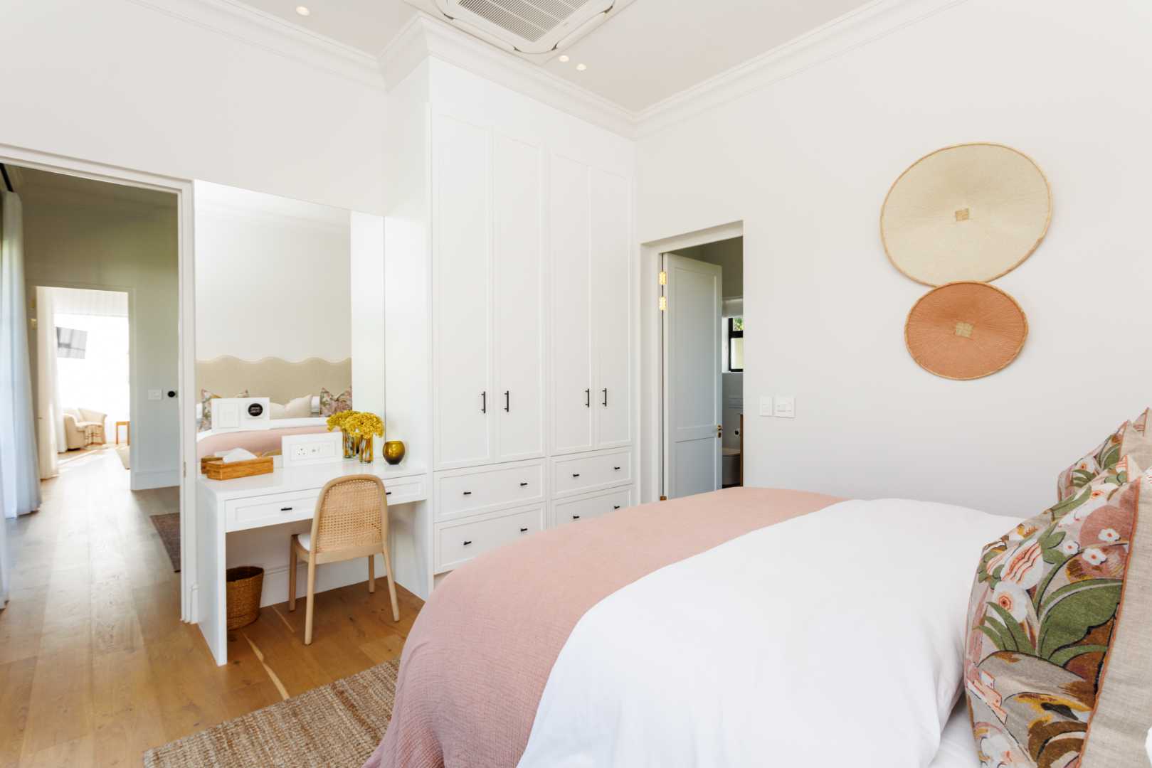 Upstairs, the beautiful main bedroom features a walk-in dressing room, a private study, an outdoor shower, underfloor heating and an additional en-suite bedroom. The ground floor has three more elegant en-suite bedrooms, a coffee station and a guest cloakroom.