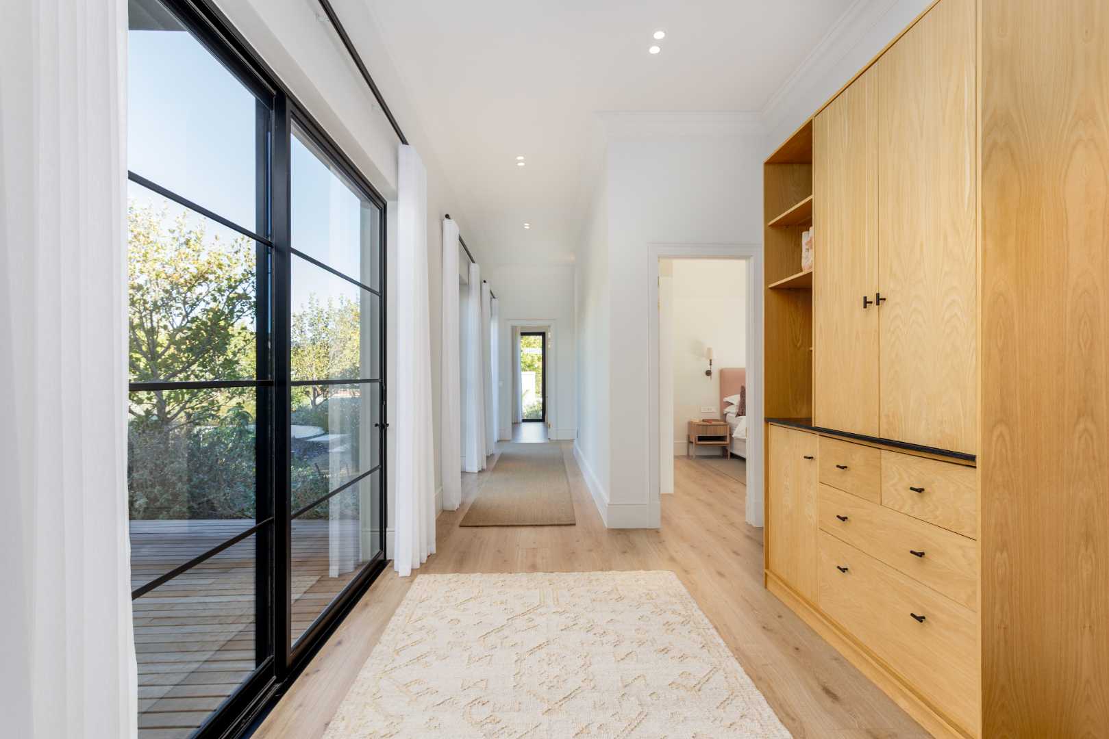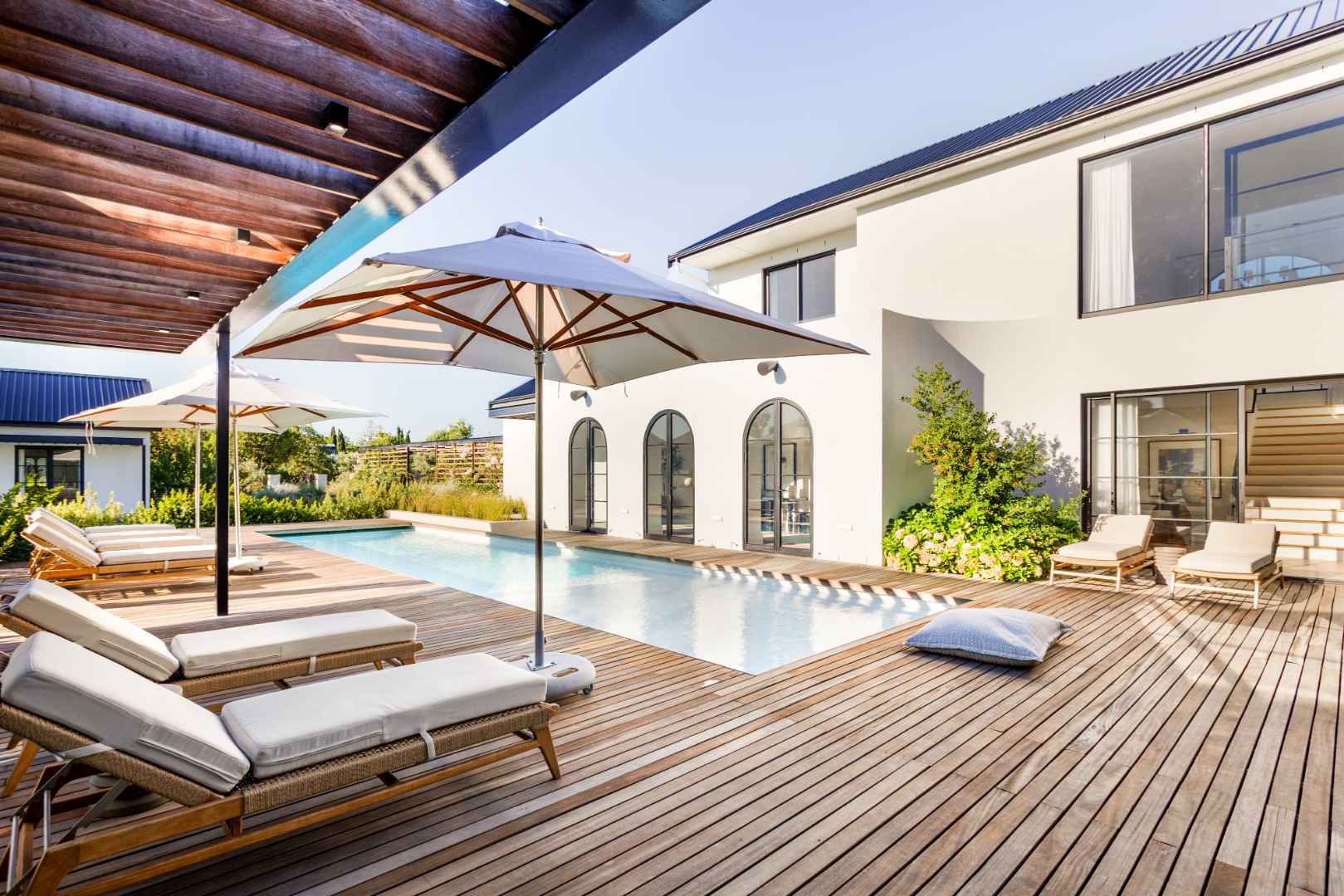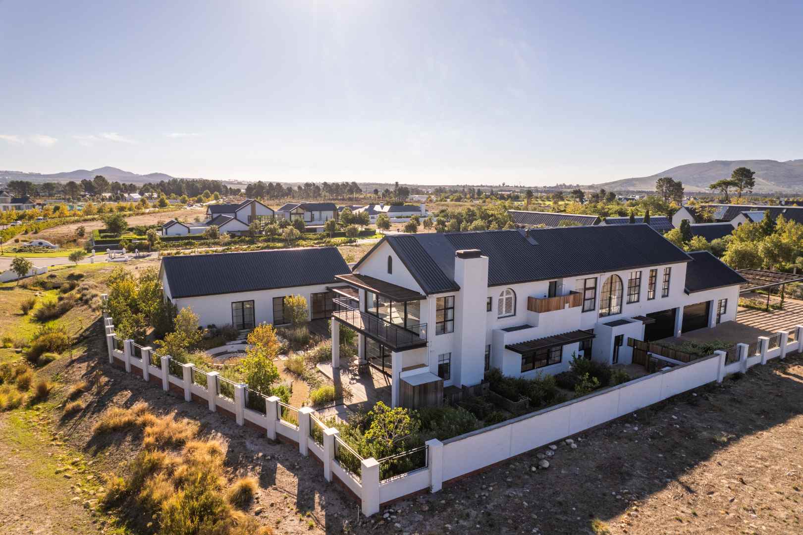 The home ensures efficiency and energy independence via three 12kVA three-phase SunSynk inverter systems, 36 solar panels, three 5kVA batteries, app-controlled home management and full Wi-Fi. Irrigation uses a Berg River water allocation.