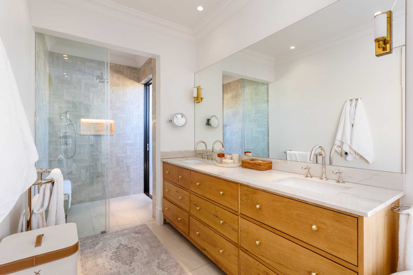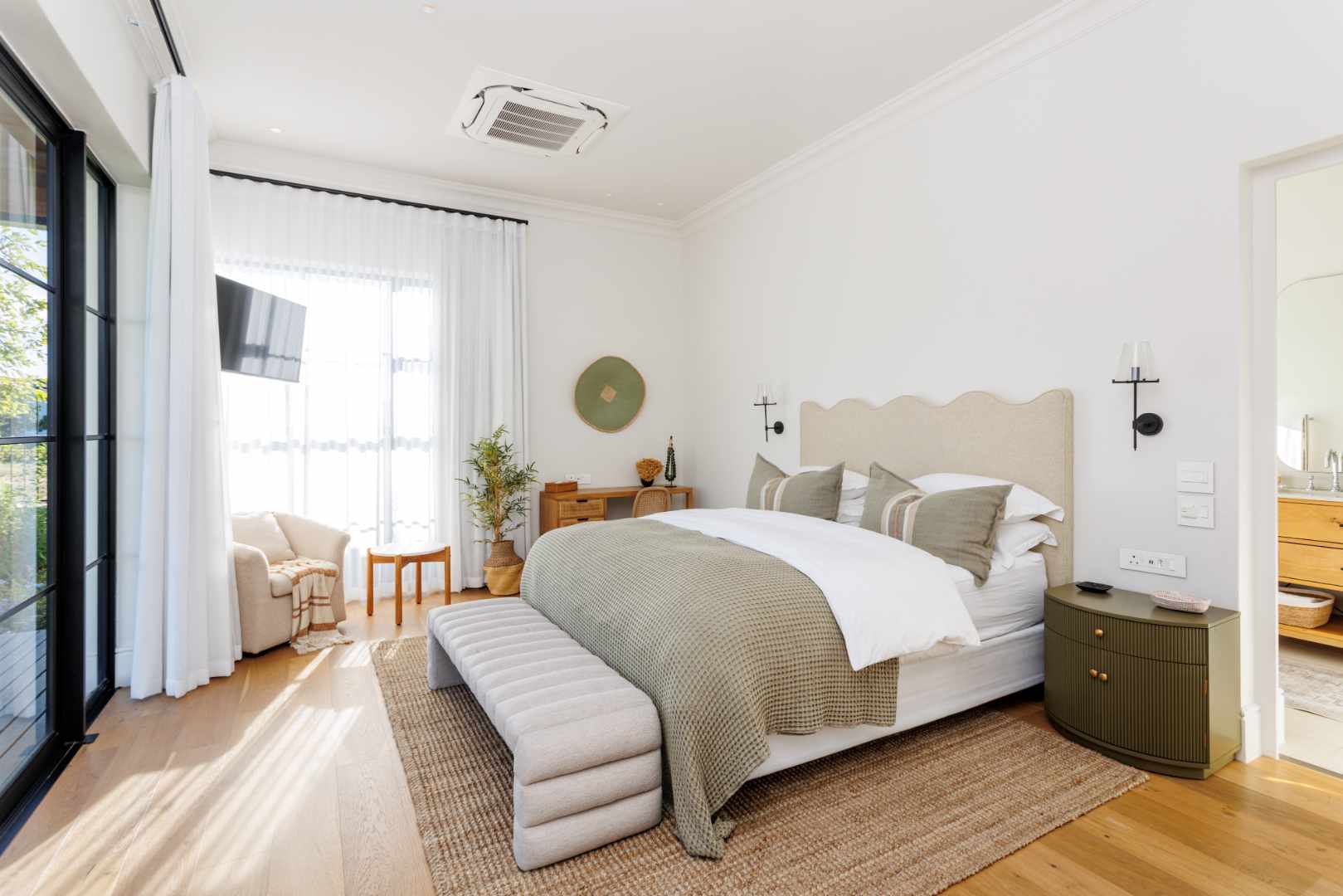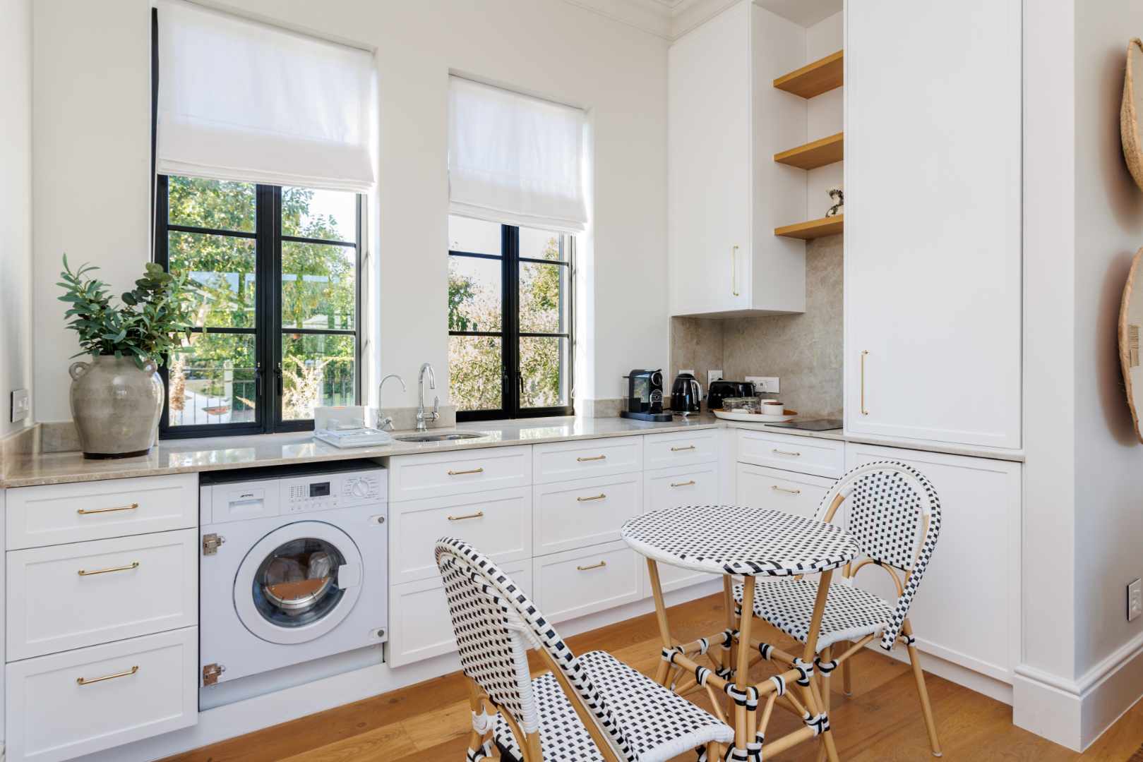 The home ensures efficiency and energy independence via three 12kVA three-phase SunSynk inverter systems, 36 solar panels, three 5kVA batteries, app-controlled home management and full Wi-Fi. Irrigation uses a Berg River water allocation.