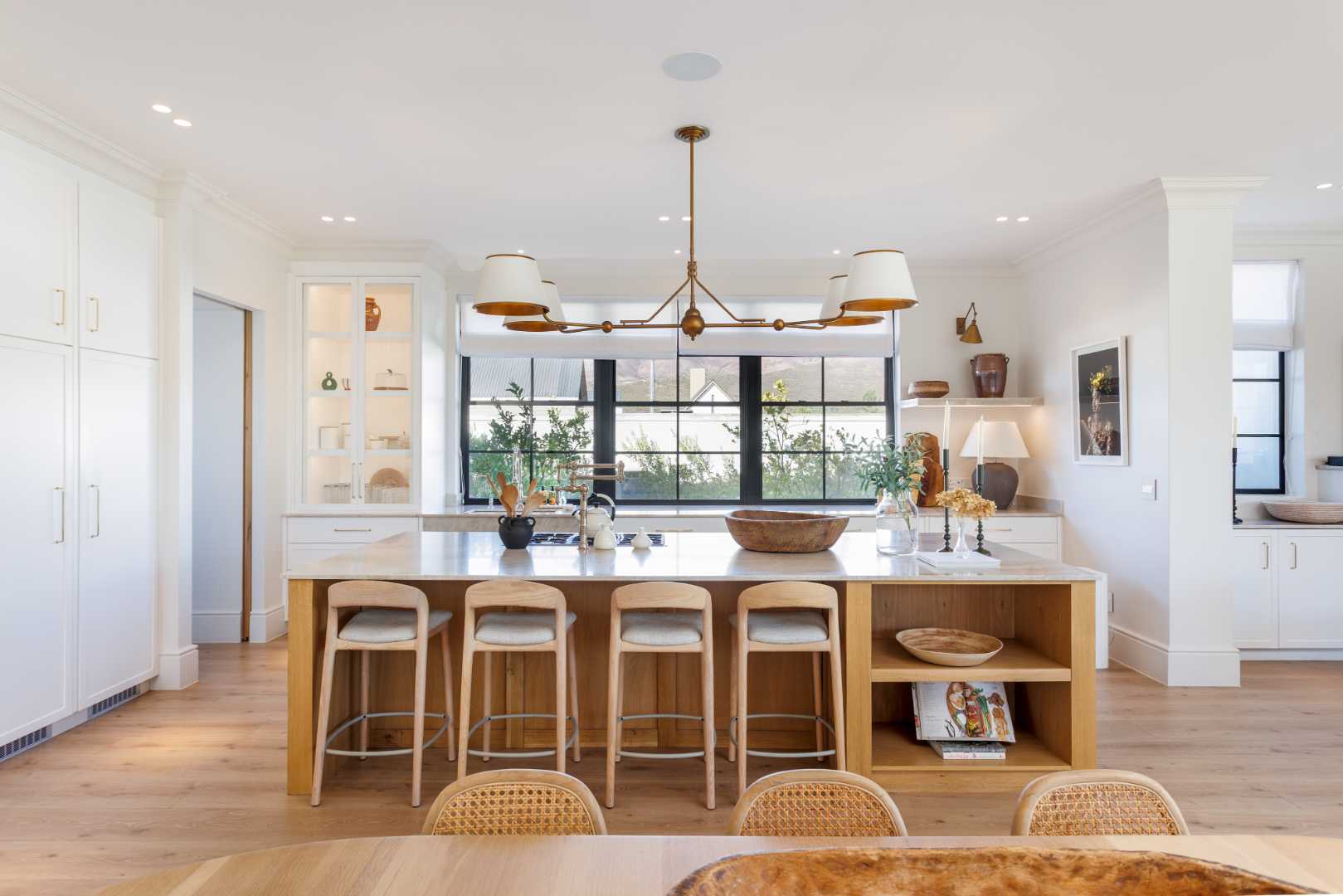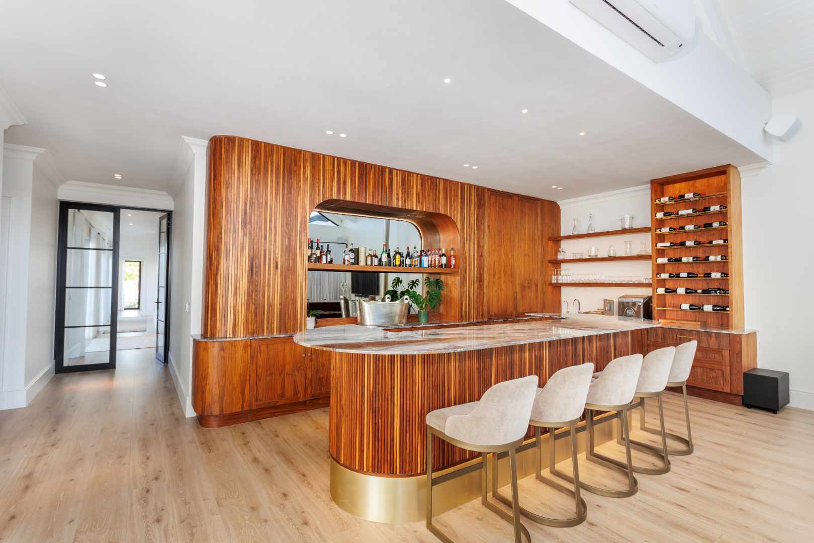A contemporary open-plan kitchen with soft finishes and a graceful lounge flows into the impressive dining area and a bar with its own entertainment lounge, offering multiple spaces for hosting and relaxed family living.