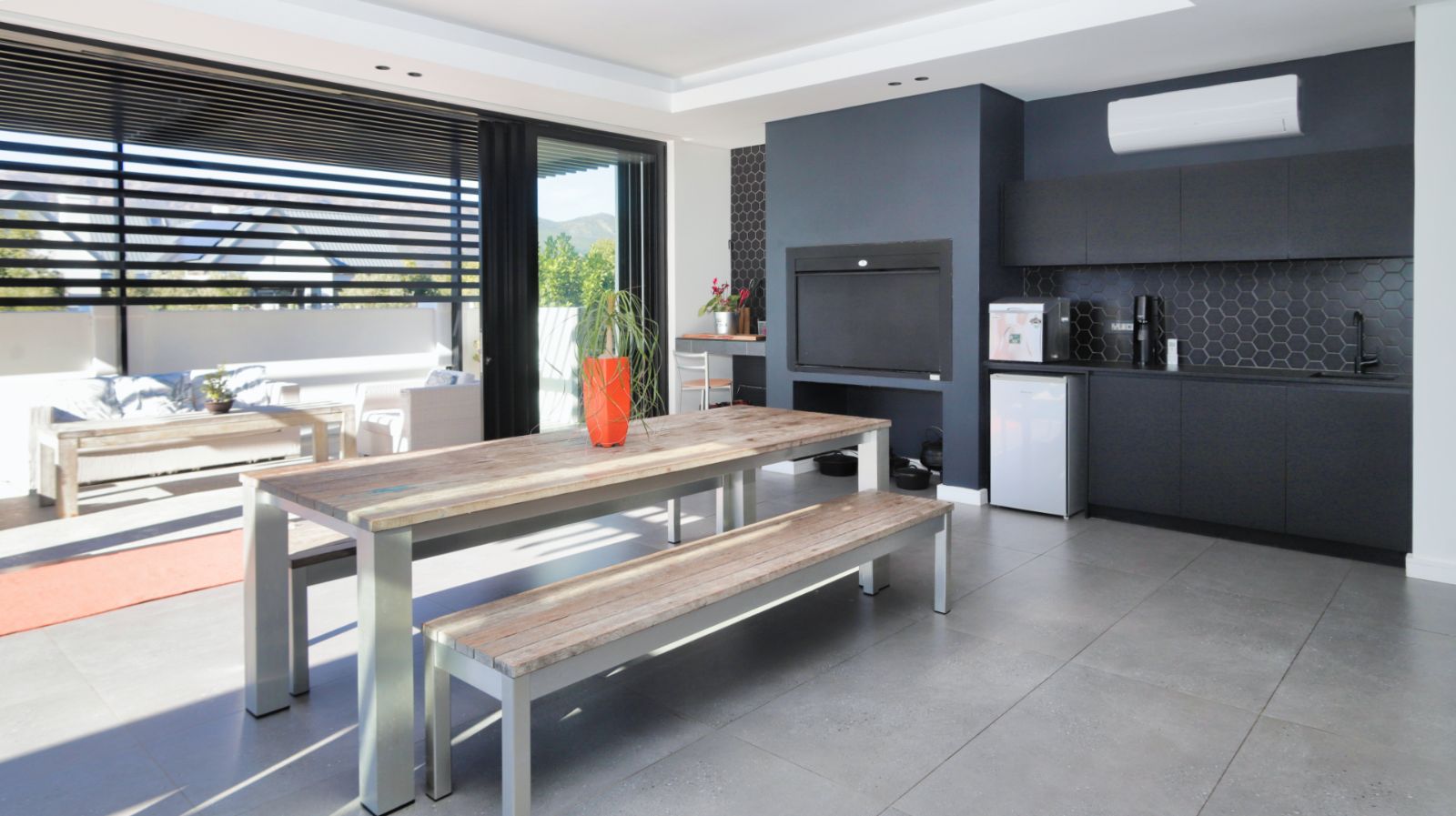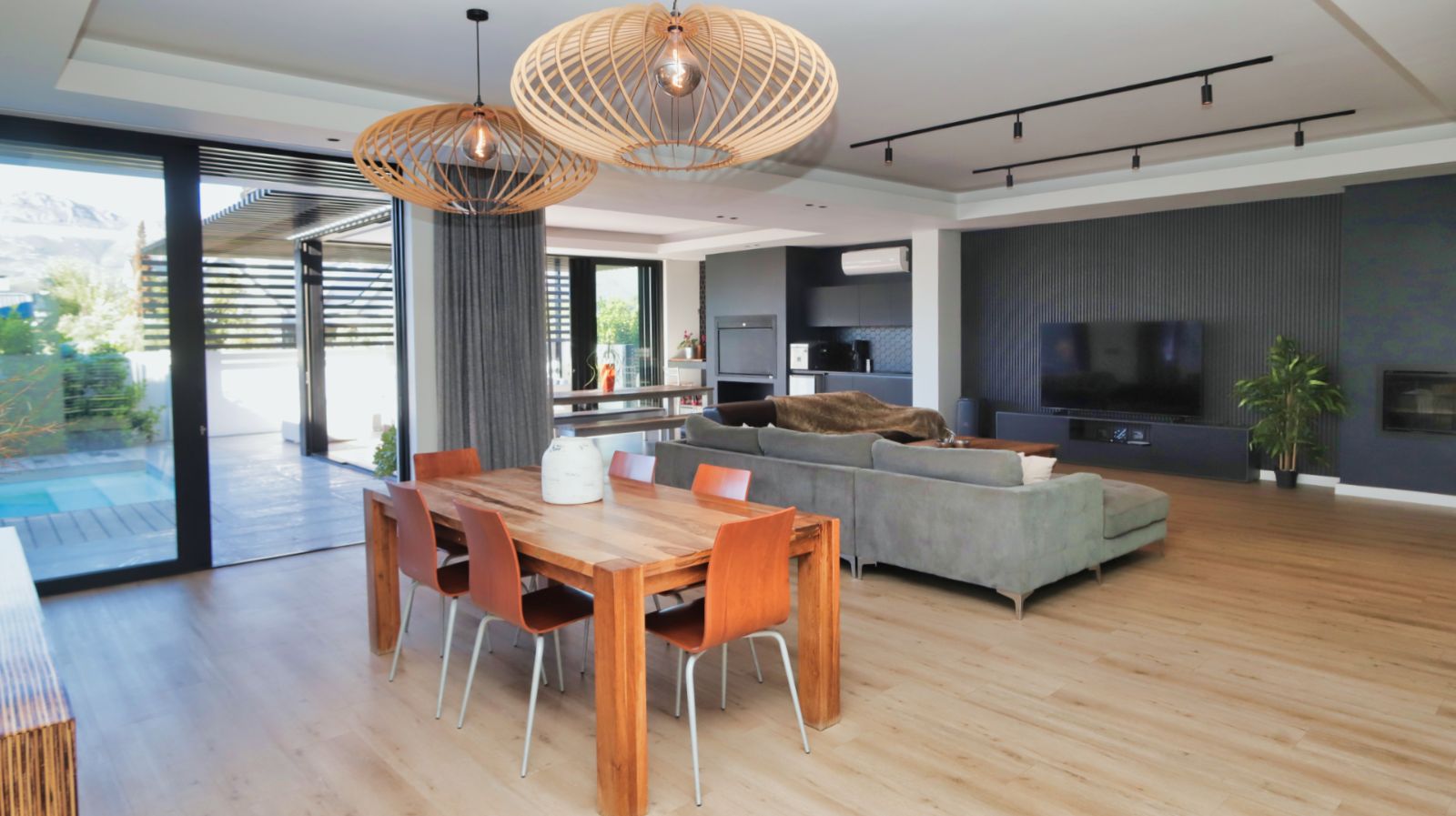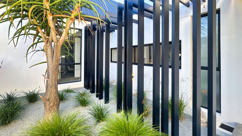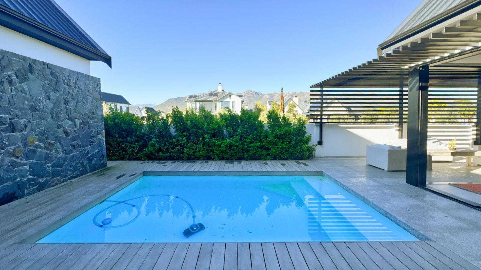 Set against the backdrop of the majestic Cape Winelands, the low-maintenance garden enhances the clean architectural lines of the home, while the newly built design ensures modern convenience and timeless elegance.