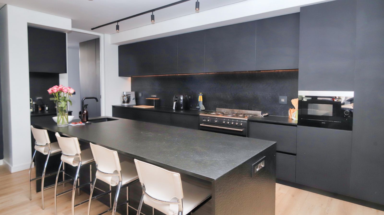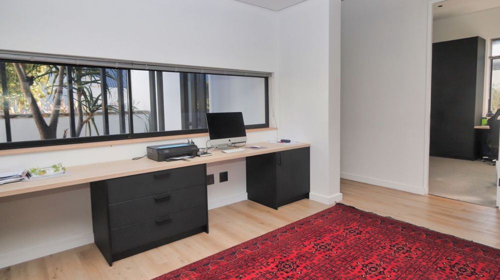 A bespoke home office, complete with extensive built-in cupboards and three dedicated workstations, ensures absolute comfort for those working from home.