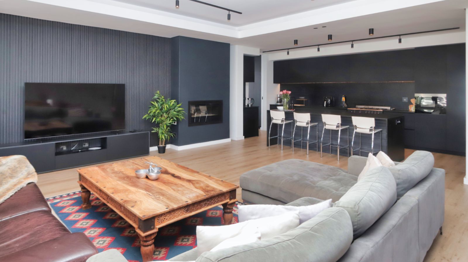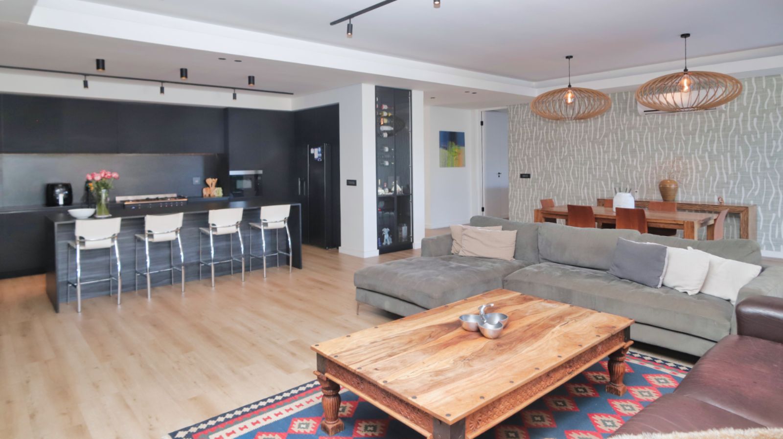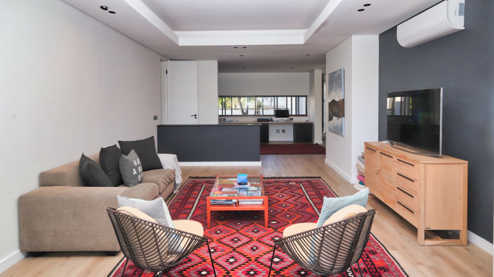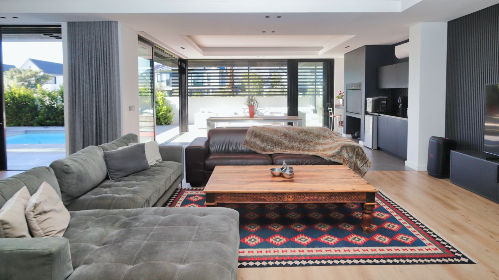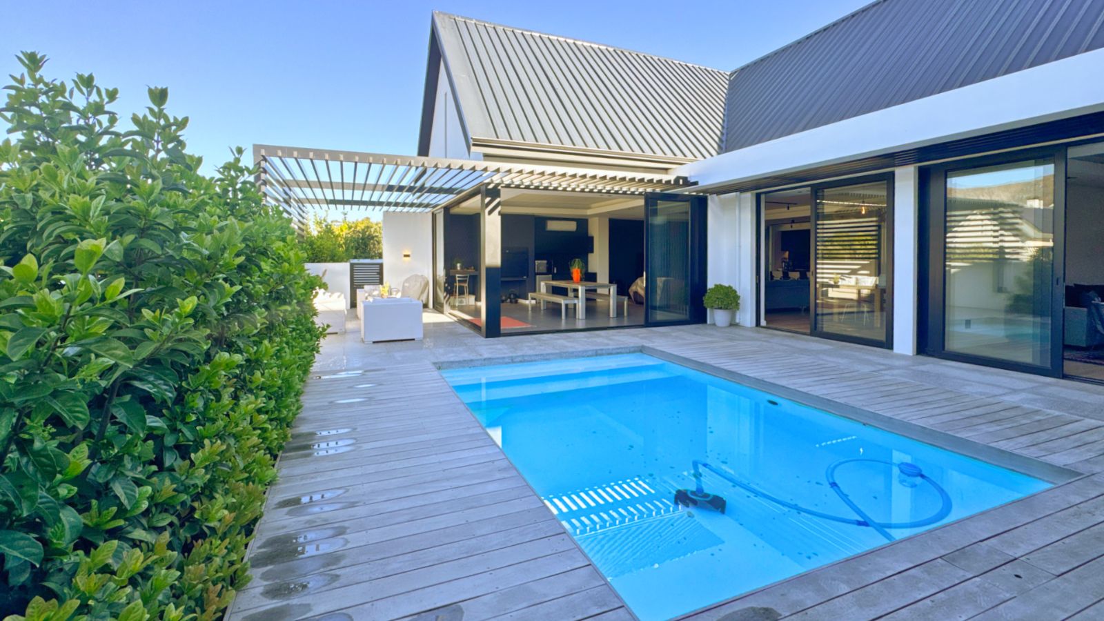 The elegant open-plan design features a dining room, lounge, braai room and a state-of-the-art kitchen, all framed by sliding doors that spill onto the sparkling pool. On a separate wing, a spacious TV lounge and pajama lounge create multiple areas for relaxation, each with direct access to the pool and garden.