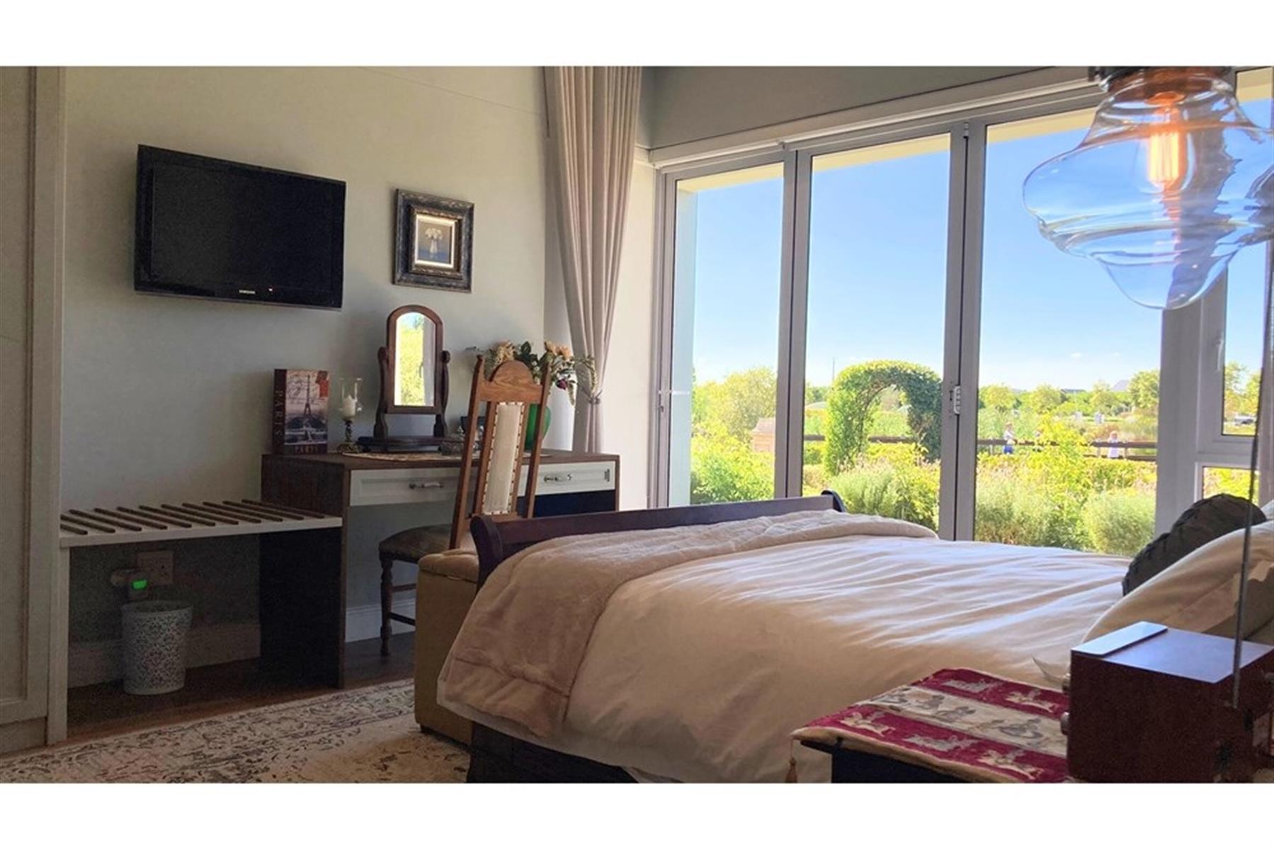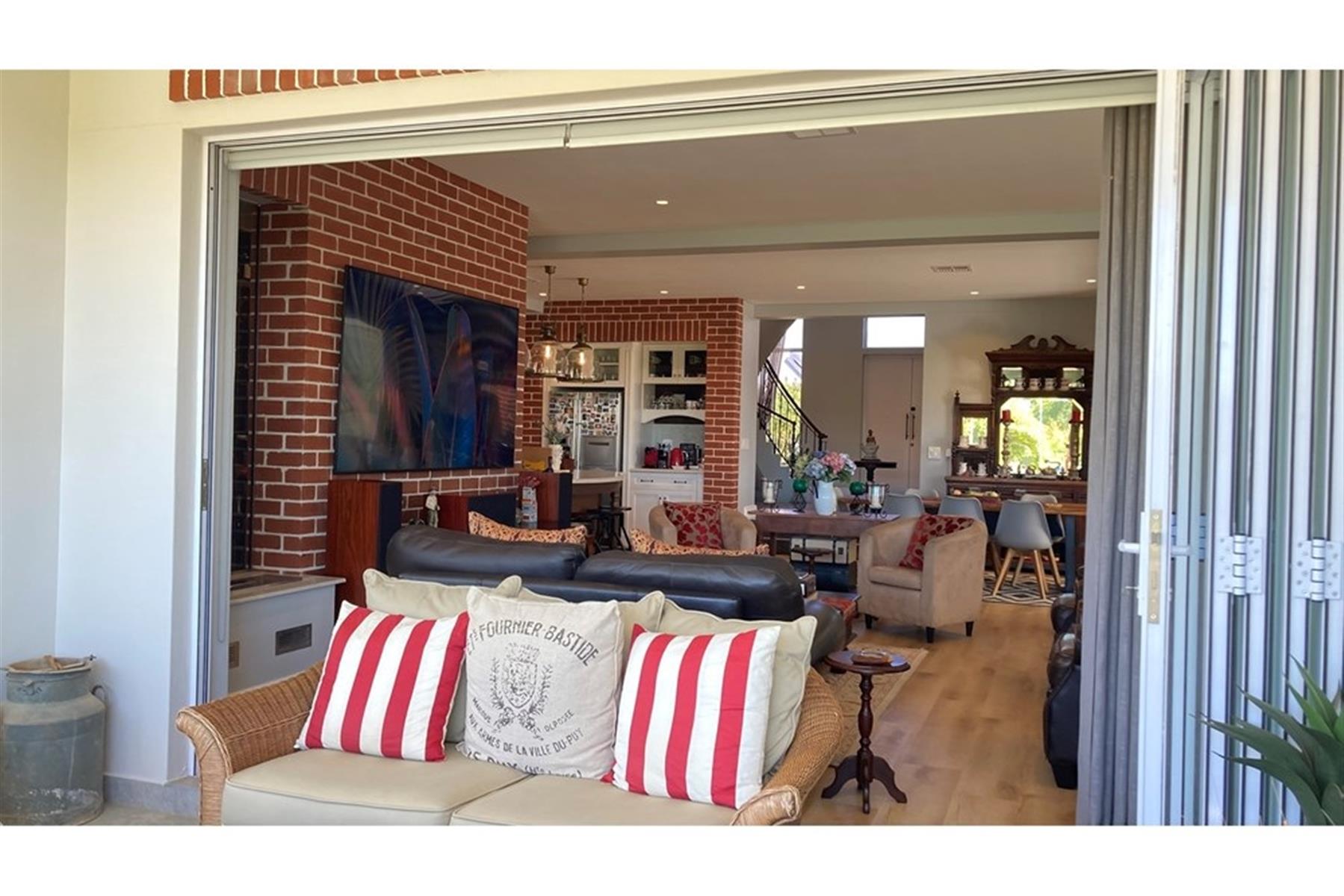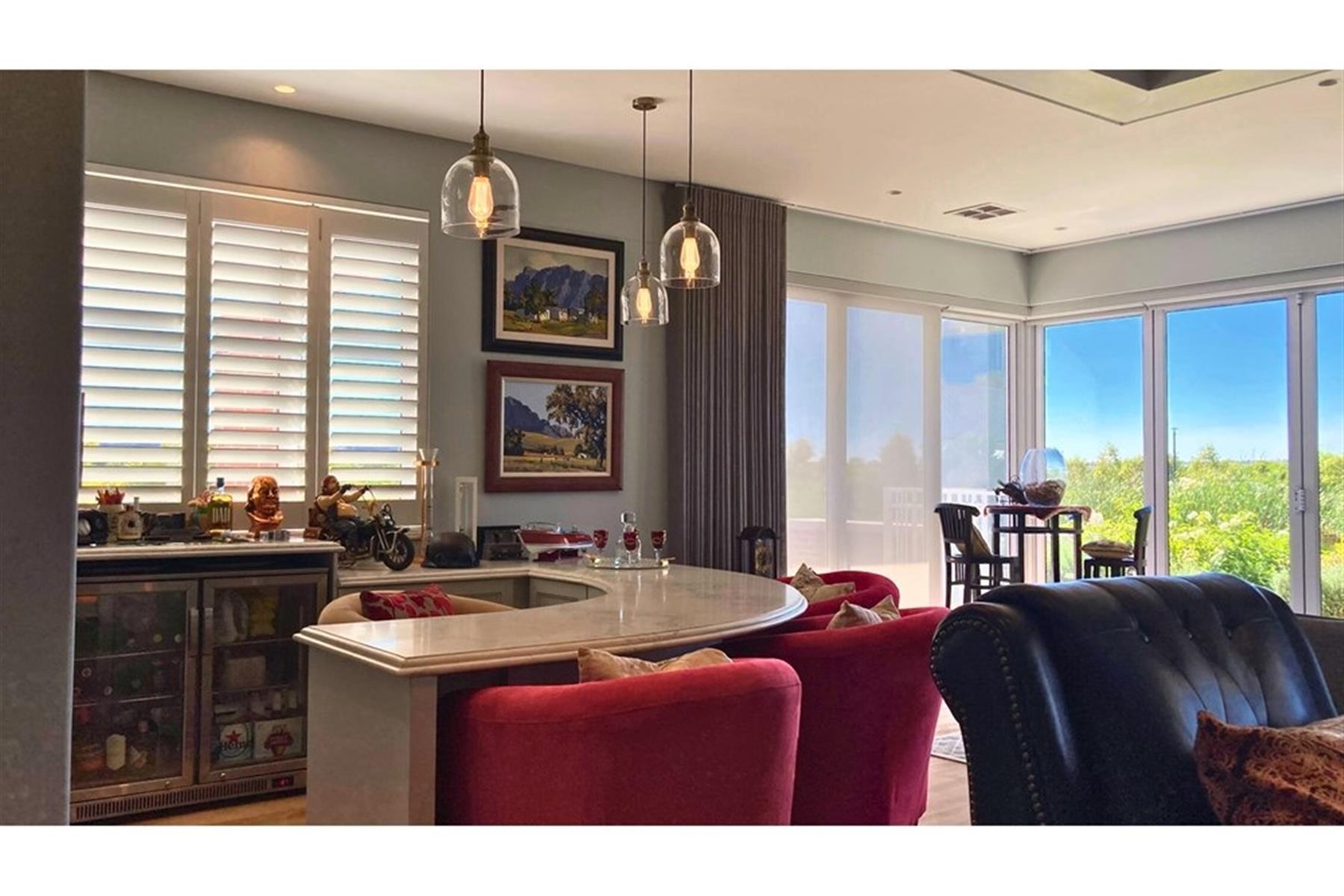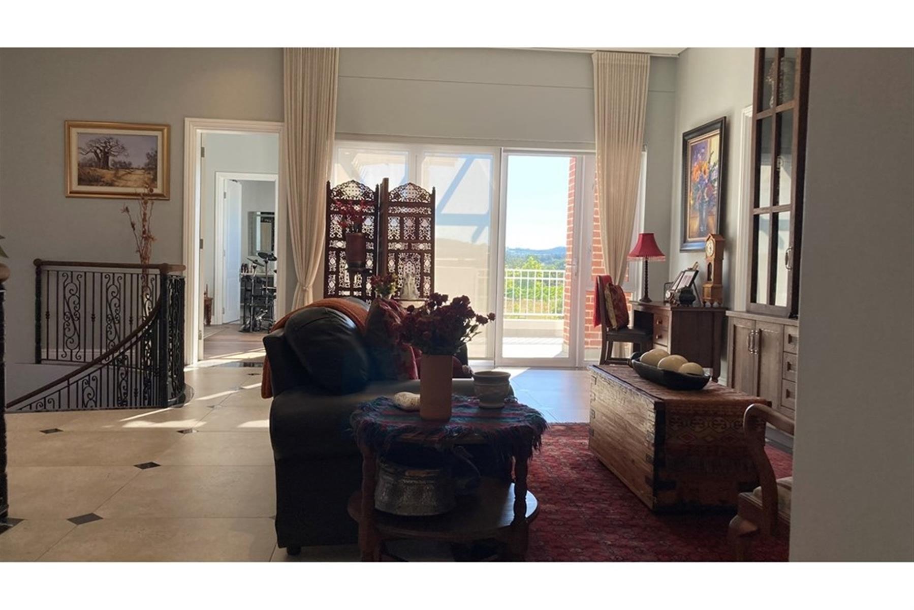 A wraparound balcony further enhances the peaceful ambiance, offering breathtaking views at every turn. The ground floor serves as both a sanctuary for everyday living and an entertainer`s dream. The Provincial Français-style kitchen is the heart of the home, equipped with a large pantry and scullery, and adjoins a remarkable wine cellar that separates the kitchen from the open-plan dining and living areas. These spaces flow effortlessly into a natural light-drenched enclosed patio and a custom-designed bar, with a convenient serving hatch connecting to the outdoor entertainment area. The private garden is ideal for family gatherings, complete with a sparkling pool, built-in braai, and firepit area.