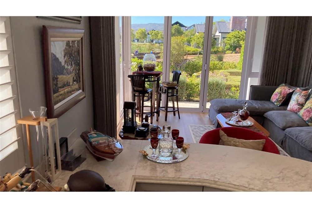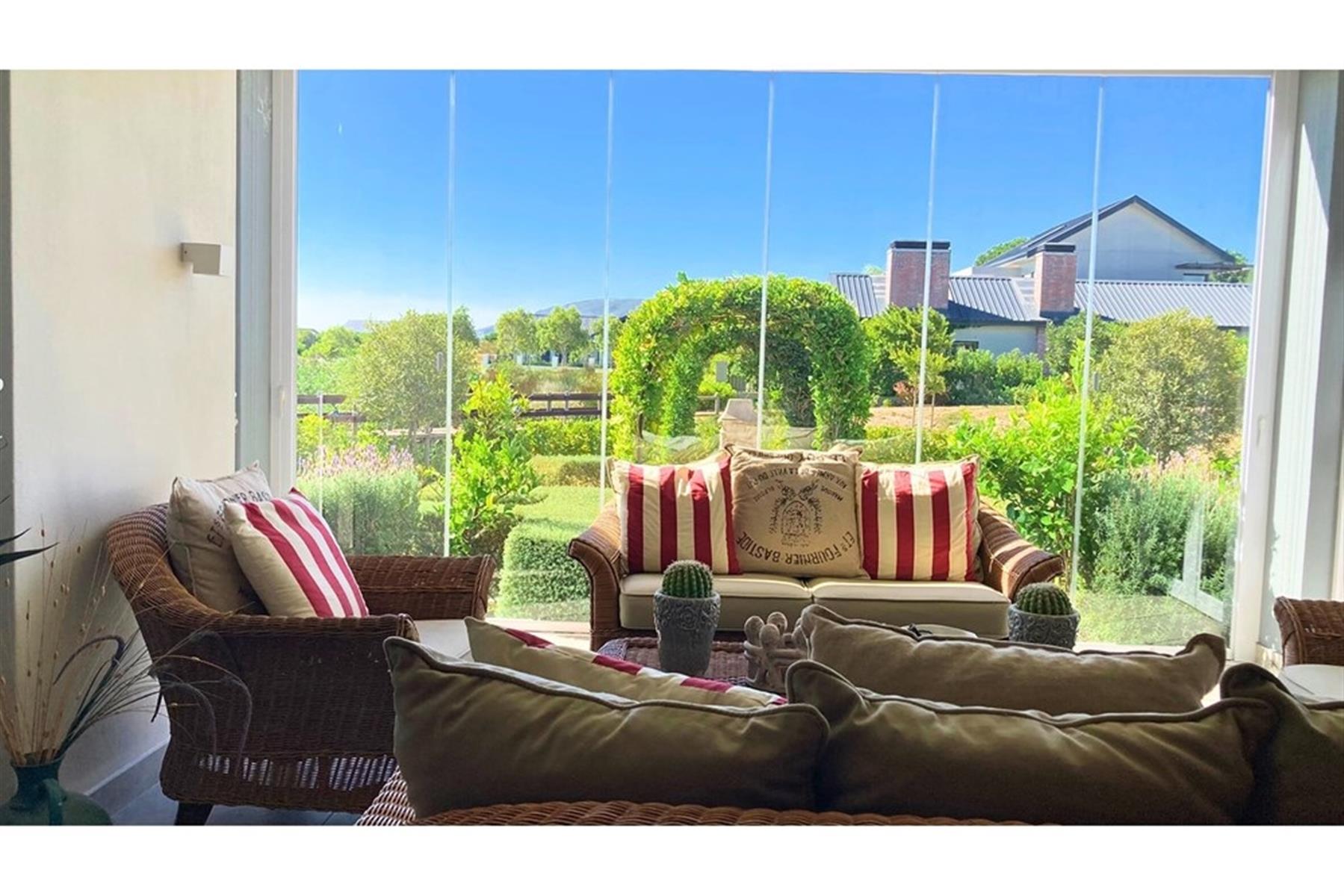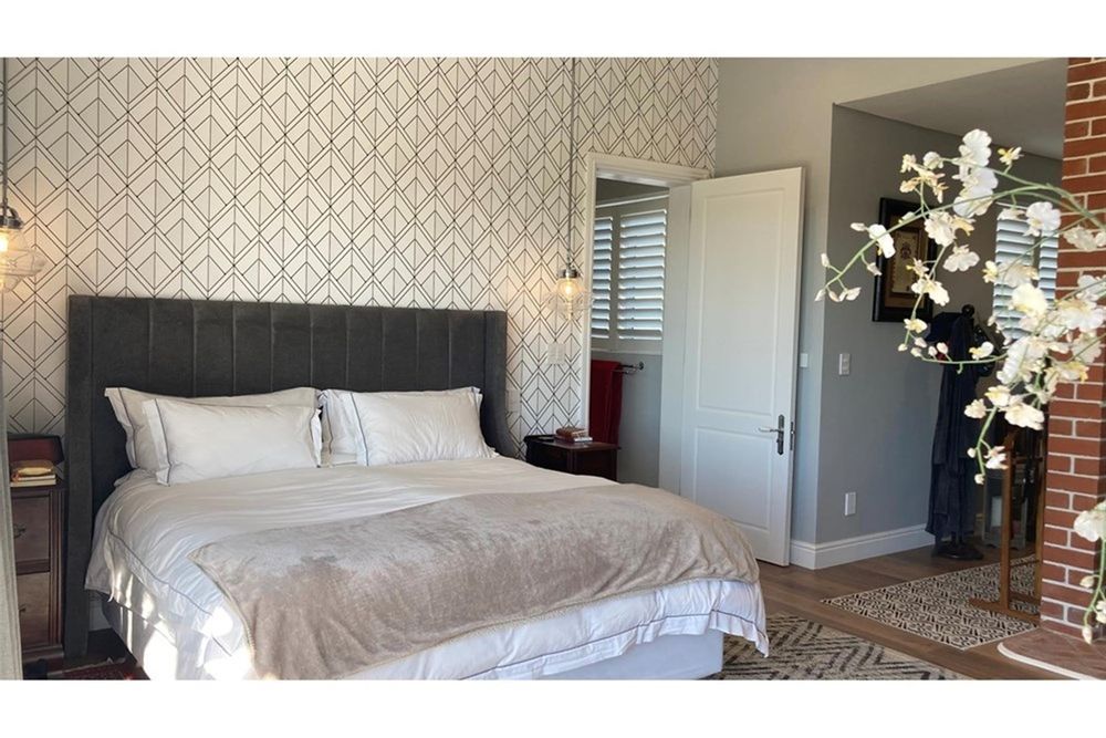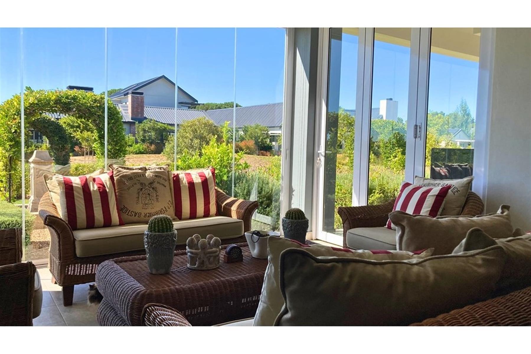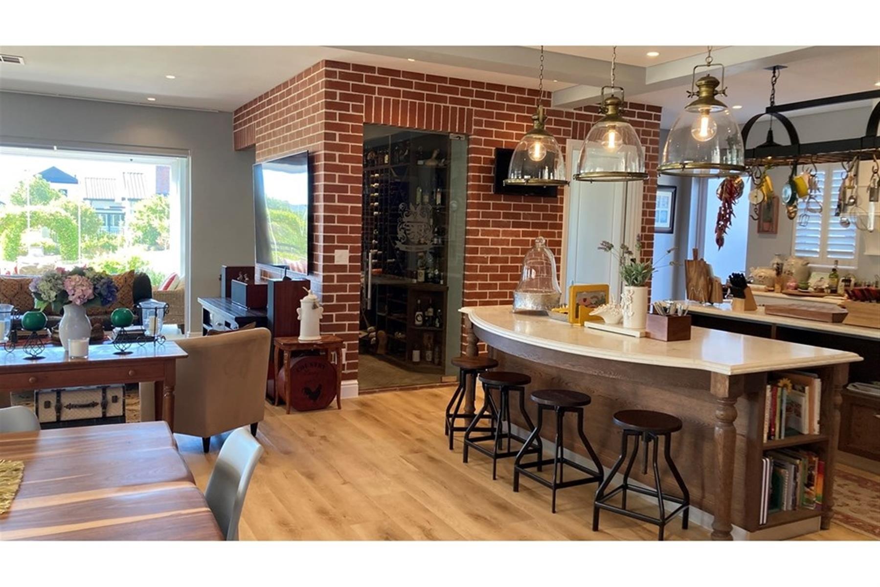 A wraparound balcony further enhances the peaceful ambiance, offering breathtaking views at every turn. The ground floor serves as both a sanctuary for everyday living and an entertainer`s dream. The Provincial Français-style kitchen is the heart of the home, equipped with a large pantry and scullery, and adjoins a remarkable wine cellar that separates the kitchen from the open-plan dining and living areas. These spaces flow effortlessly into a natural light-drenched enclosed patio and a custom-designed bar, with a convenient serving hatch connecting to the outdoor entertainment area. The private garden is ideal for family gatherings, complete with a sparkling pool, built-in braai, and firepit area.