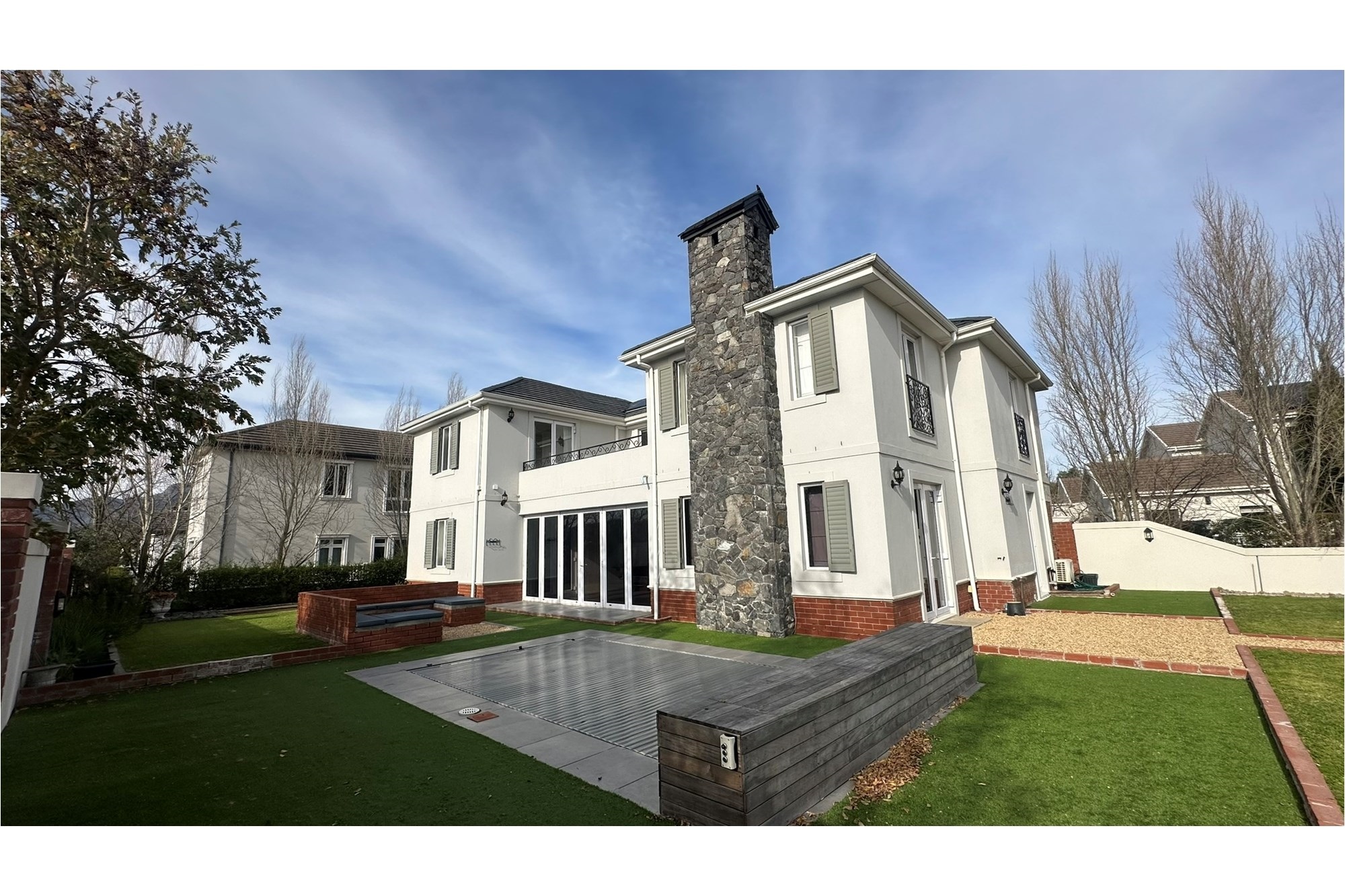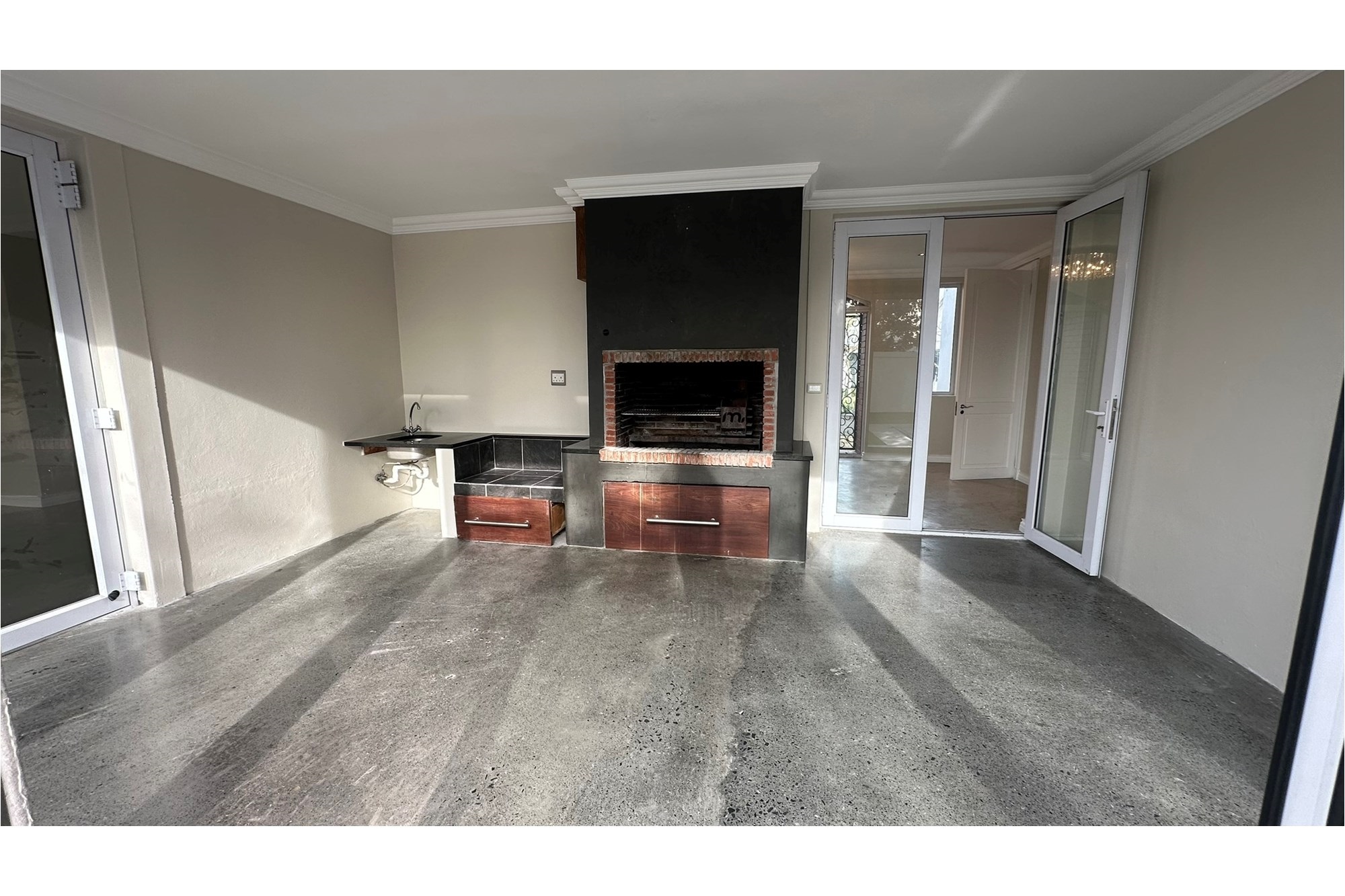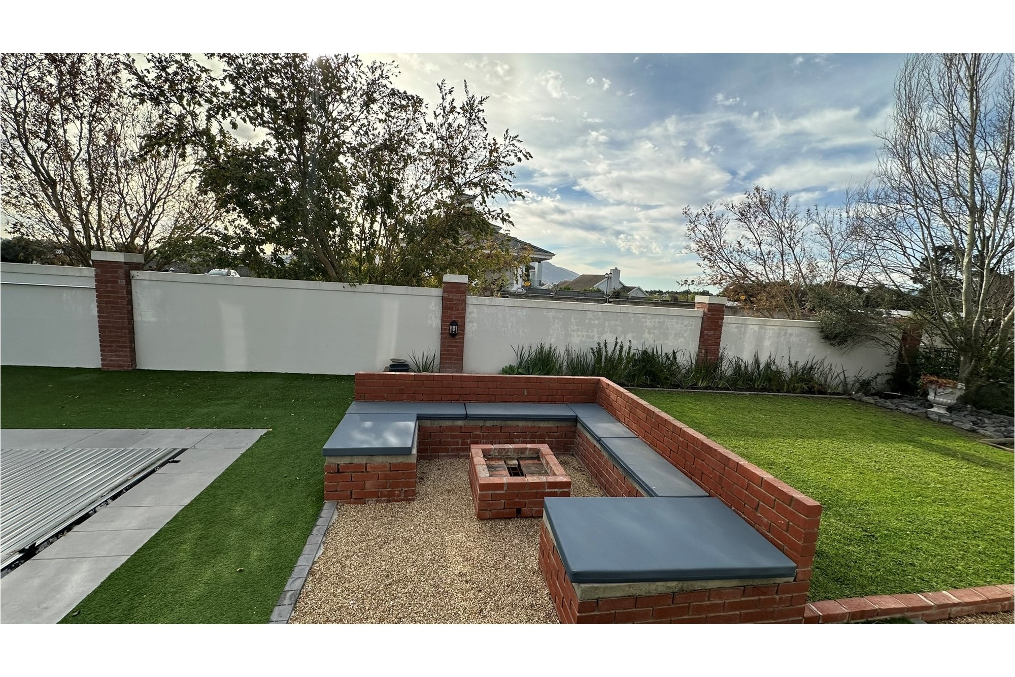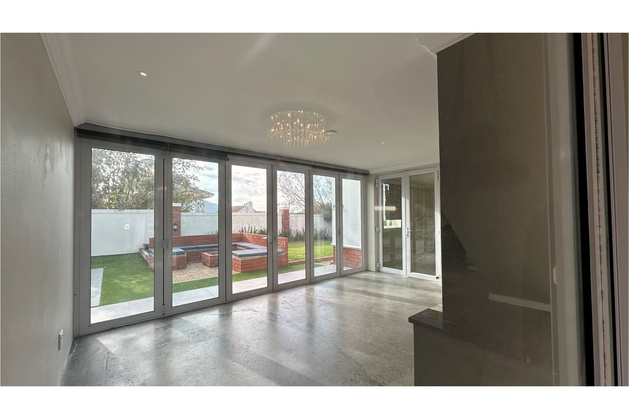The open-plan dining area flows seamlessly into an exceptional entertainment space. Here, stacking doors unveil a landscaped garden with a sparkling pool, a firepit, and a built-in braai. In cooler months, enclose the area as a cozy sunroom, or open it fully in summer for a breezy patio experience—perfect for year-round gatherings.