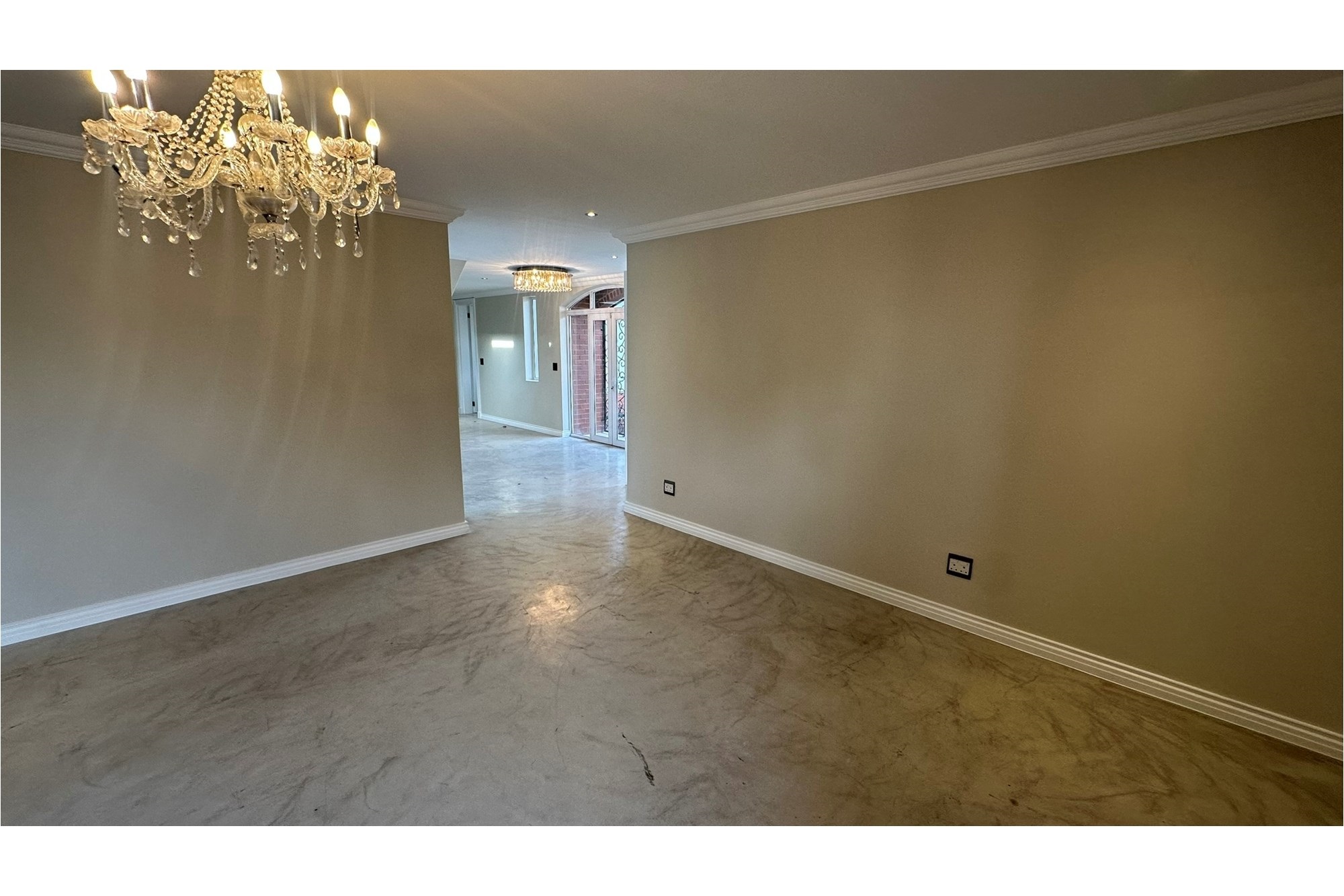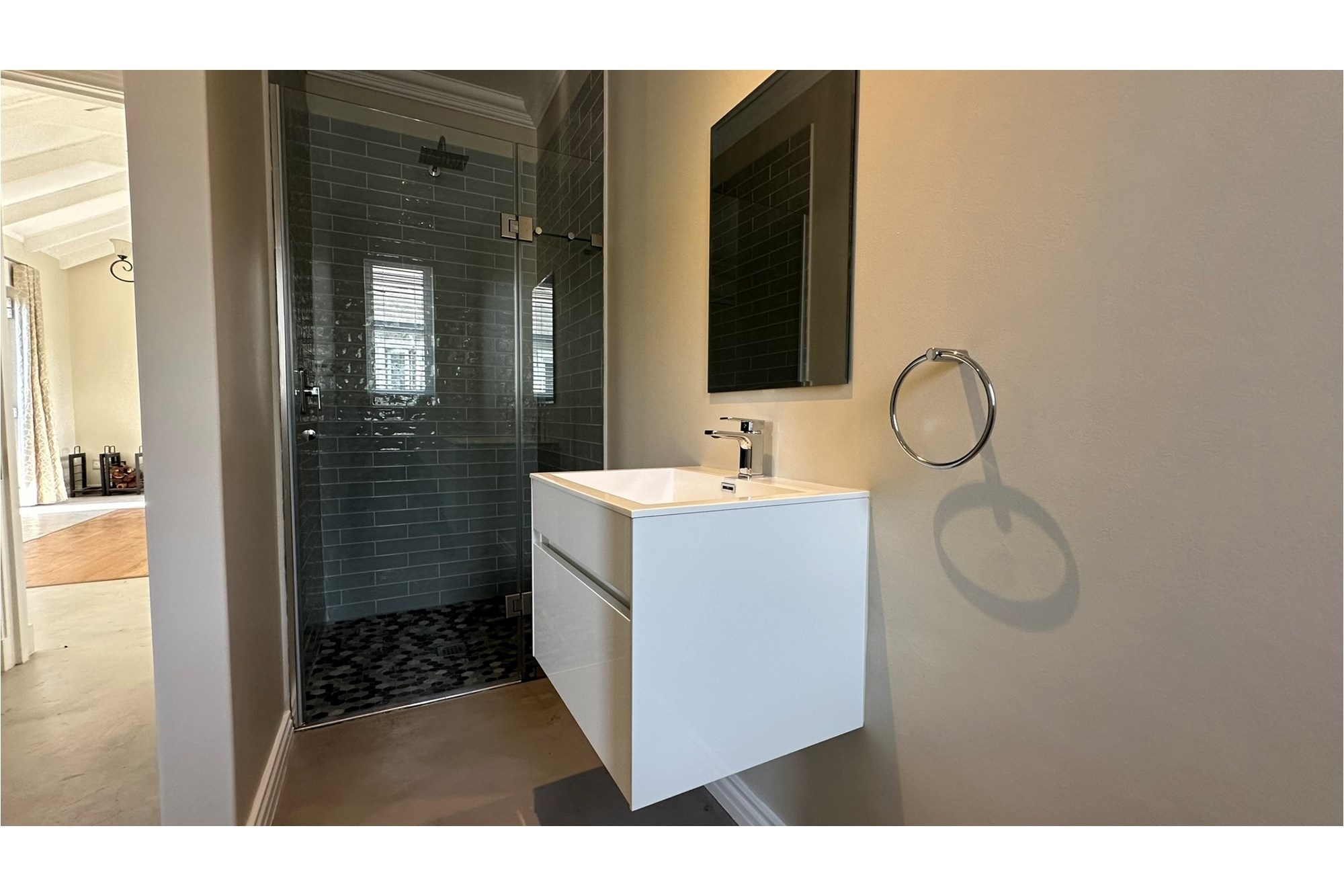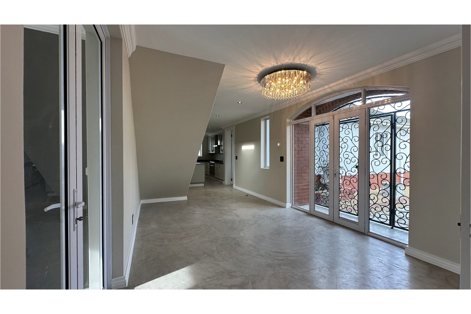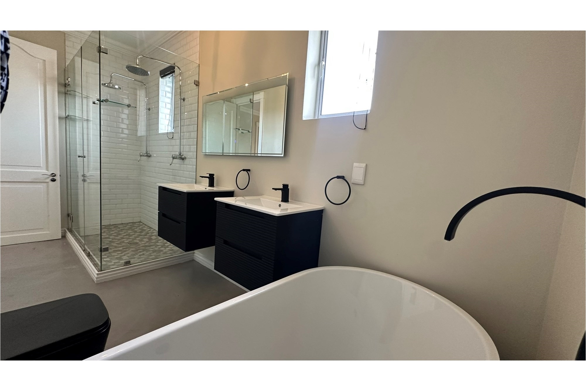 The open-plan dining area flows seamlessly into an exceptional entertainment space. Here, stacking doors unveil a landscaped garden with a sparkling pool, a firepit, and a built-in braai. In cooler months, enclose the area as a cozy sunroom, or open it fully in summer for a breezy patio experience—perfect for year-round gatherings.