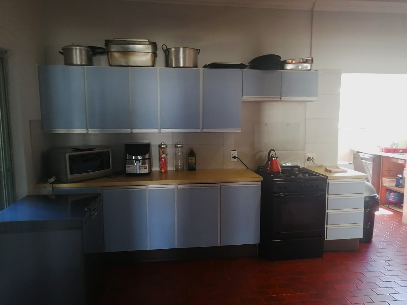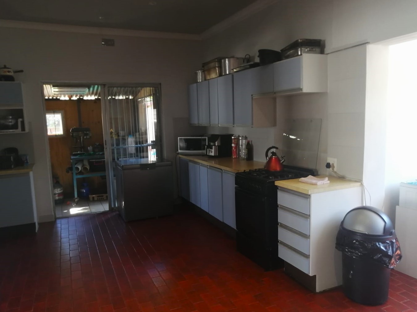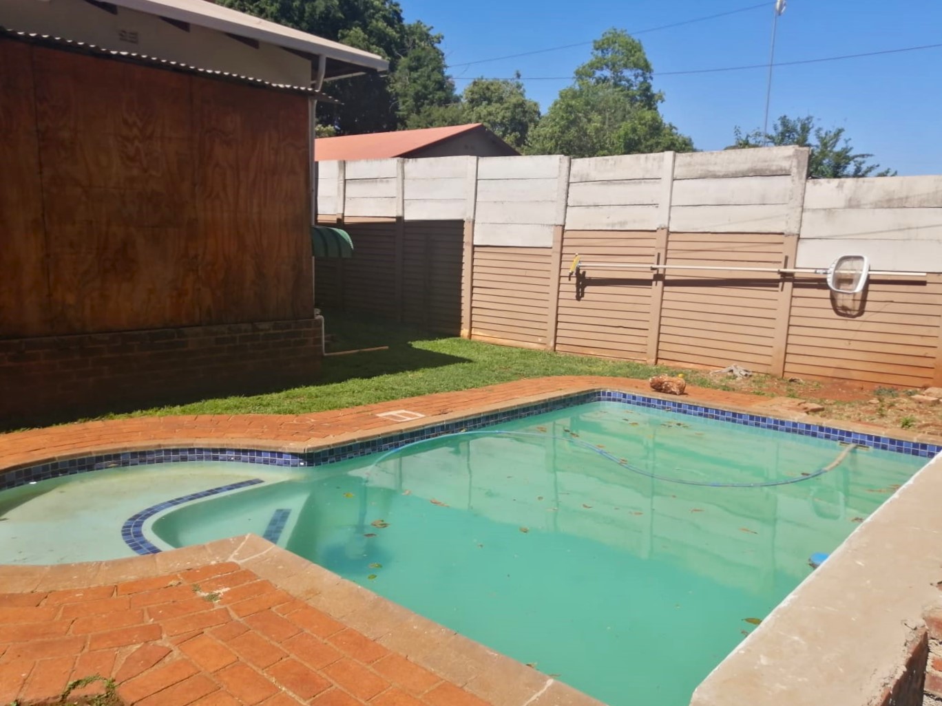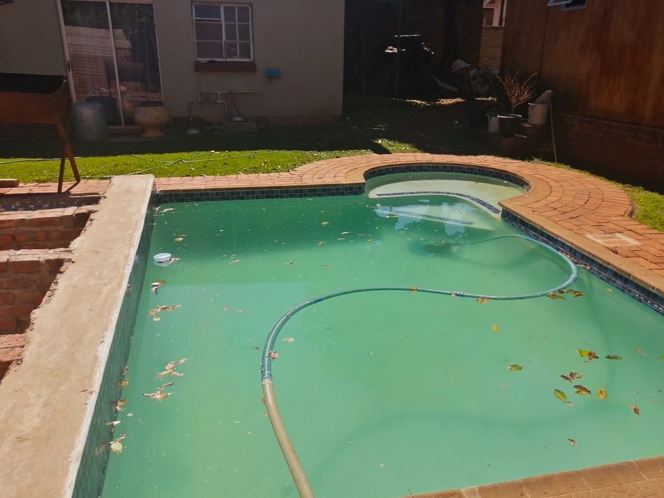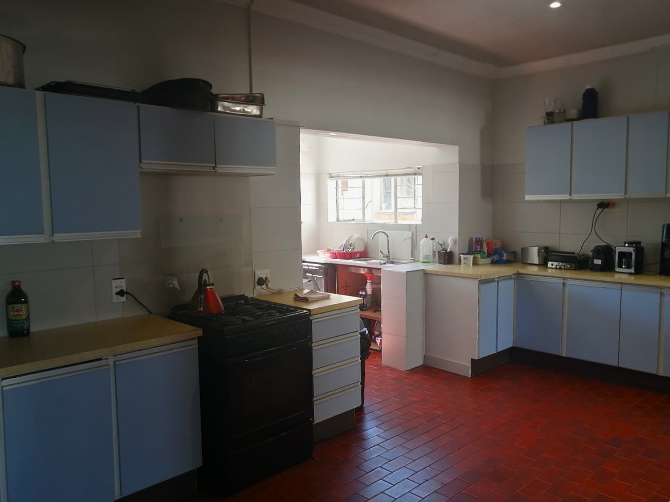 Open plan kitchen with a scullery, back yard, with a swimming pool.