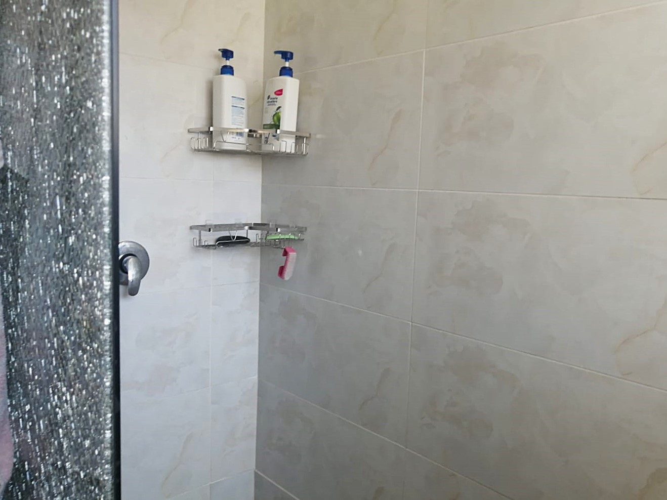 The second bathroom has a shower, basin and toilet.
