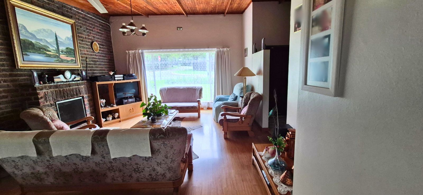 - Large lounge and dining room with elegant laminated wood flooring.