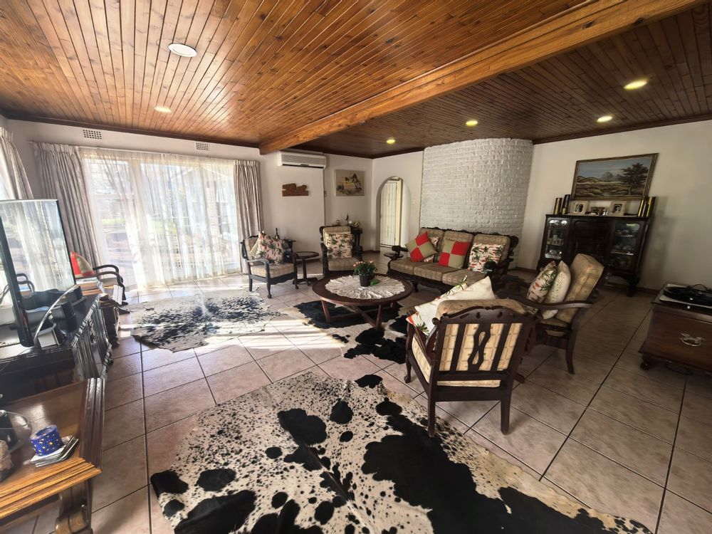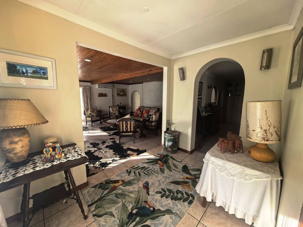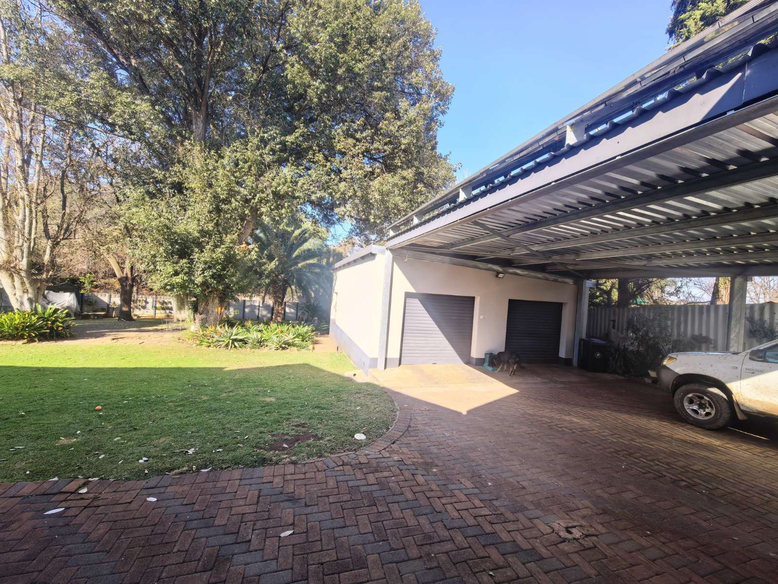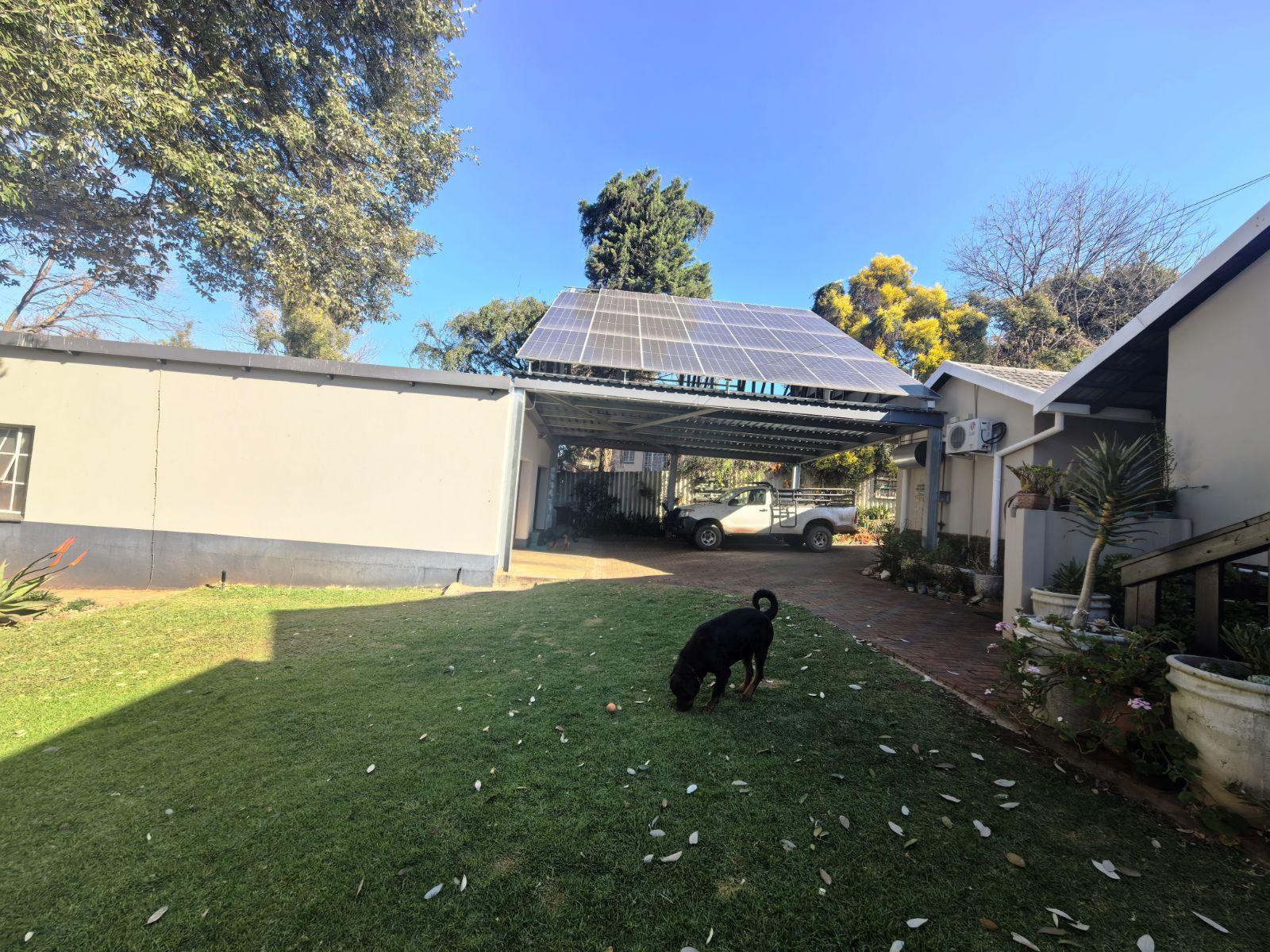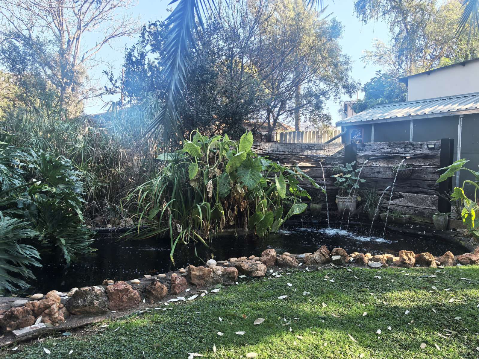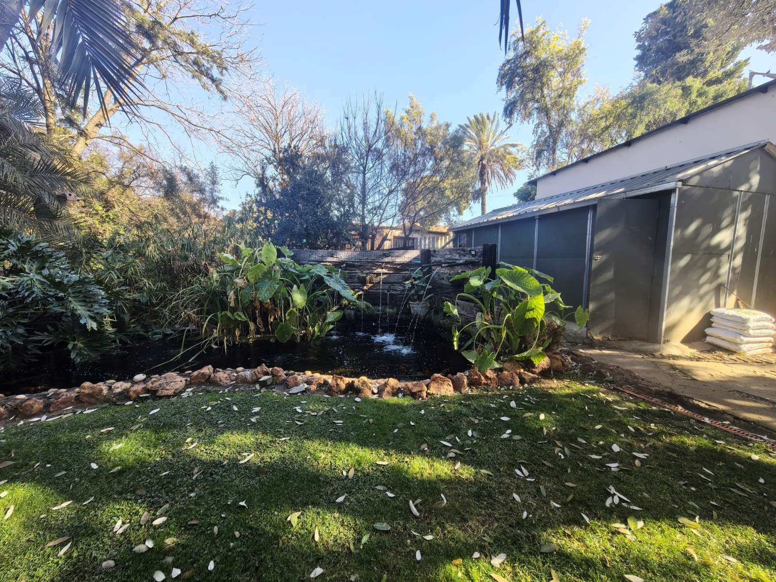 The entertainment area features a built-in bar and flows out to a private patio with weather sails and a built-in braai, creating the perfect setting for year-round social gatherings. The lush garden with mature trees surrounds a sparkling swimming pool (fitted with a safety net) and a lapa, offering a tranquil outdoor retreat. Parking is ample with four garages and a carport accommodating up to five vehicles. Ideally located near major routes, shopping centres, and all essential amenities, the property also boasts a solar system and borehole for added efficiency and sustainability.