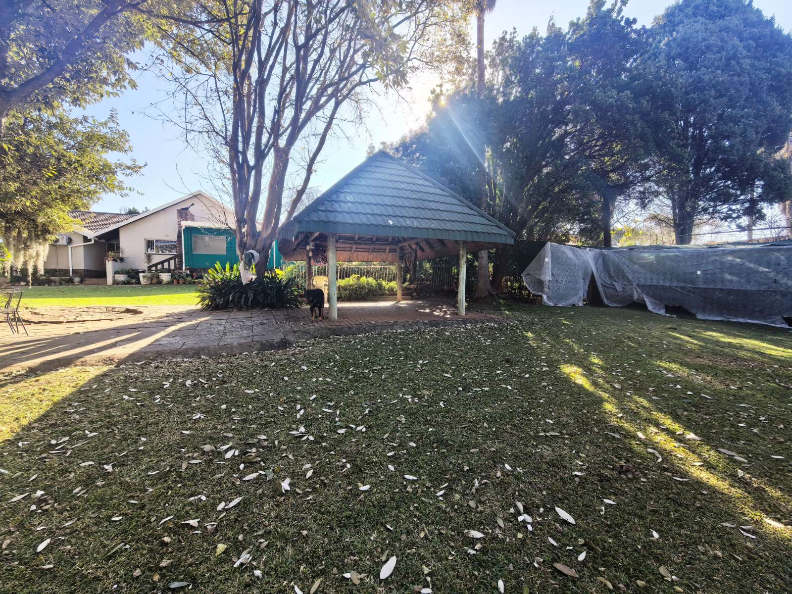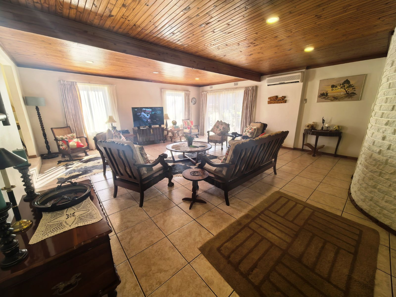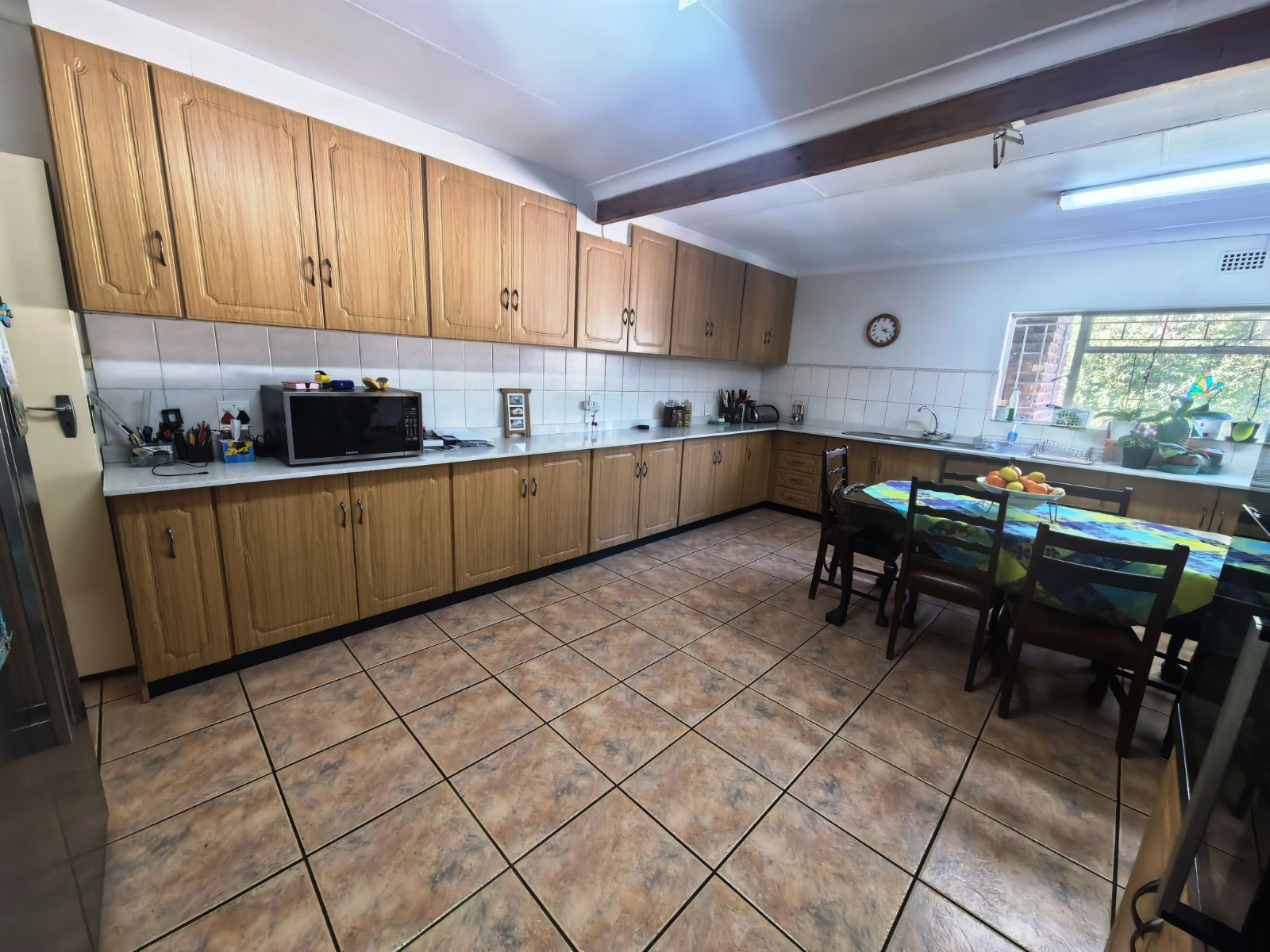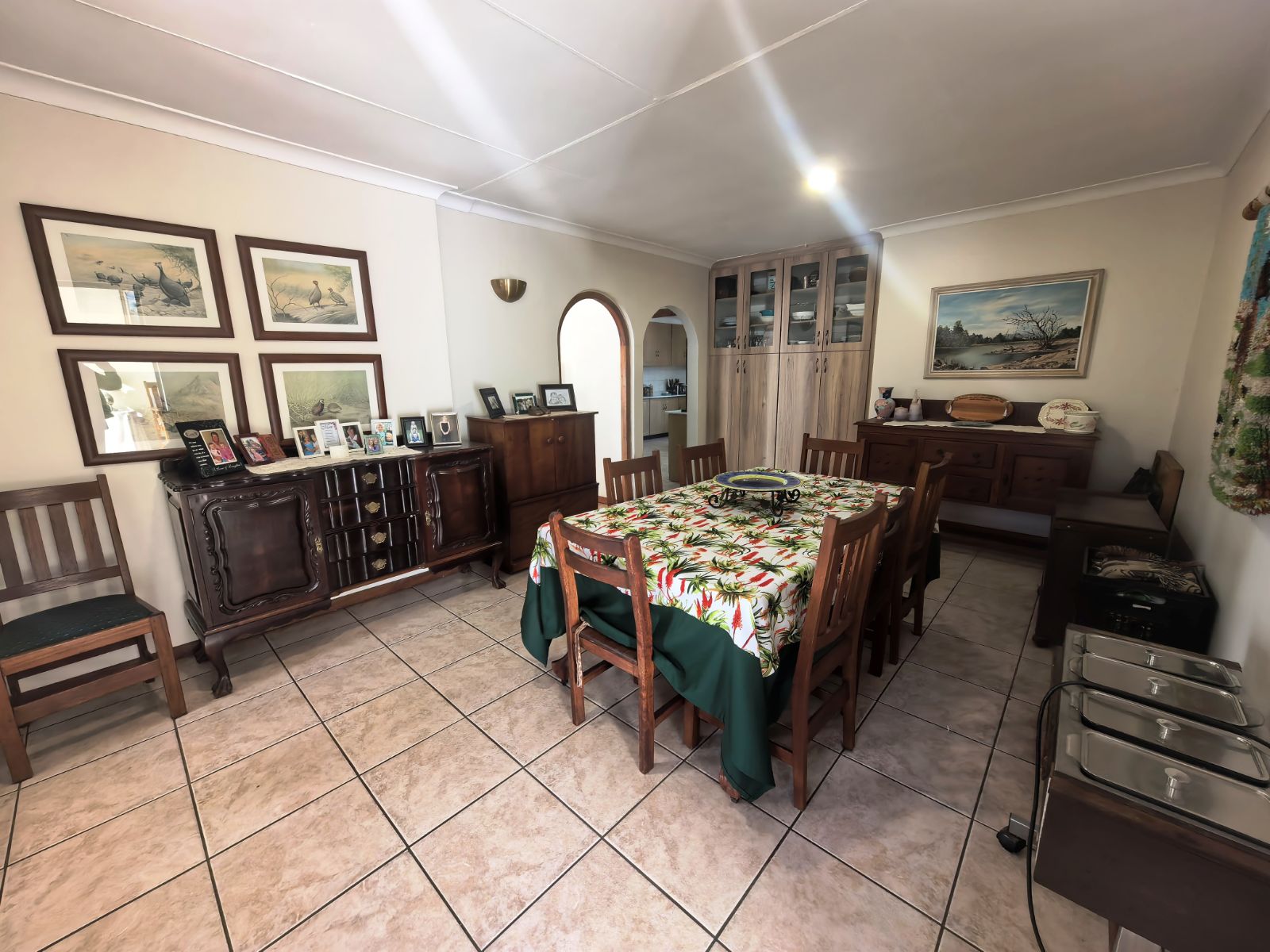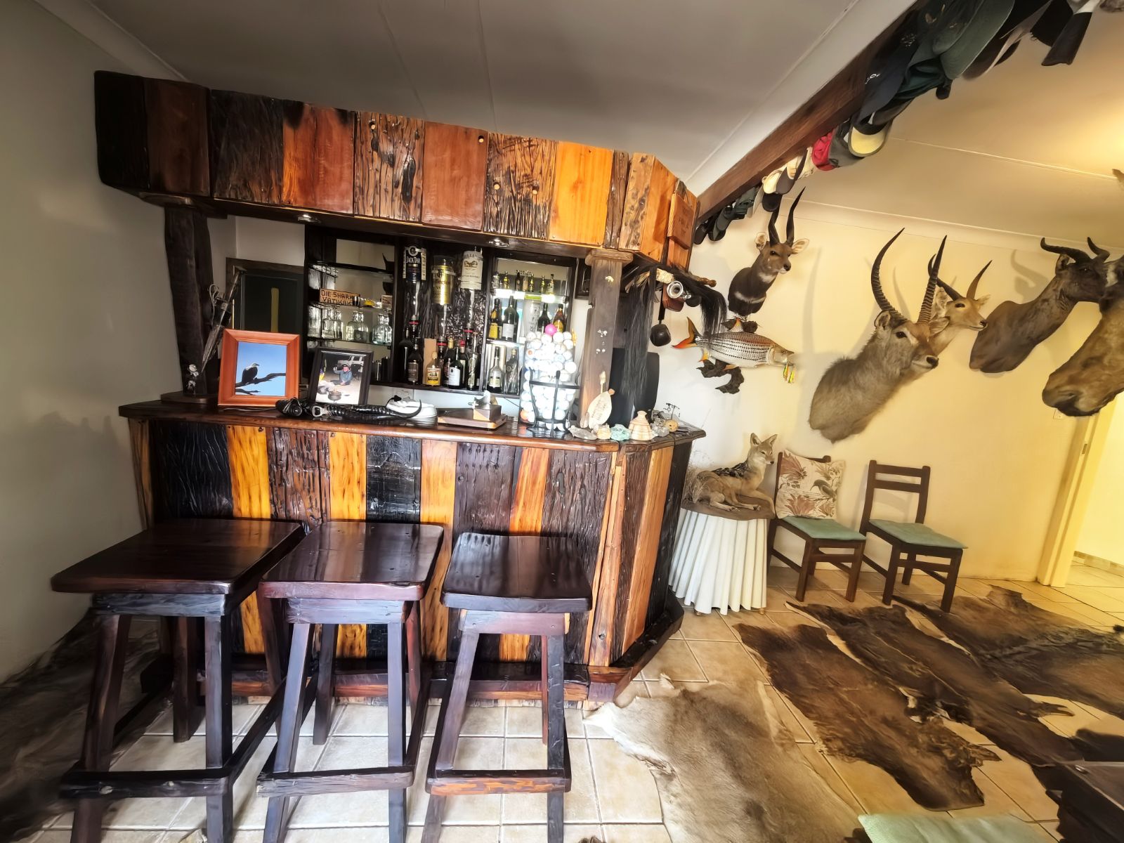 The entertainment area features a built-in bar and flows out to a private patio with weather sails and a built-in braai, creating the perfect setting for year-round social gatherings. The lush garden with mature trees surrounds a sparkling swimming pool (fitted with a safety net) and a lapa, offering a tranquil outdoor retreat. Parking is ample with four garages and a carport accommodating up to five vehicles. Ideally located near major routes, shopping centres, and all essential amenities, the property also boasts a solar system and borehole for added efficiency and sustainability.