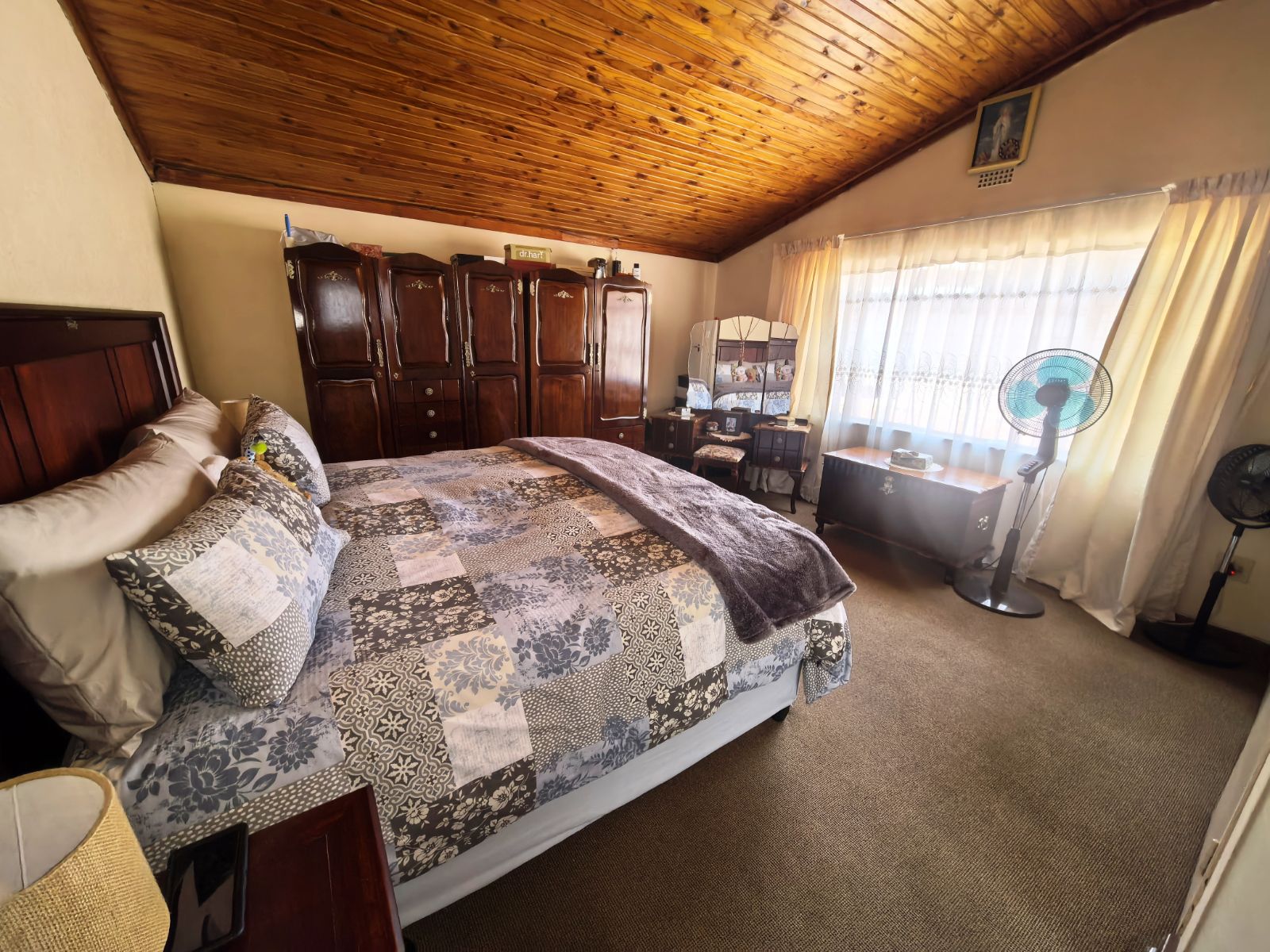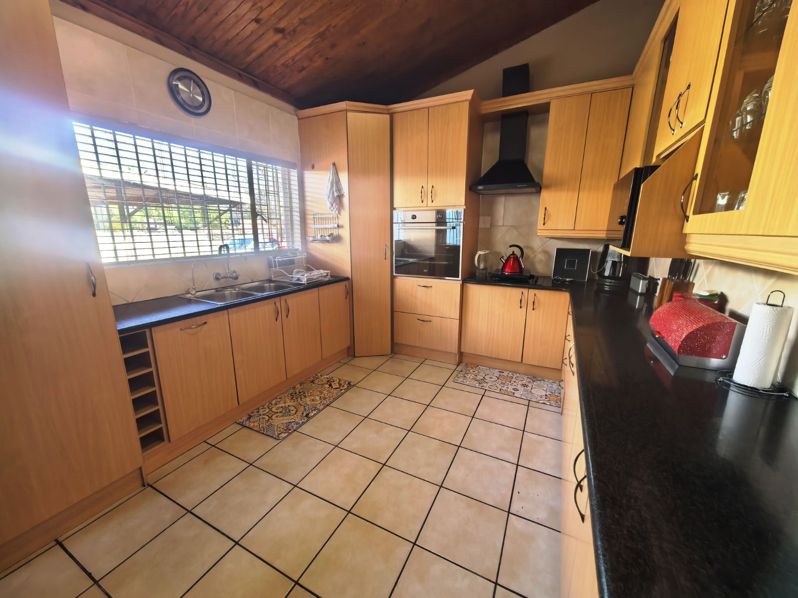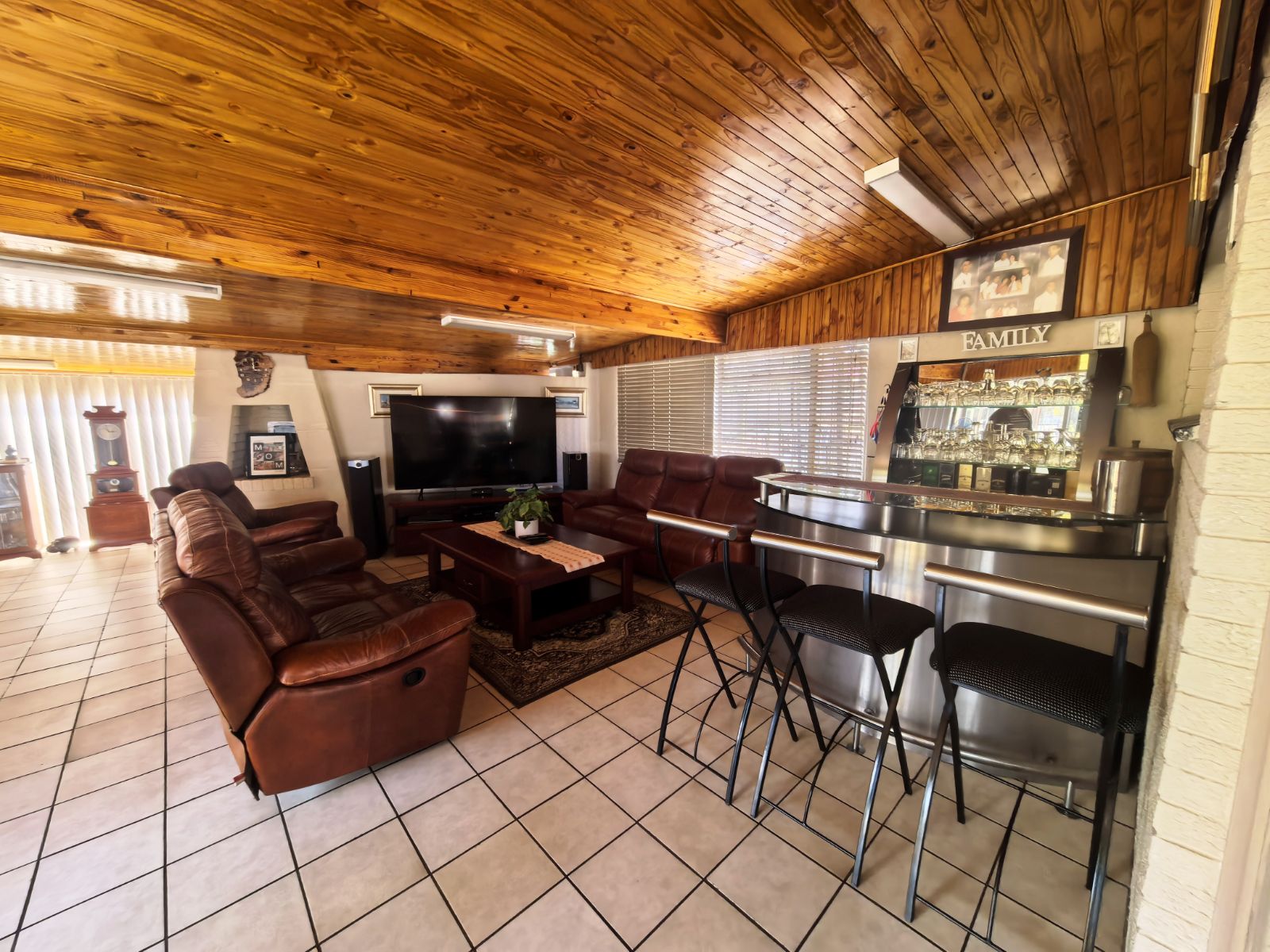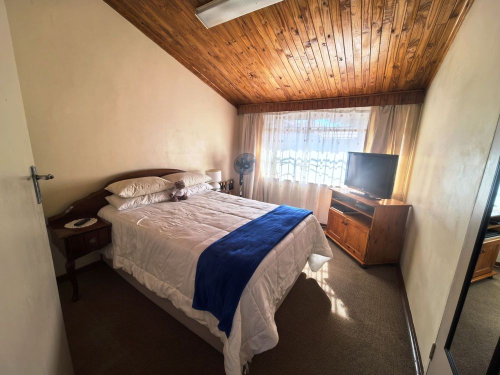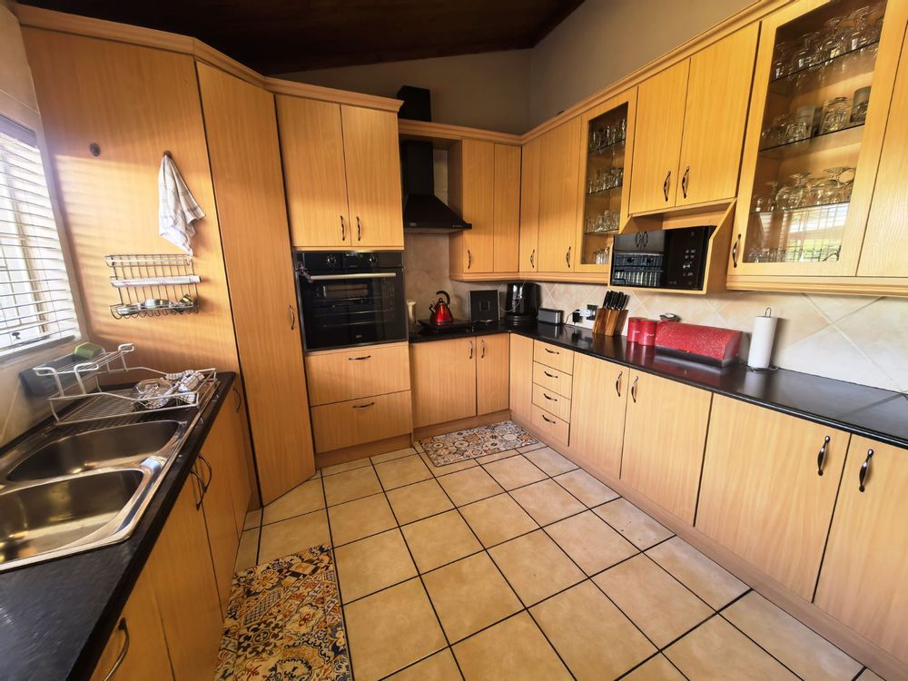 The kitchen is well-appointed with ample cupboard space, ideal for family cooking and gatherings. Accommodation includes three well-sized bedrooms, complemented by two bathrooms, with the main en-suite featuring a full bathroom. Parking is a breeze with a double garage as well as a double carport,