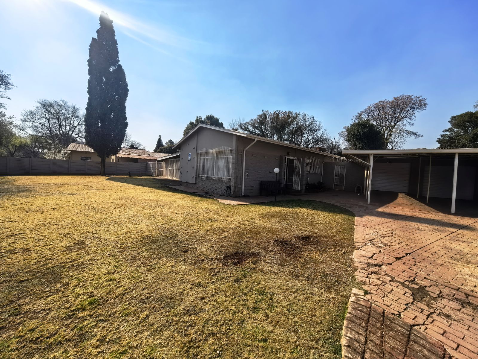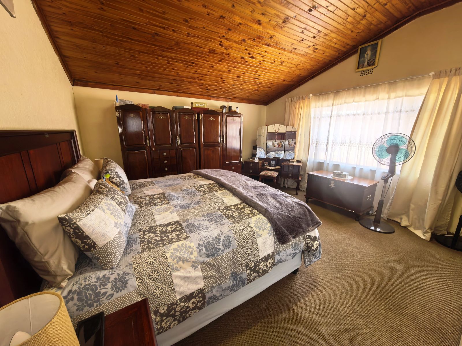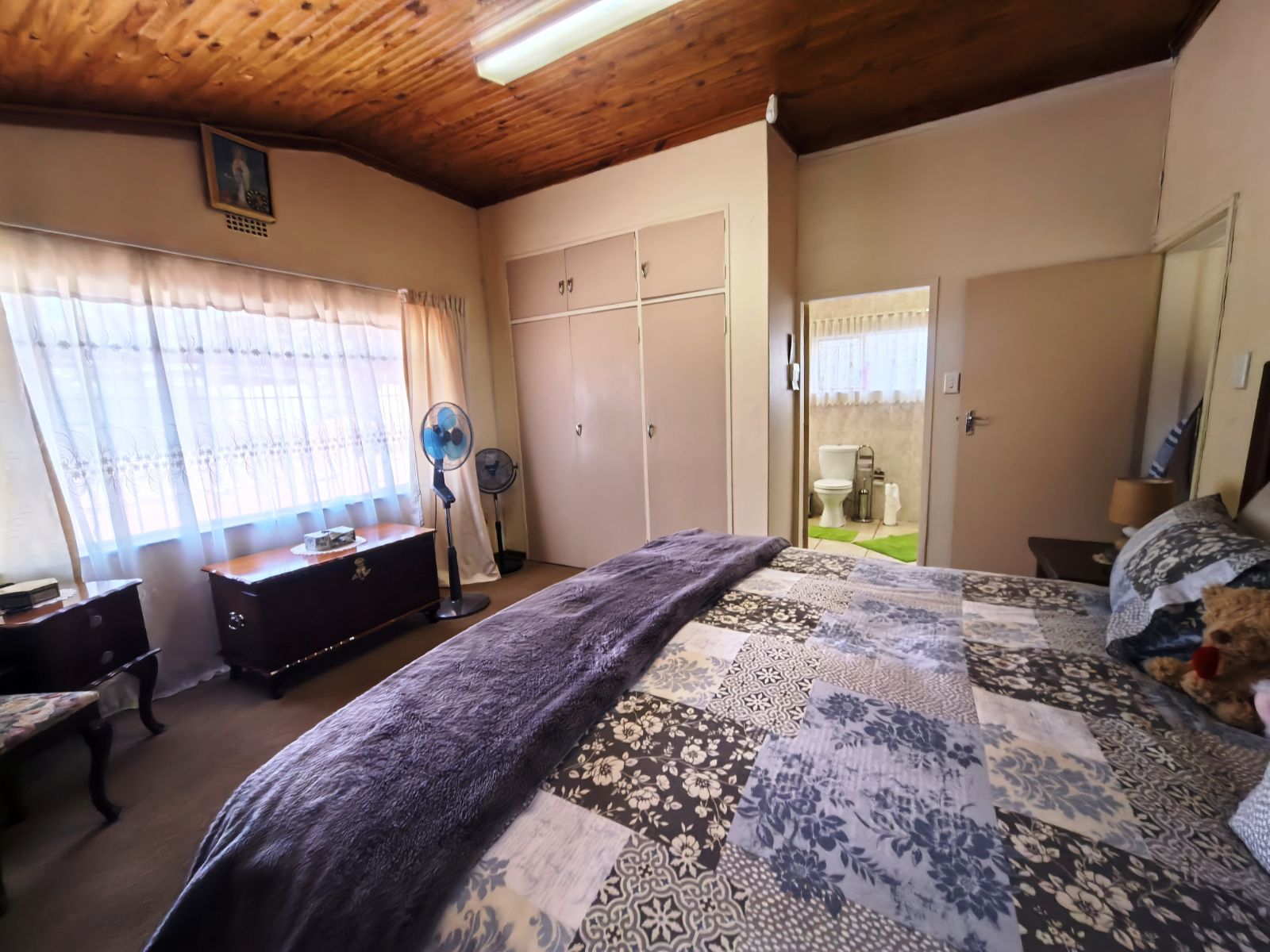 The kitchen is well-appointed with ample cupboard space, ideal for family cooking and gatherings. Accommodation includes three well-sized bedrooms, complemented by two bathrooms, with the main en-suite featuring a full bathroom. Parking is a breeze with a double garage as well as a double carport,