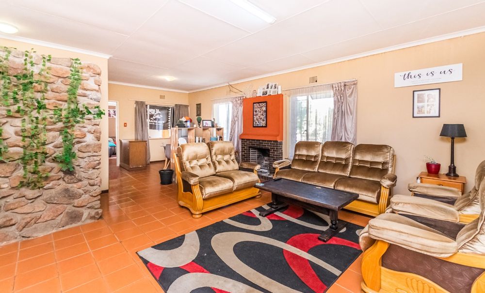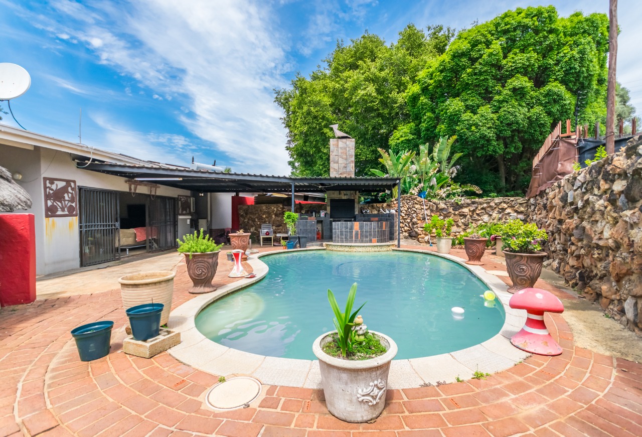 The home boasts a large open-plan kitchen that seamlessly flows into the spacious living area, creating a welcoming environment for everyday living and family gatherings. The living area opens directly onto an outdoor entertainment space, complete with a built-in braai and swimming pool, making it ideal for hosting guests or enjoying leisure time with family.