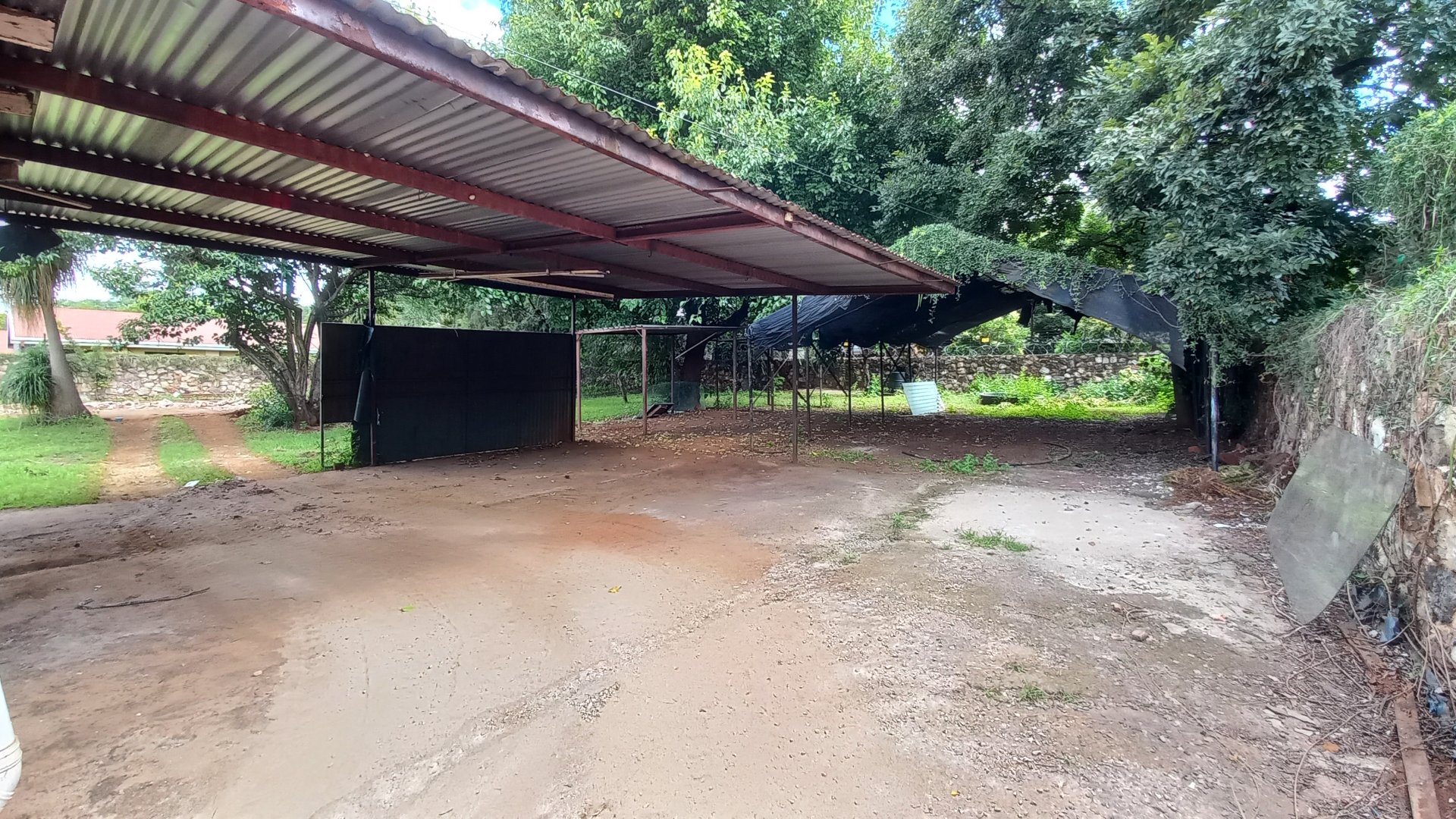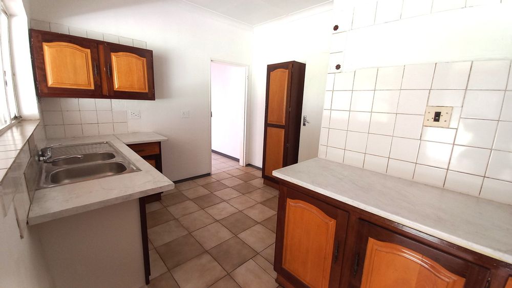 The main house consists of three bedrooms and one bathroom, with the bathroom and toilet conveniently separated. There is a very spacious lounge area and a kitchen, which leads to a built-in stoep area used for laundry, as well as an additional enclosed stoep room for extra living or storage space.