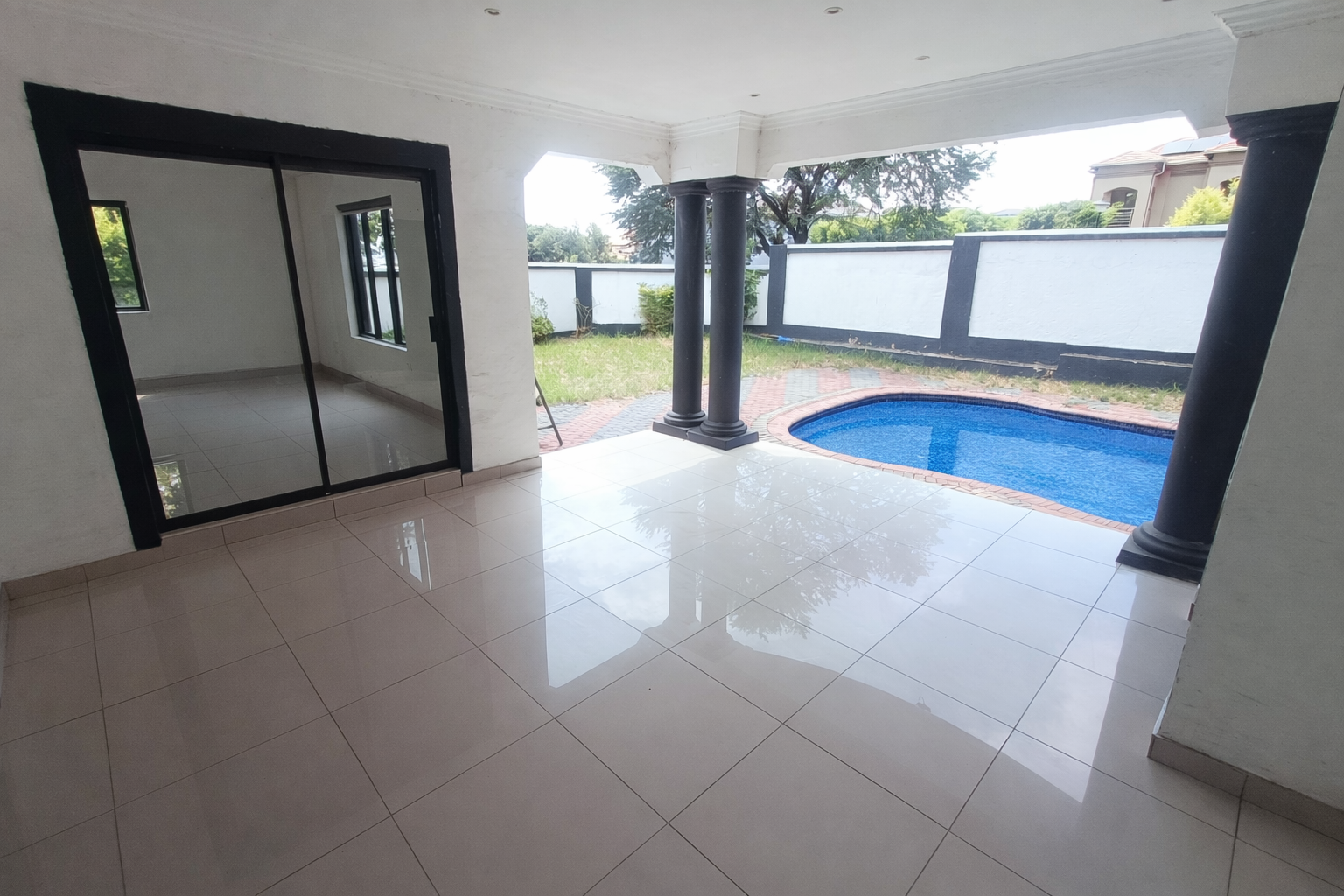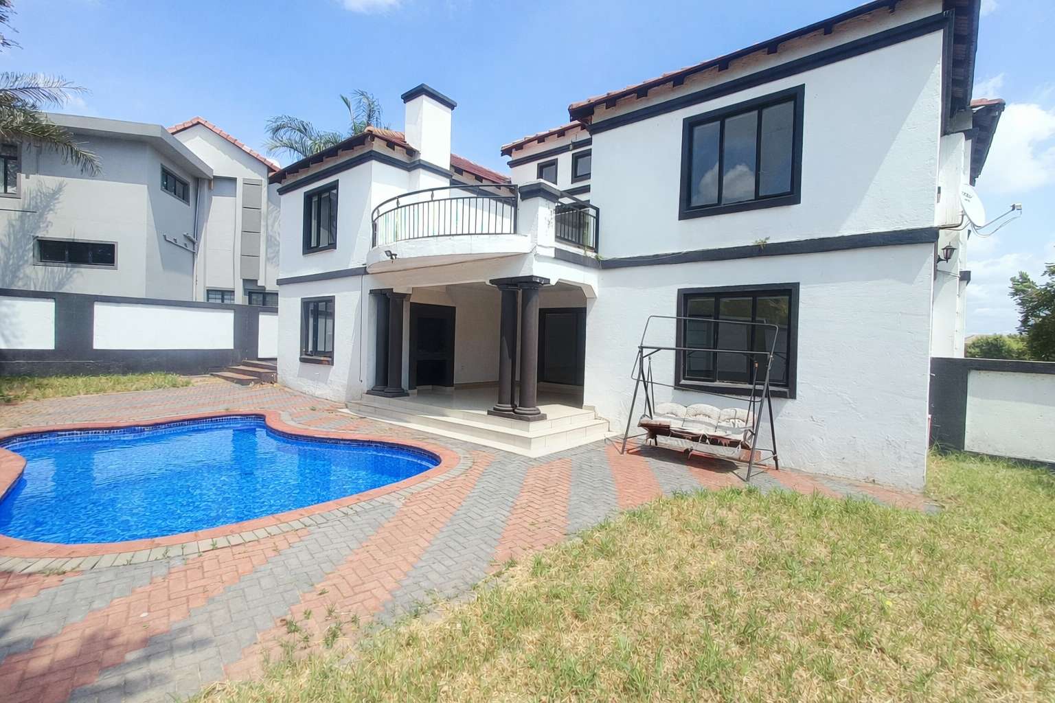The home embraces indoor-outdoor living, with all spaces opening onto a beautifully landscaped garden. An extended balcony with a built-in braai (barbecue) provides the perfect setting for family gatherings and social occasions, offering a seamless blend of comfort and style with a swimming pool.