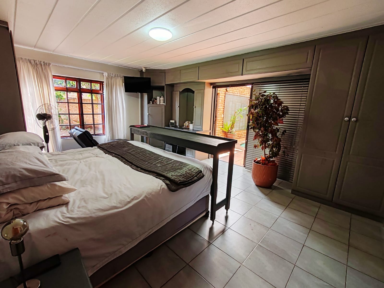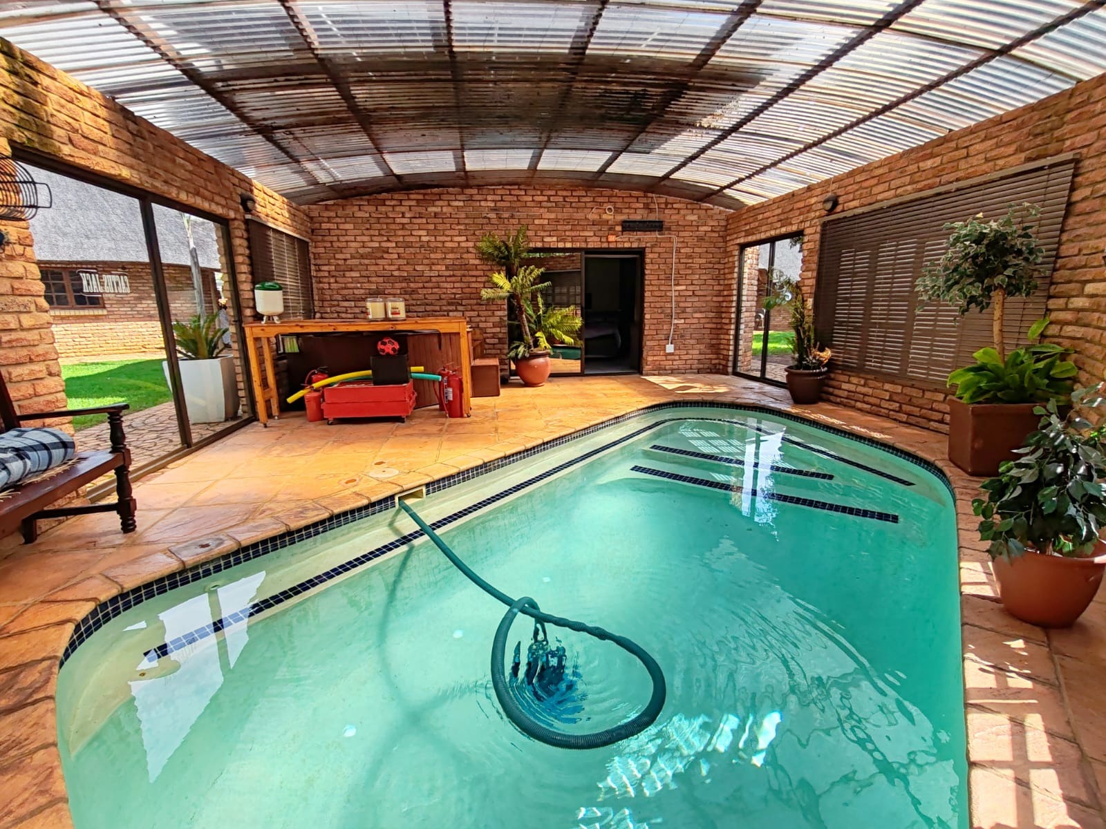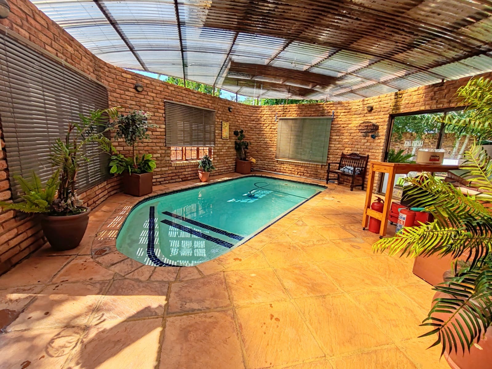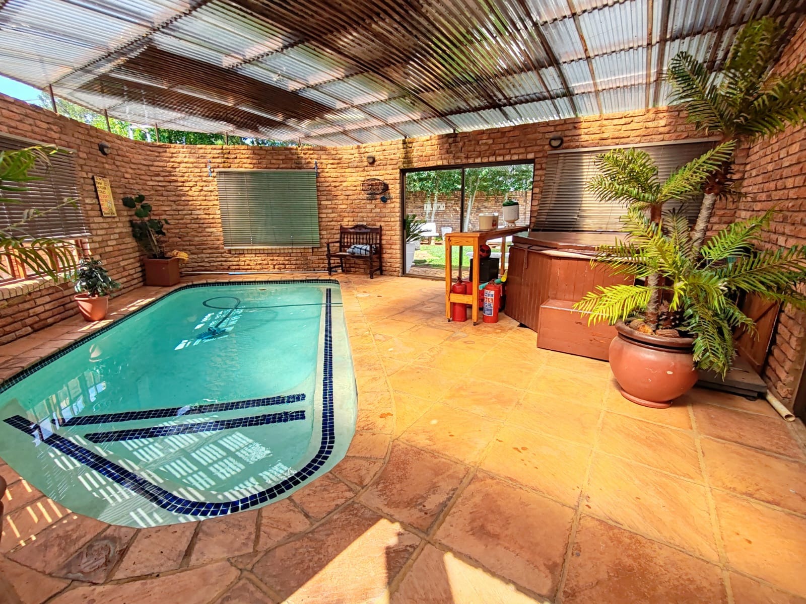 Outside, a world of leisure awaits. Unwind on the spacious patio with a built-in braai, heated swimming pool and take relaxation to the next level in your private jacuzzi. The generous garden, with a borehole-fed irrigation system, ensures lush greenery all year round.