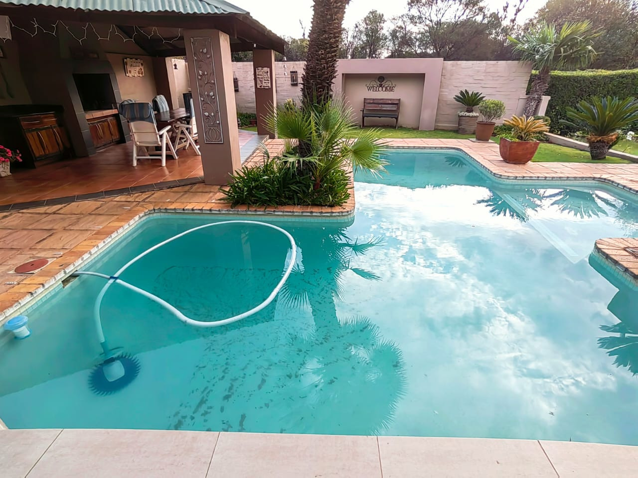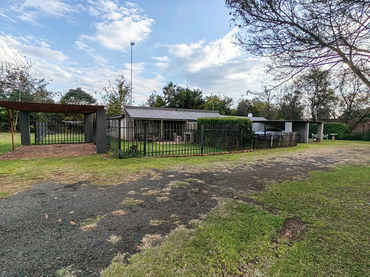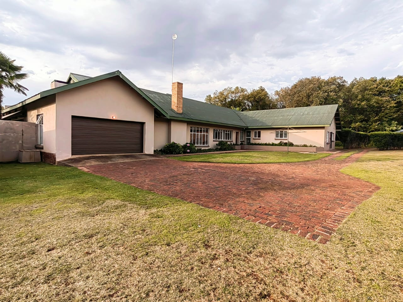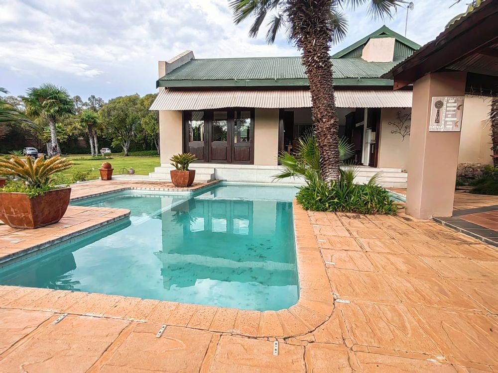 The house offers 5 spacious bedrooms, 3 bathrooms, dining room, 2 living rooms, a family room, a kitchen with a separate scullery, spacious braai area overlooking the swimming pool. 2 Garages, 2 carports, staff quarters, storage room and a massive warehouse.