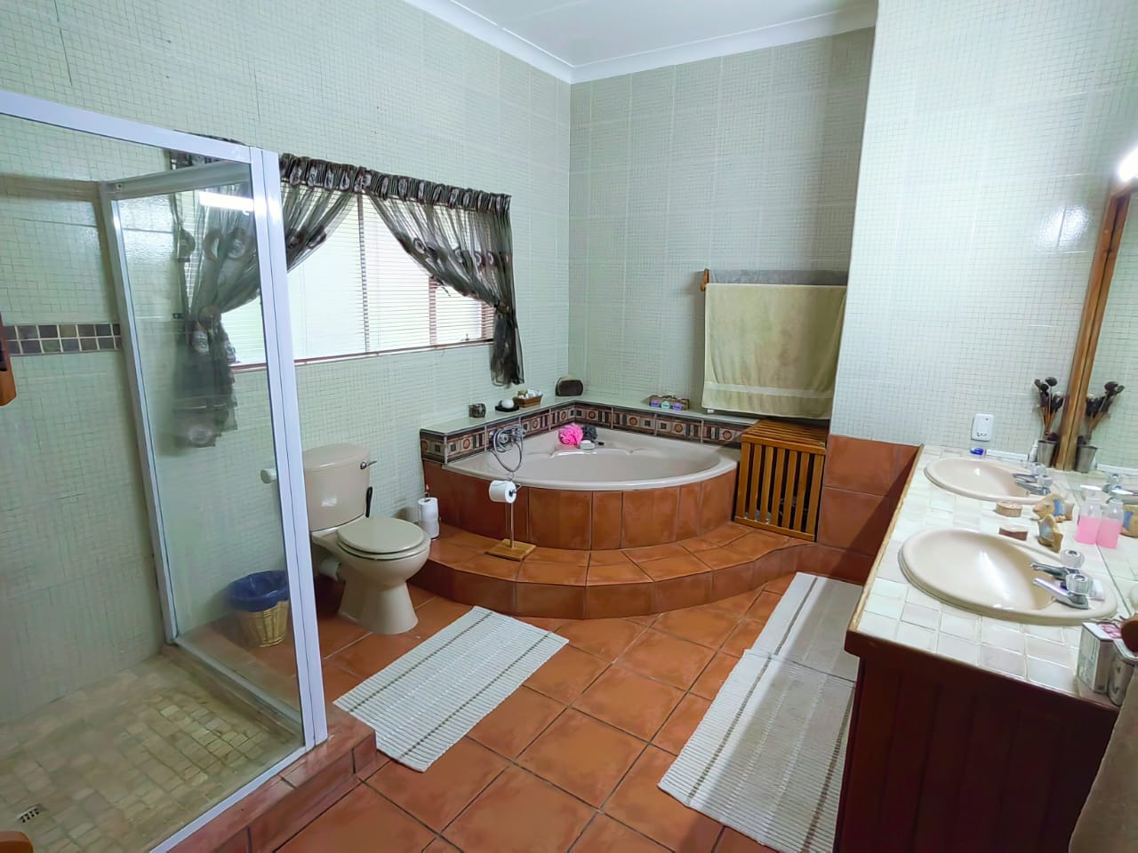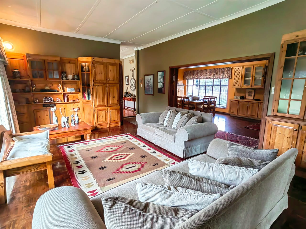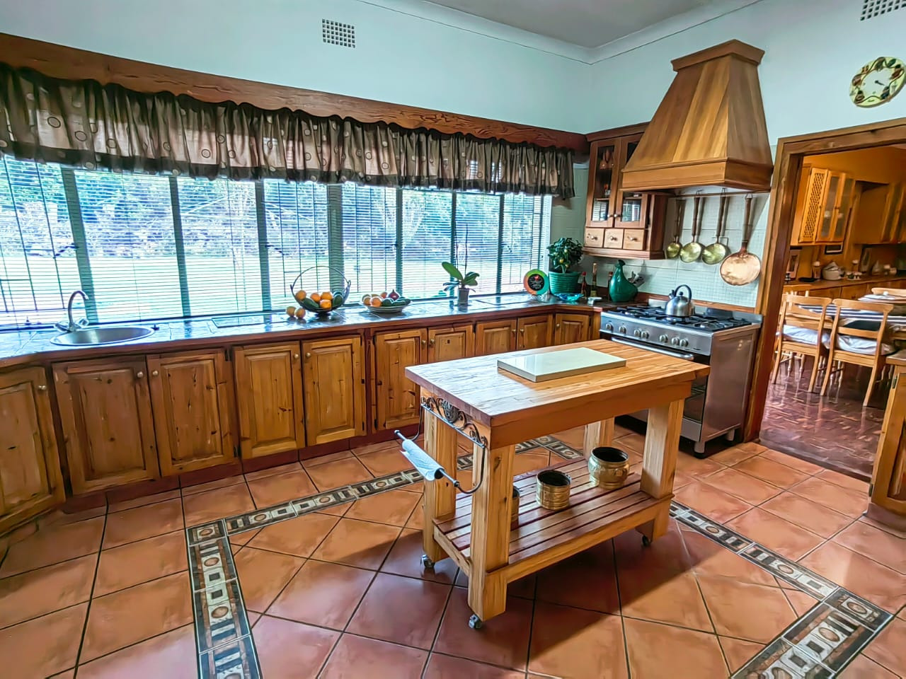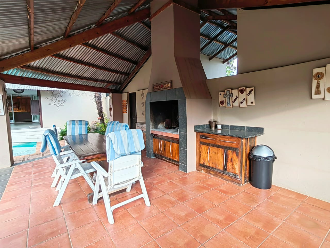 The house offers 5 spacious bedrooms, 3 bathrooms, dining room, 2 living rooms, a family room, a kitchen with a separate scullery, spacious braai area overlooking the swimming pool. 2 Garages, 2 carports, staff quarters, storage room and a massive warehouse.