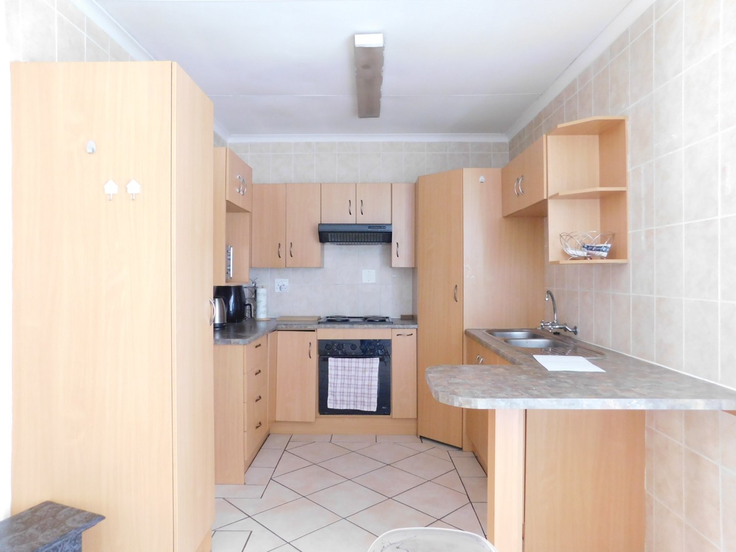 The home features a bright, open-plan tiled lounge filled with natural light, creating a warm and welcoming atmosphere. The well-equipped kitchen includes ample cupboard space, stylish wooden countertops, a built-in stove and oven, and space for both a refrigerator and dishwasher.