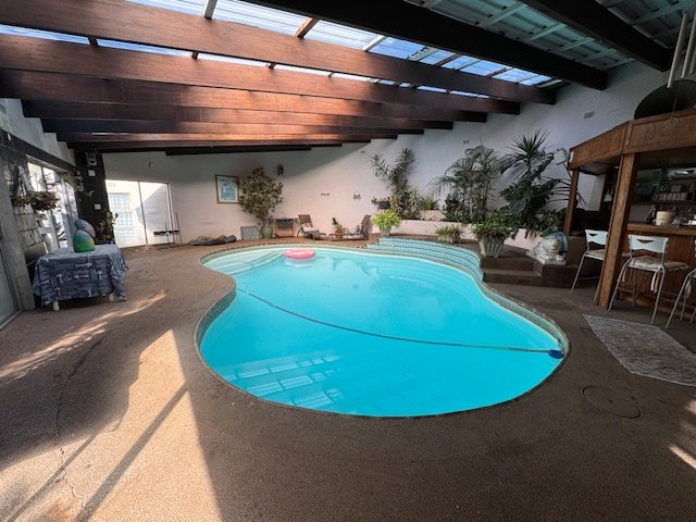 One bedroom boasts an en-suite bathroom, while two additional bathrooms and two guest loos offer convenience for the household and visitors. Five built-in cupboards provide essential storage. Outdoor living is elevated with a sparkling pool, ideal for summer days.