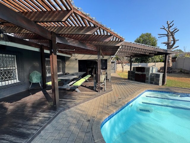 Outside, a sparkling pool offers the perfect retreat on sunny days. The property includes staff quarters for added functionality and three covered carports for ample parking. This home blends comfort, practicality, and lifestyle, ideal for family living.
