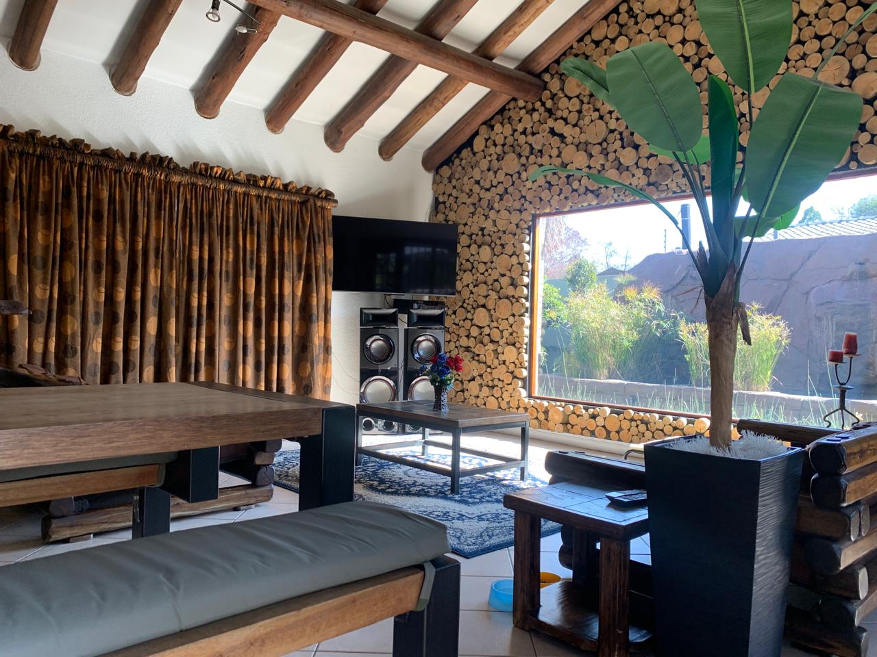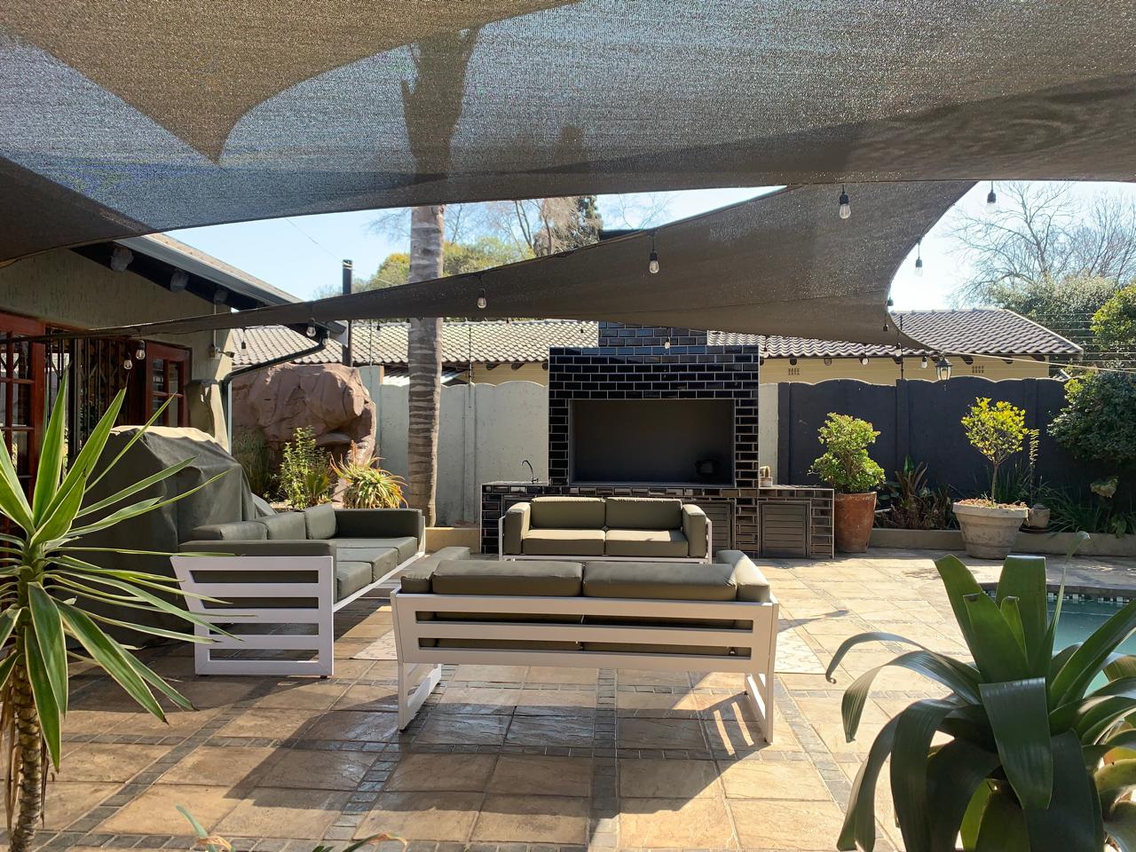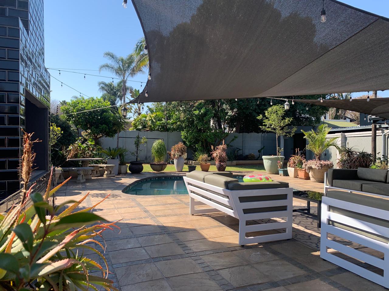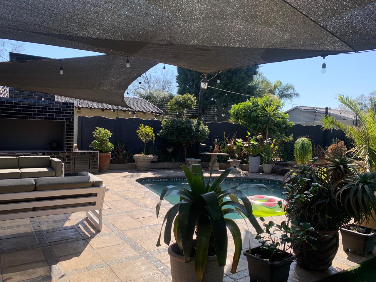 Step outside through the sliding doors to discover a serene garden oasis. The outdoor space is perfect for family gatherings or quiet relaxation, featuring a lovely pool and ample yard space for children to play. An outdoor fireplace adds an extra layer of charm, making it ideal for braai and entertaining under the stars.