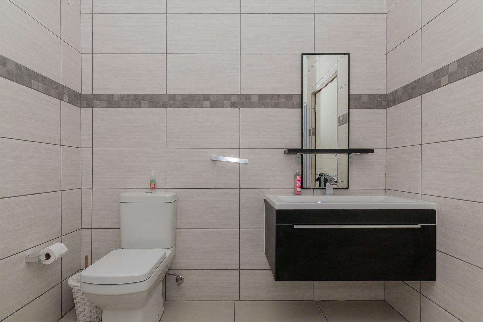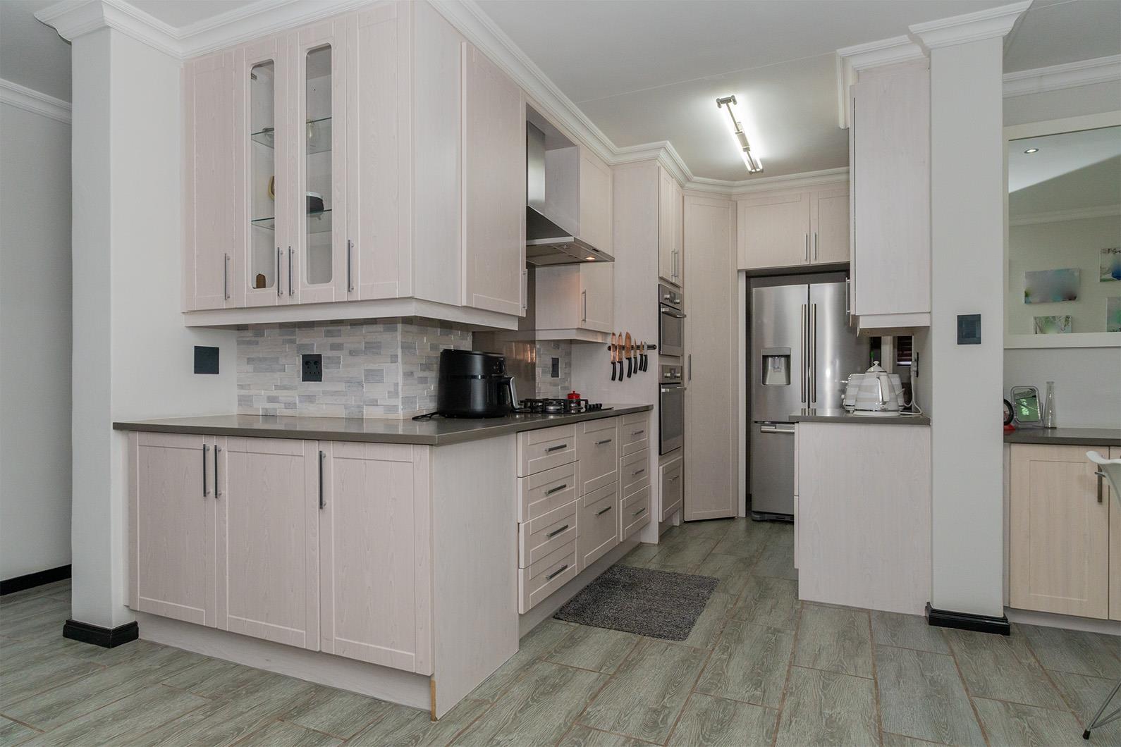 The gourmet kitchen is both stylish and functional, with Caesarstone countertops, ample built-in cupboards, a gas hob, fitted microwave, and a separate scullery. The guest toilet adds convenience on the lower level.