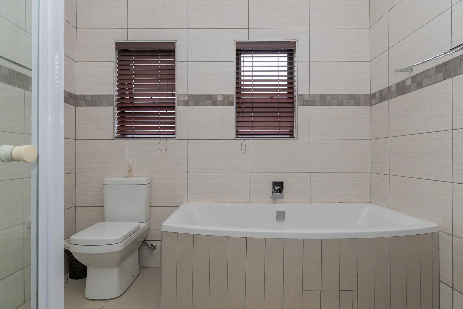 Upstairs, you’ll find three spacious bedrooms, each fitted with laminated flooring and built-in cupboards. The main bedroom features a luxurious en-suite bathroom complete with a his & hers vanity, bath, shower, and toilet, as well as a private dressing room. A second modern bathroom serves the remaining bedrooms.