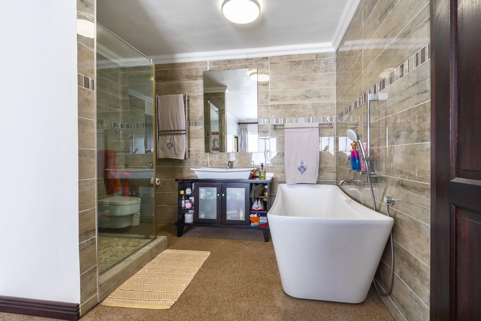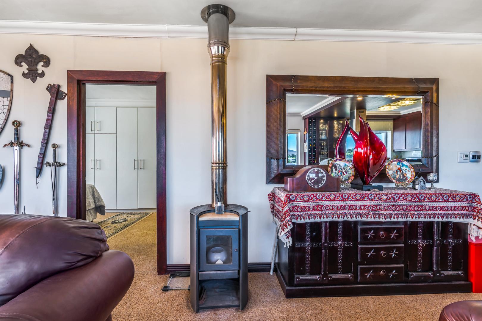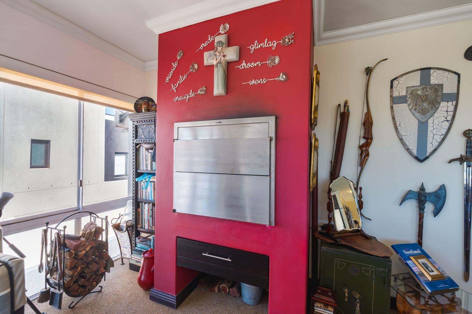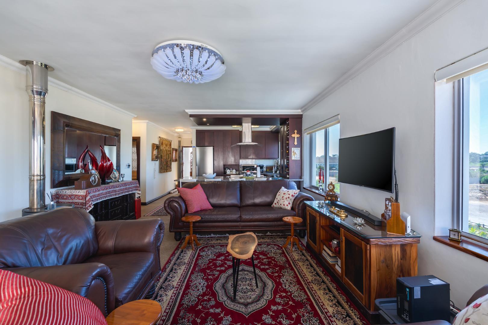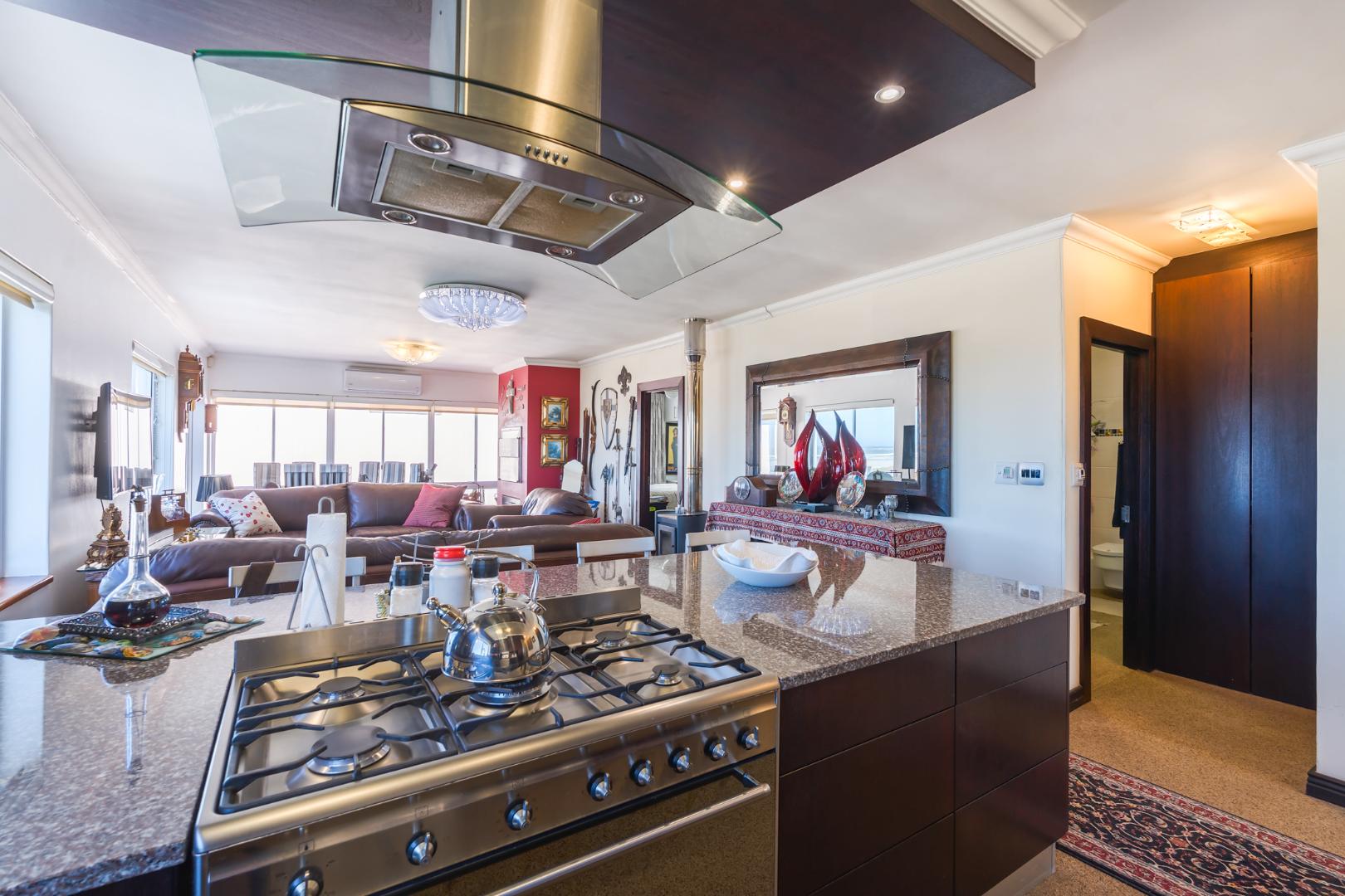 The open-plan living and dining area is light-filled and inviting, flowing to large windows that frame the spectacular outlook. From the lounge, you also enjoy views over a private garden below, complete with a braai area and built-in benches—ideal for relaxed outdoor entertaining or quiet moments outdoors. Quartz flooring throughout.