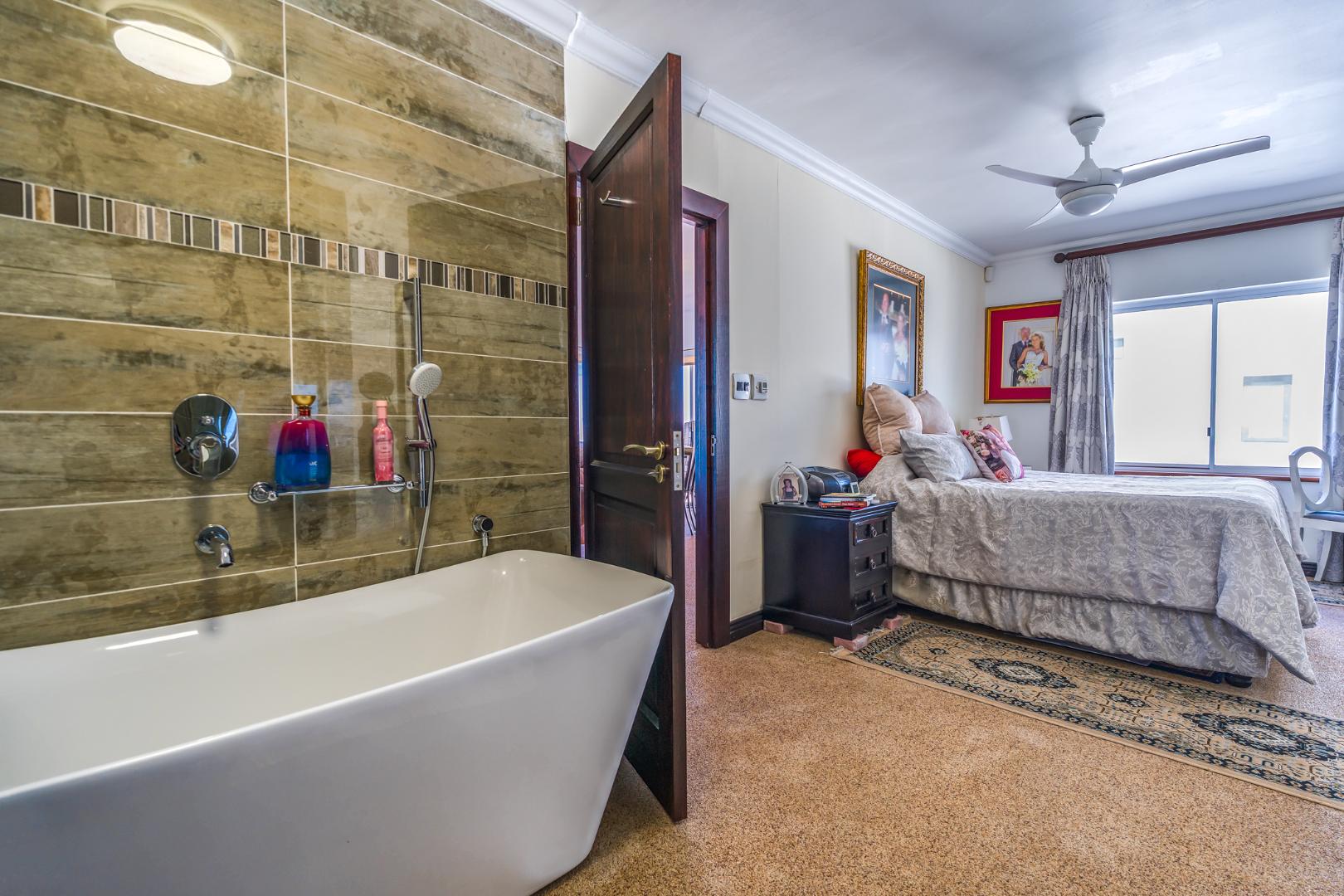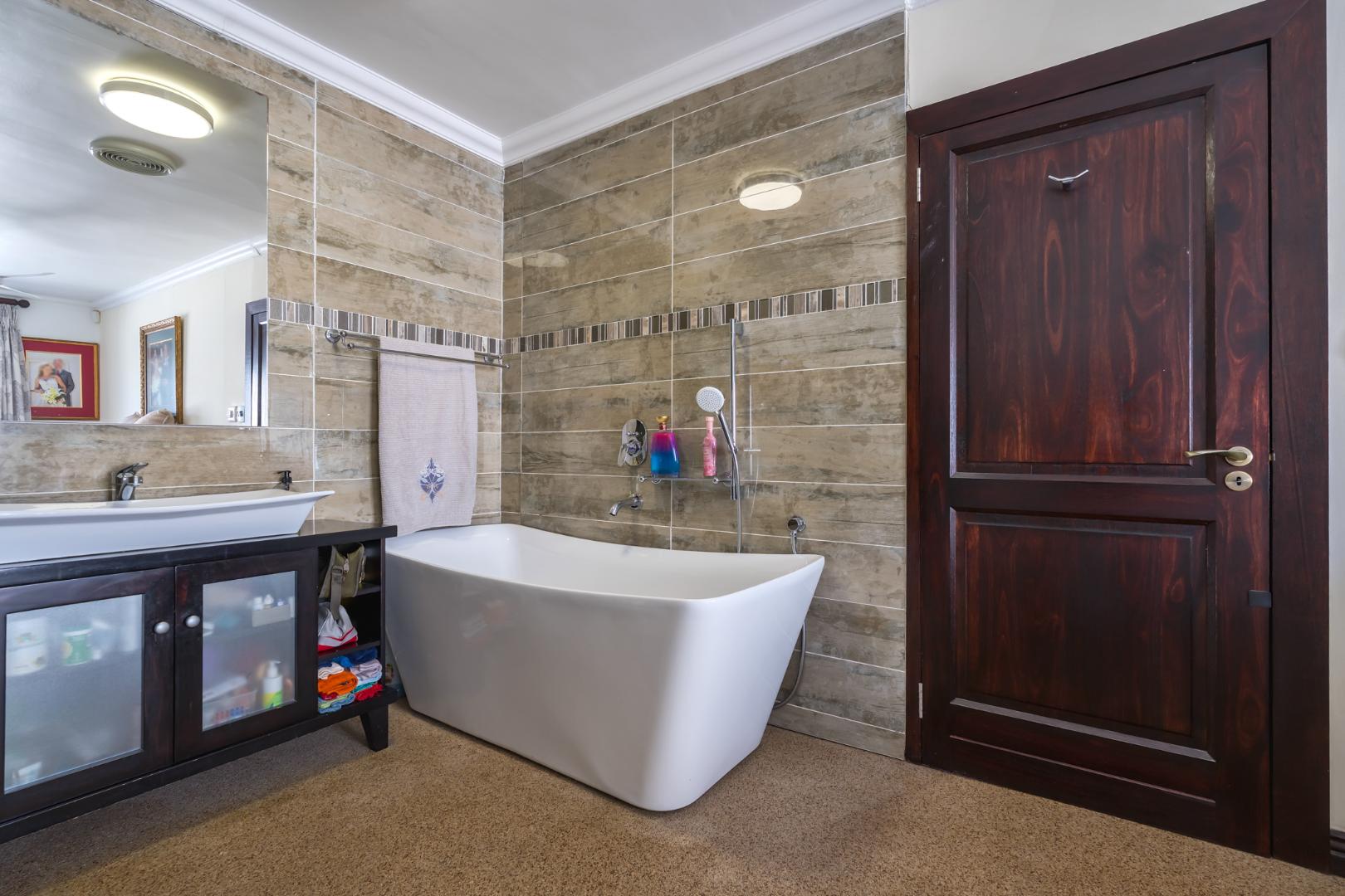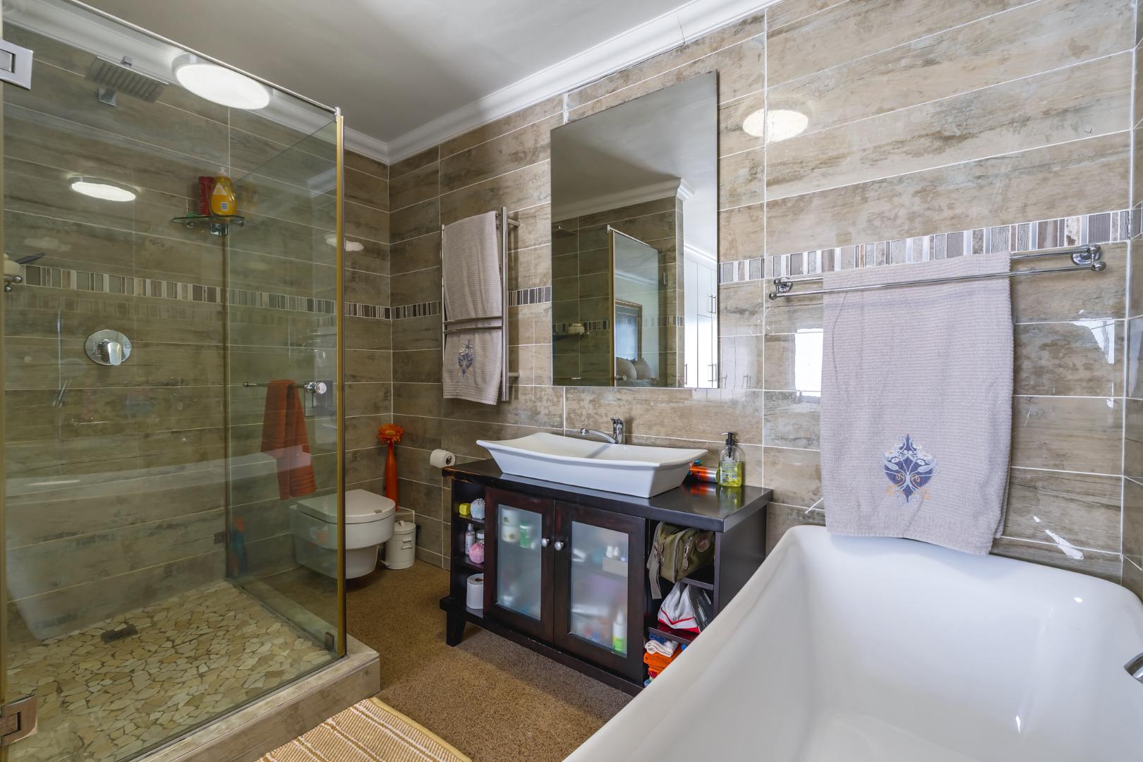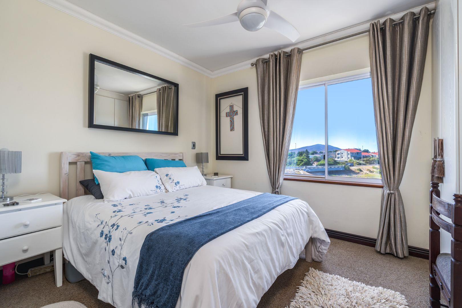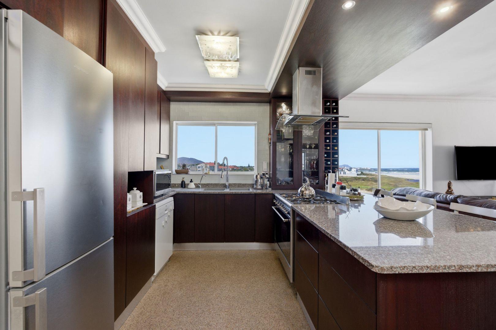 The open-plan living and dining area is light-filled and inviting, flowing to large windows that frame the spectacular outlook. From the lounge, you also enjoy views over a private garden below, complete with a braai area and built-in benches—ideal for relaxed outdoor entertaining or quiet moments outdoors. Quartz flooring throughout.