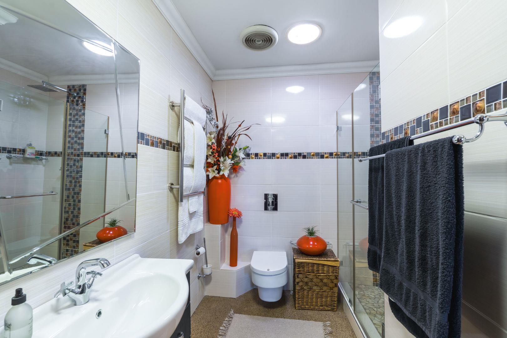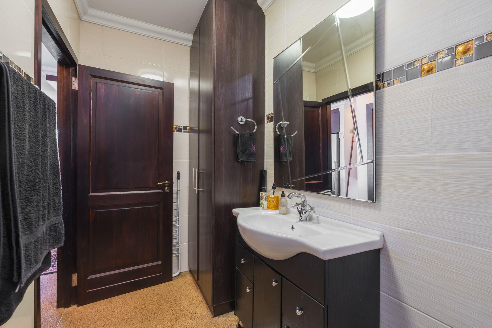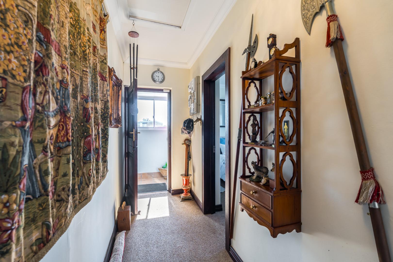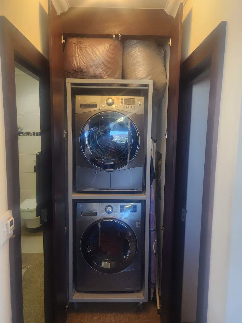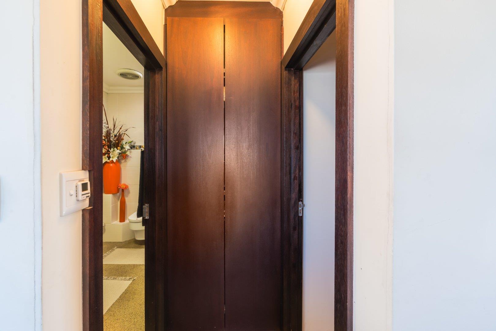 A large appliance cupboard, discreetly positioned in the passage, comfortably houses a washing machine and tumble dryer, keeping the kitchen and living areas uncluttered.