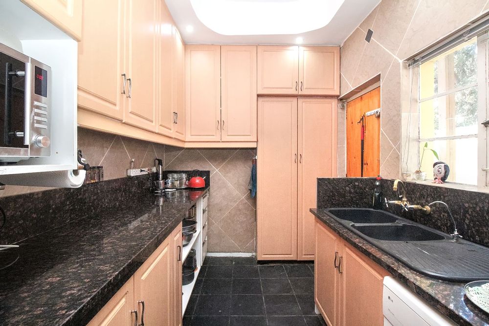Down stairs there are 3 bedrooms and 3 bathrooms of which one has its own kitchenette. The main bedroom has an large walk-in closet with additional cupboard space. The open plan lounge /dining room leads to a large kitchen, fitted with a built-in stove & hob, additional gas stove with granite tops. All living areas have parquet floors.