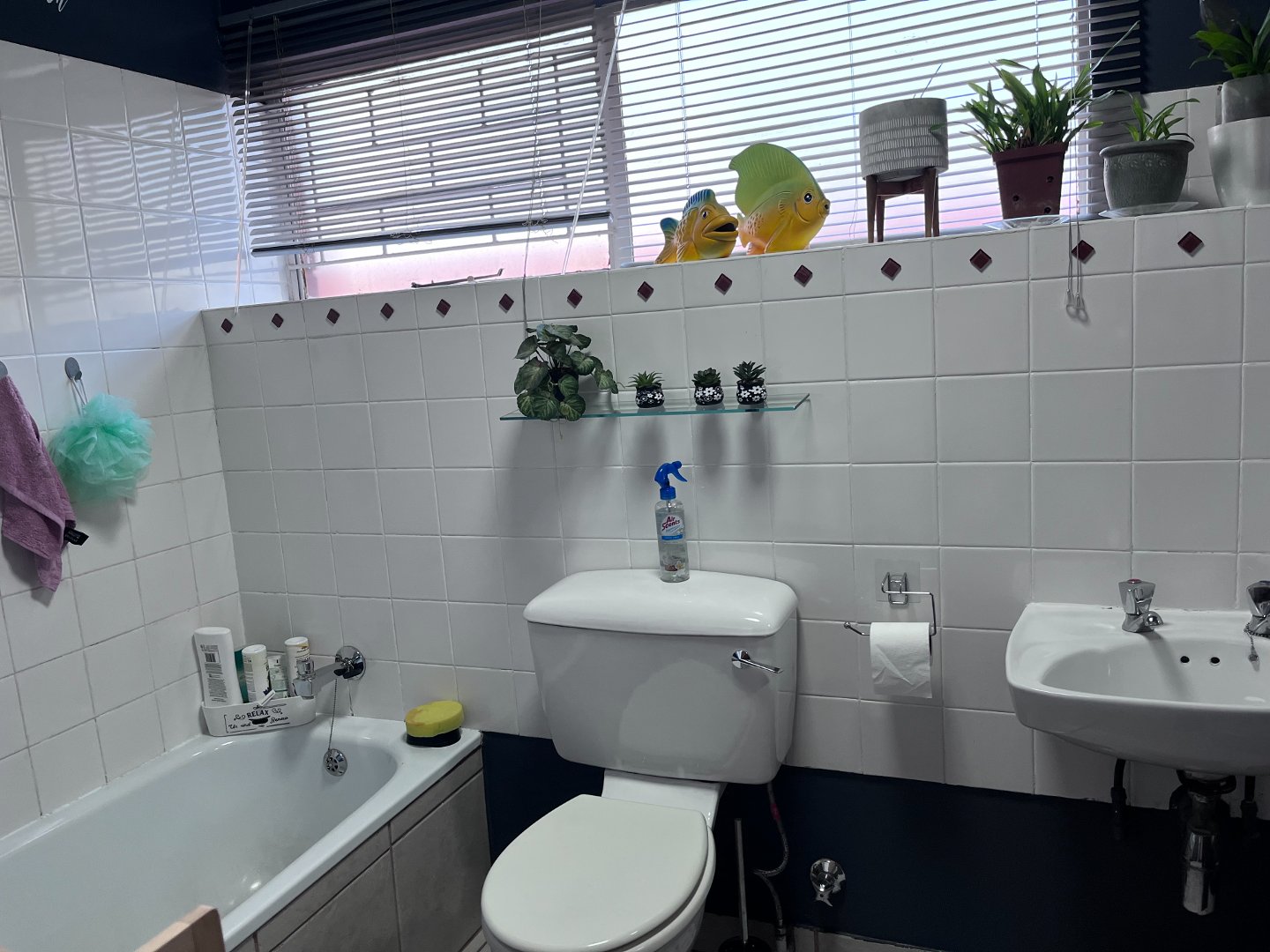 1 Neatly tiled bathroom with bath, basin, toilet, and shower over bath