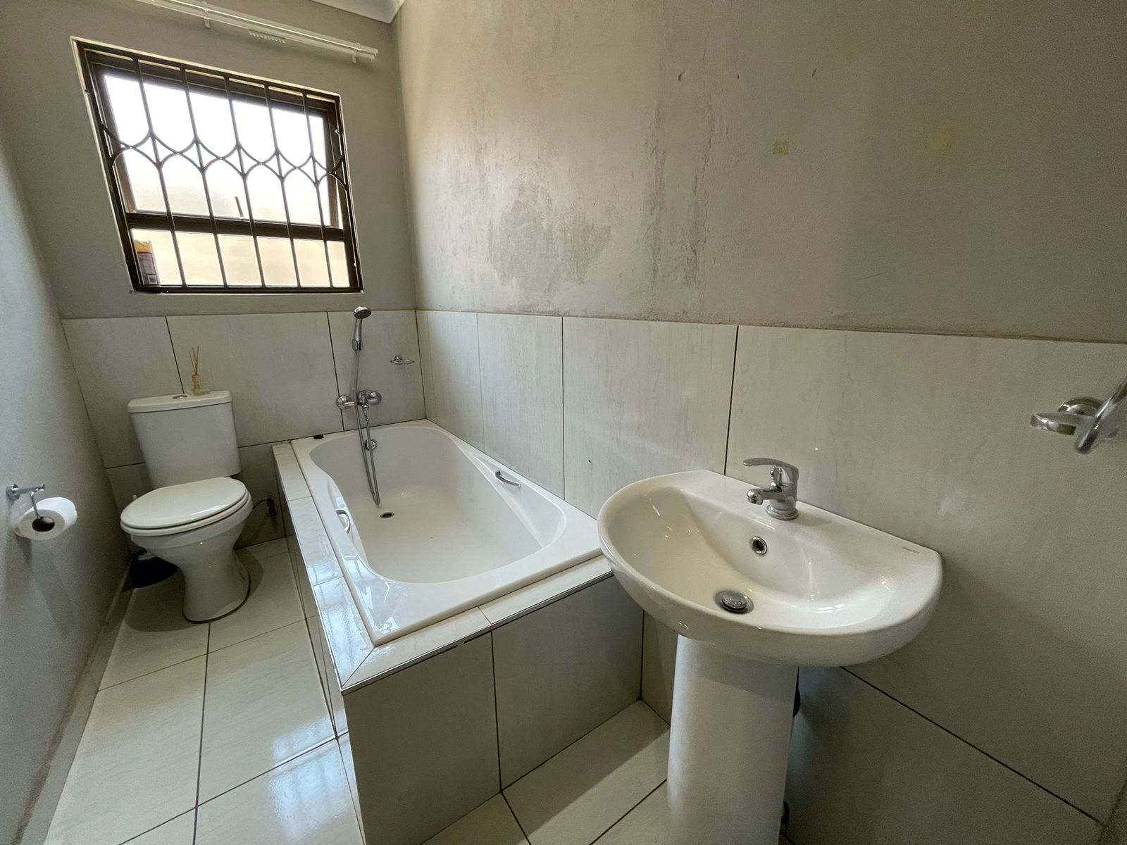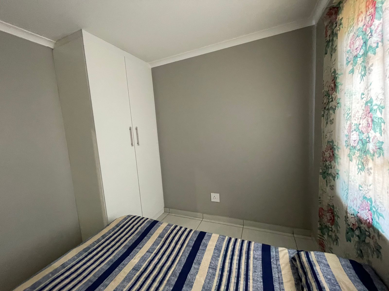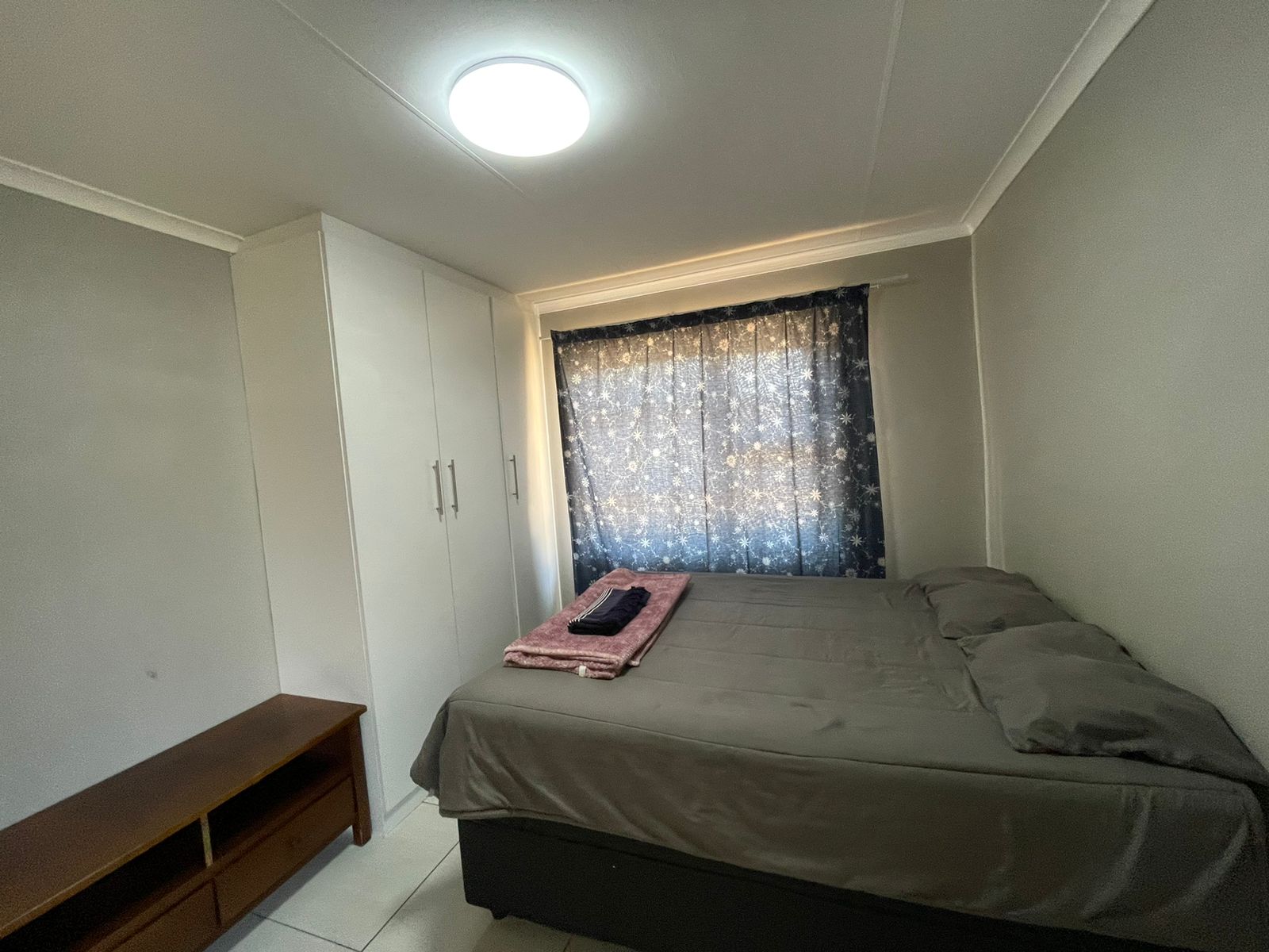 This home comprises two cozy bedrooms equipped with white built-in wardrobes, alongside a main bathroom that includes a bathtub, basin, and toilet. The main bedroom offers additional white built-in cupboards and a private en-suite bathroom complete with a shower, basin, and toilet.