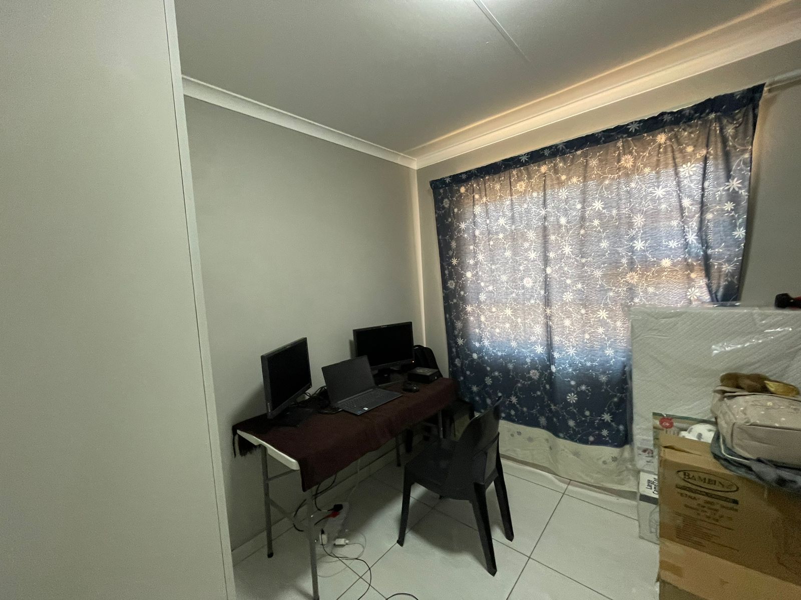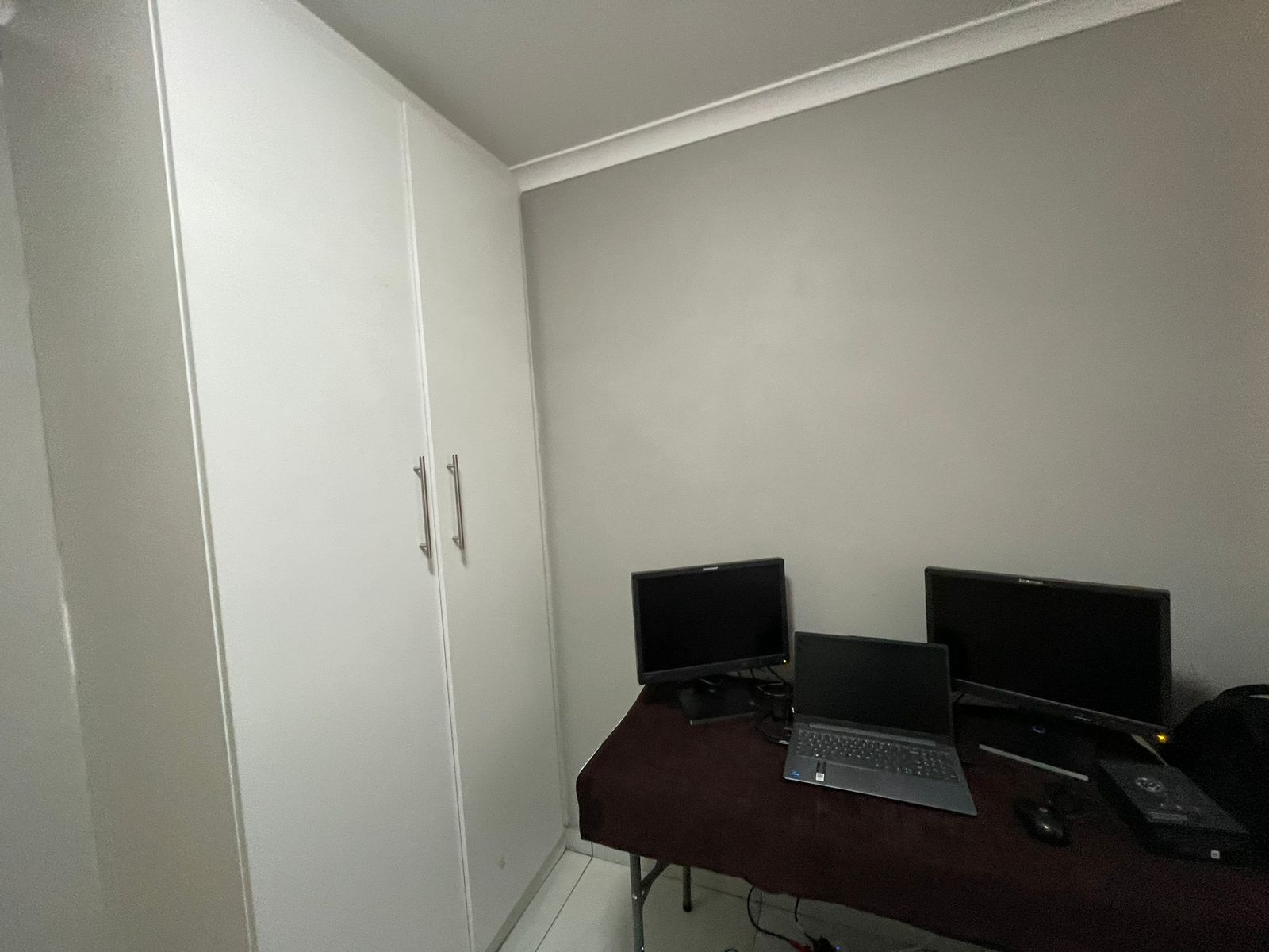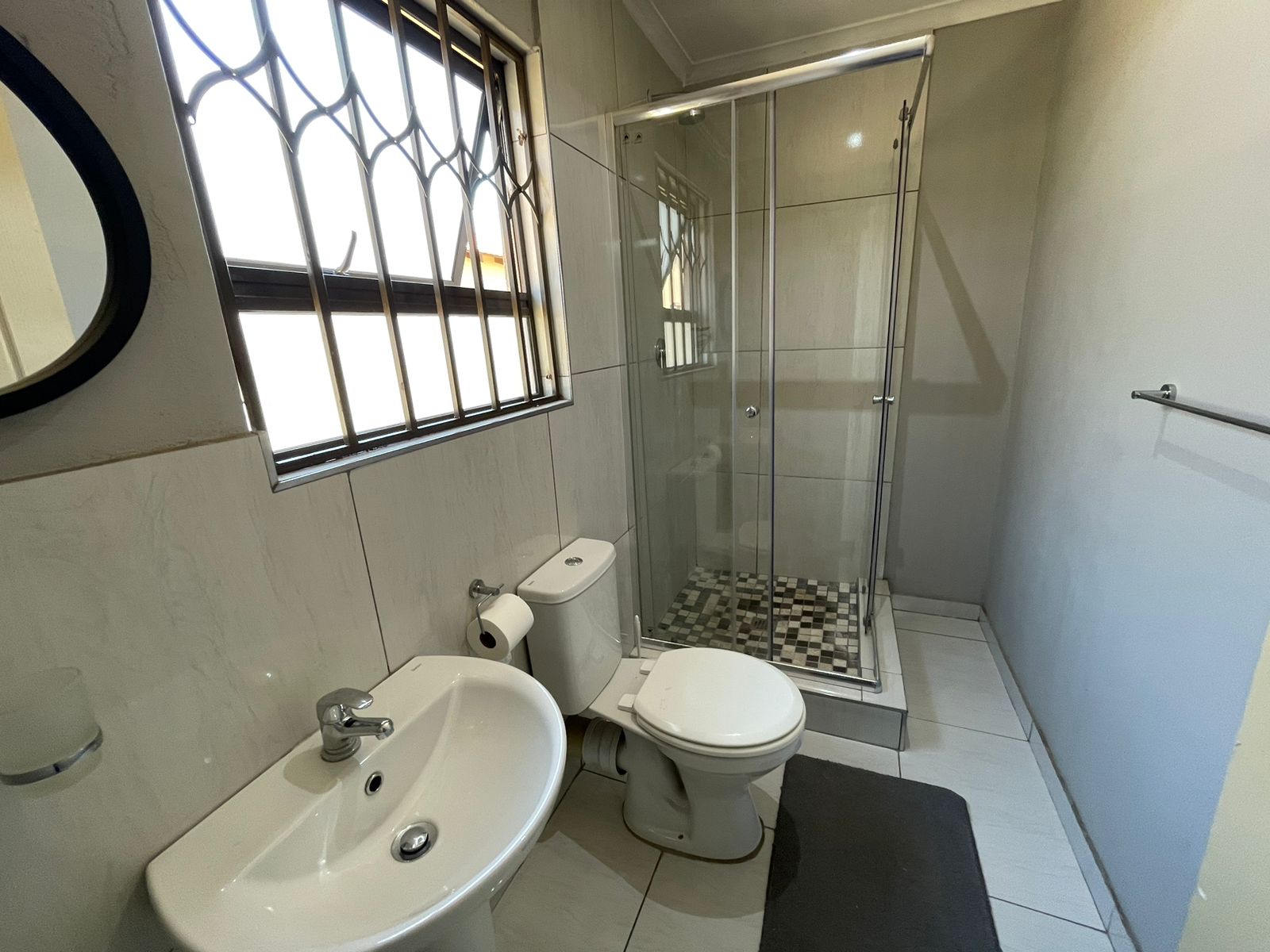 This home comprises two cozy bedrooms equipped with white built-in wardrobes, alongside a main bathroom that includes a bathtub, basin, and toilet. The main bedroom offers additional white built-in cupboards and a private en-suite bathroom complete with a shower, basin, and toilet.
