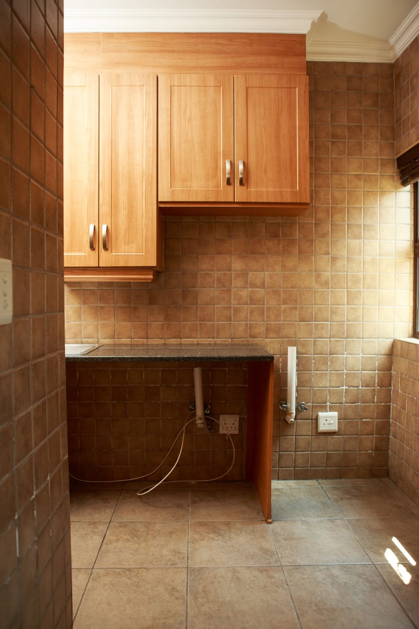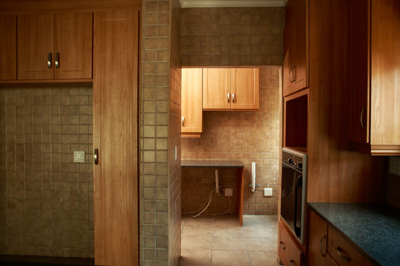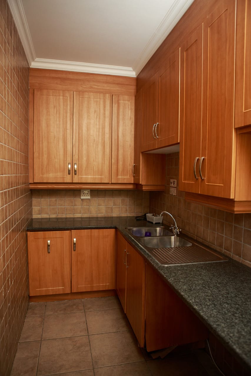 The beautifully crafted wooden kitchen features elegant granite countertops, making meal preparation a joy.