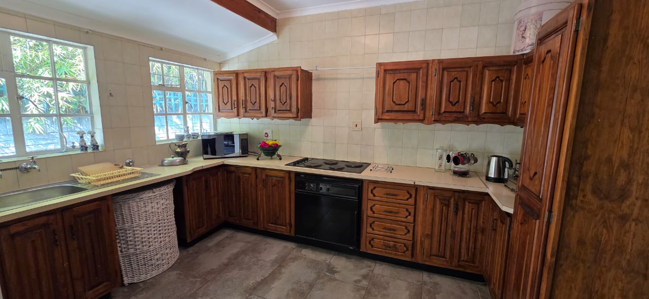 Openplan lounge, dining and wooden kitchen.