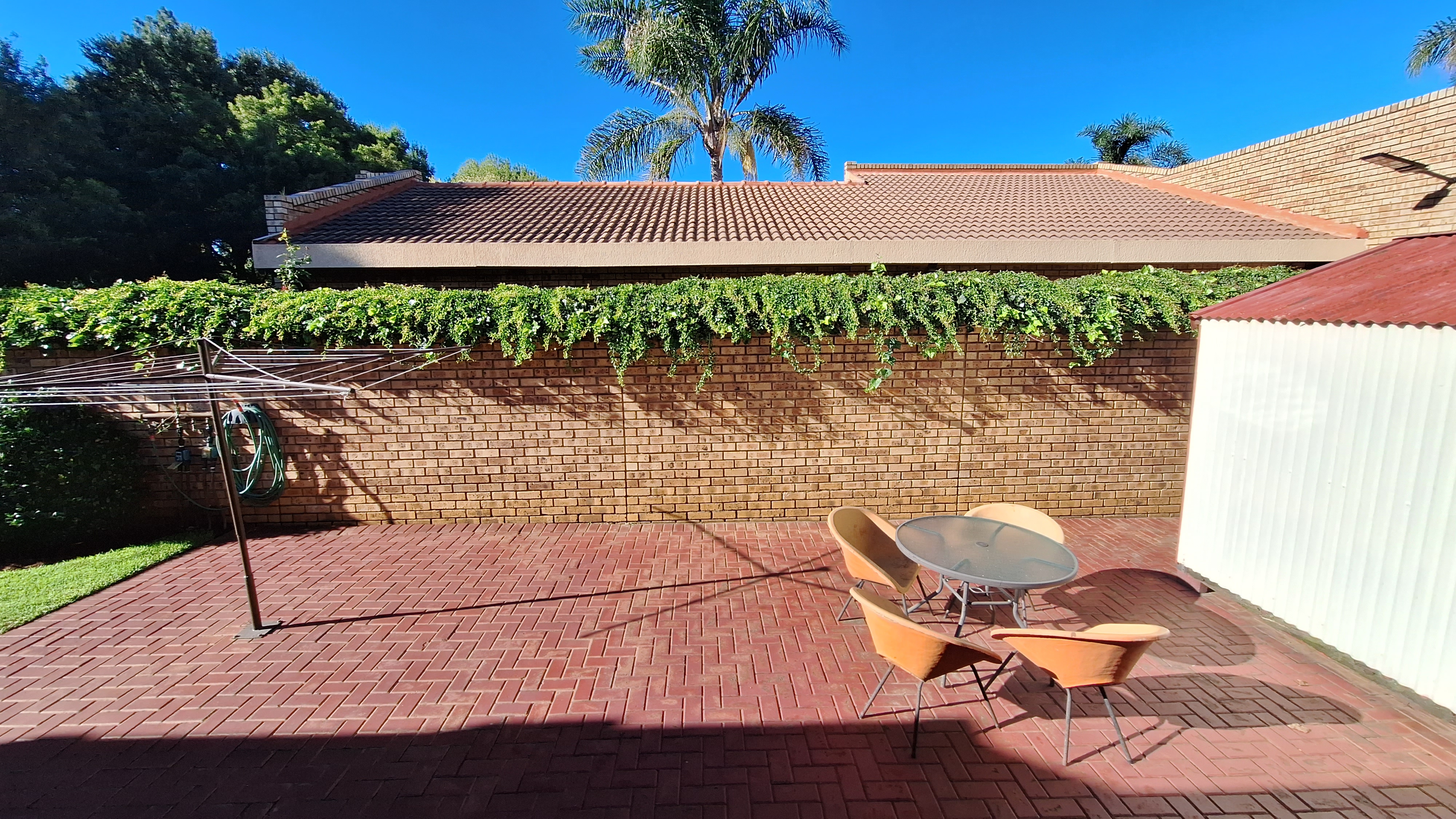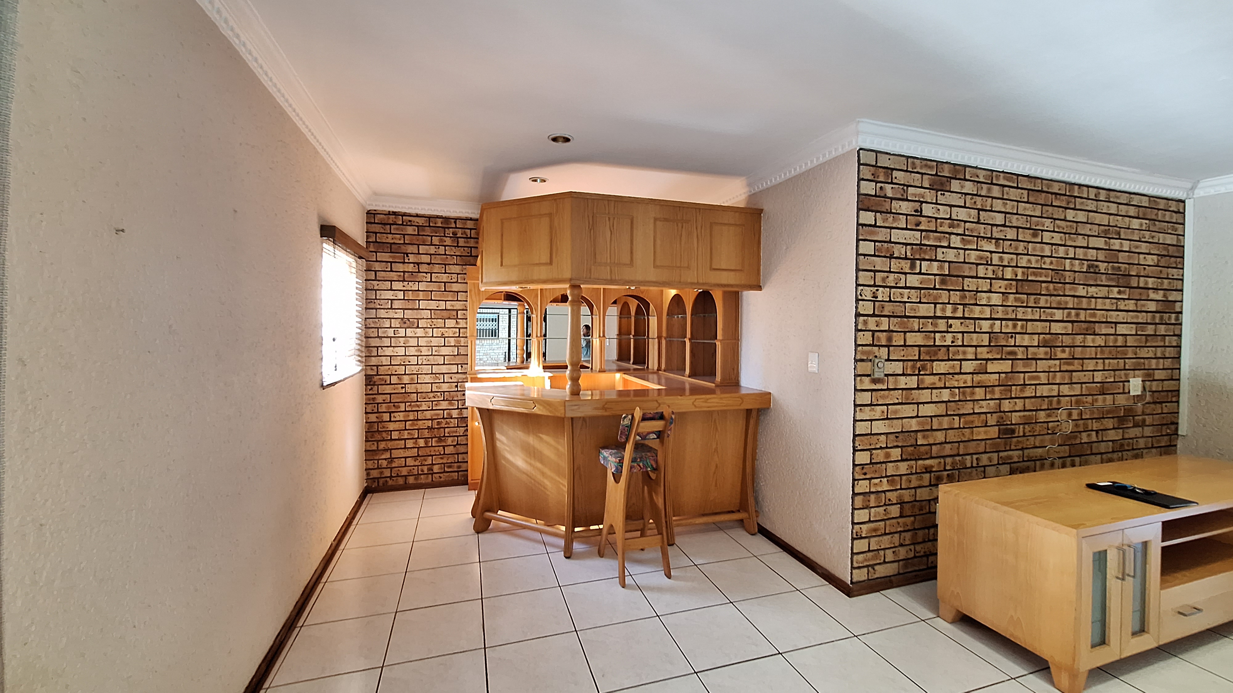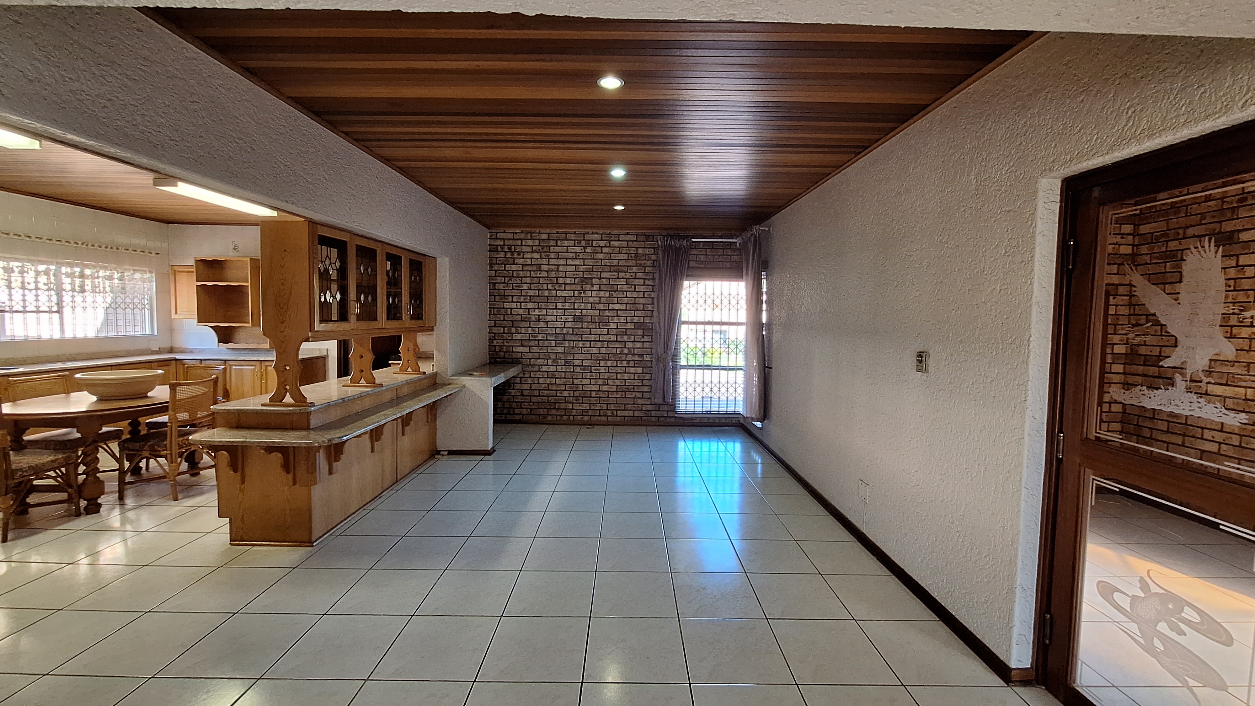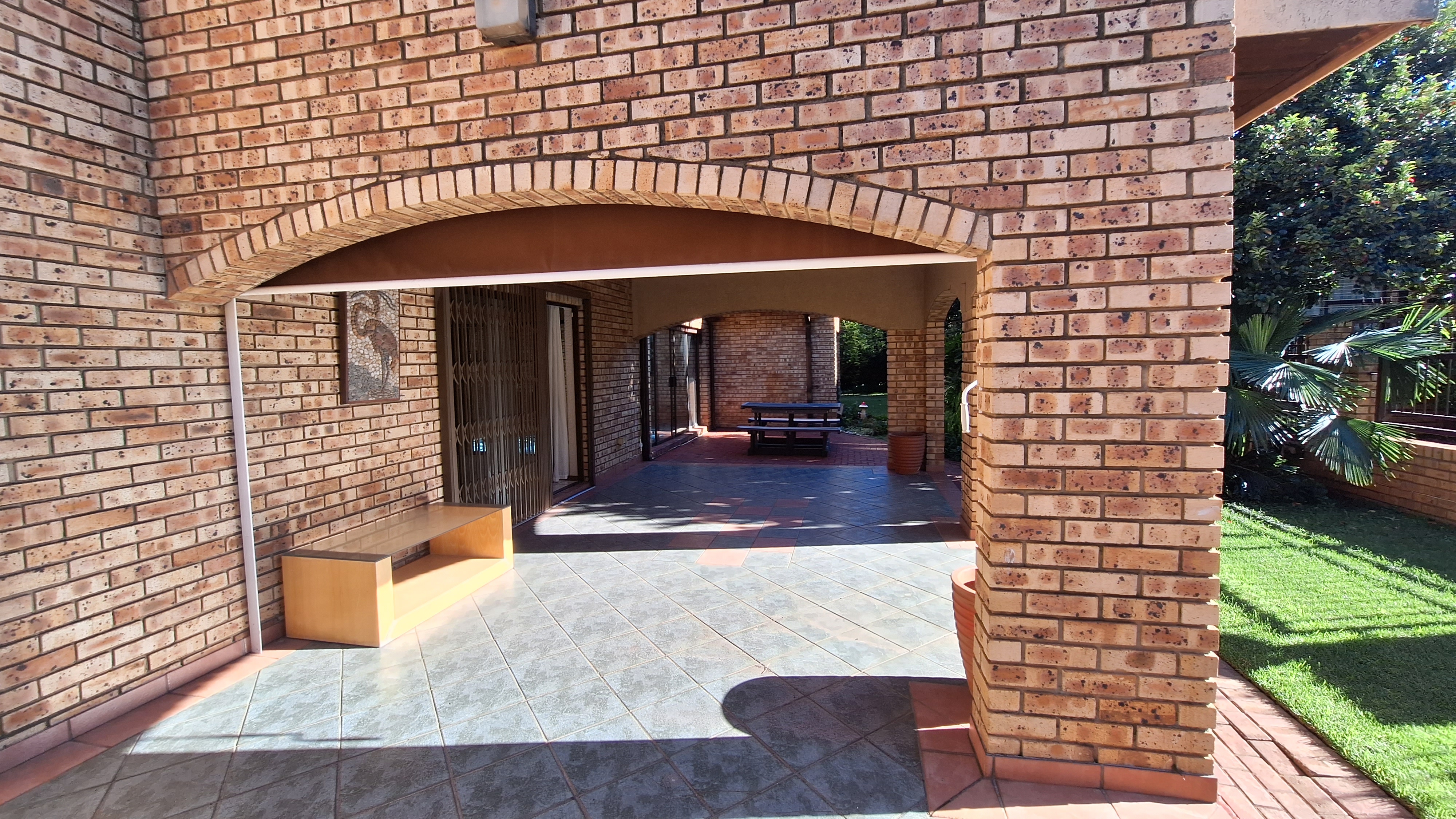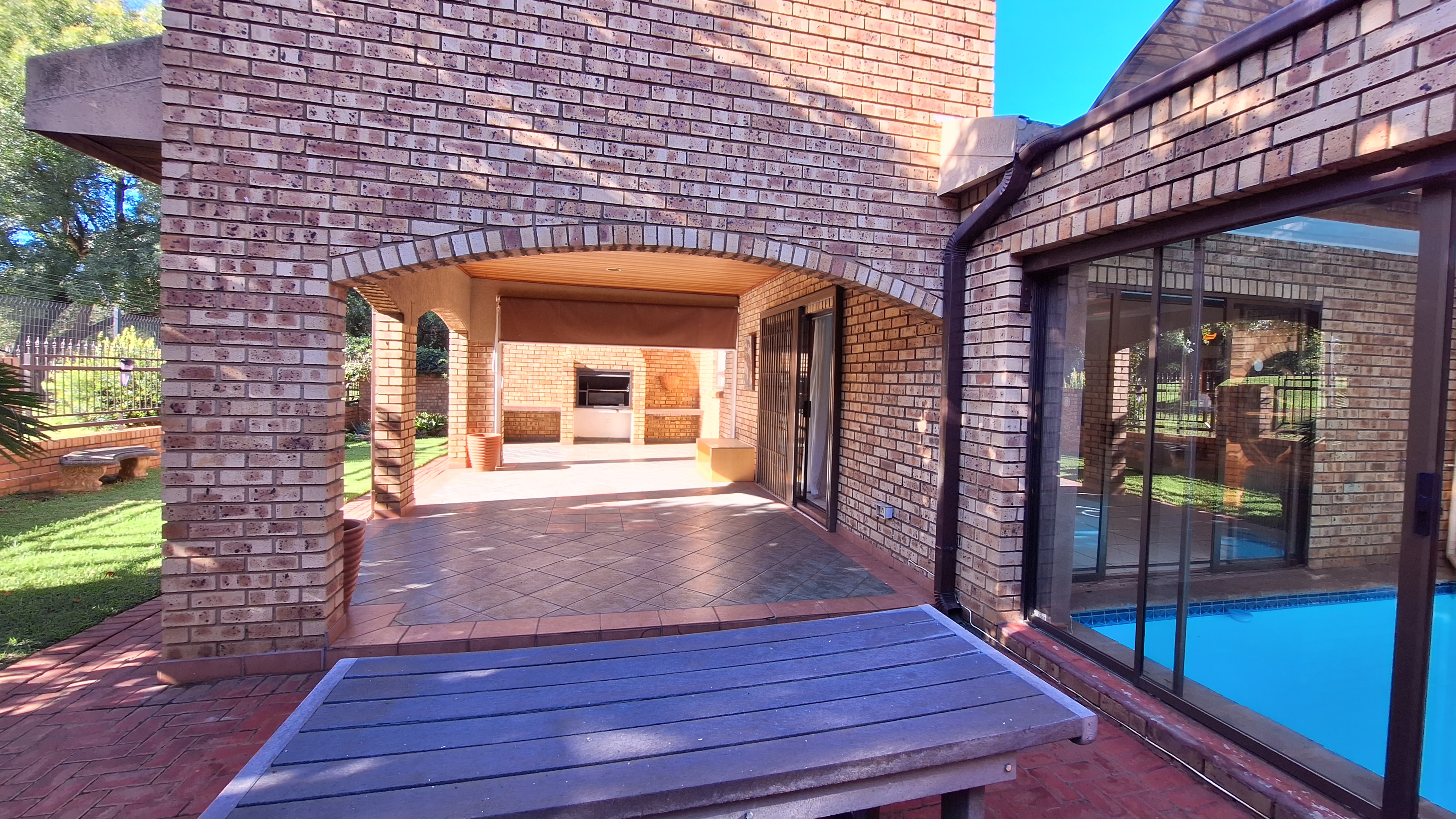 Glass doors leading to a patio with a built-in braai
