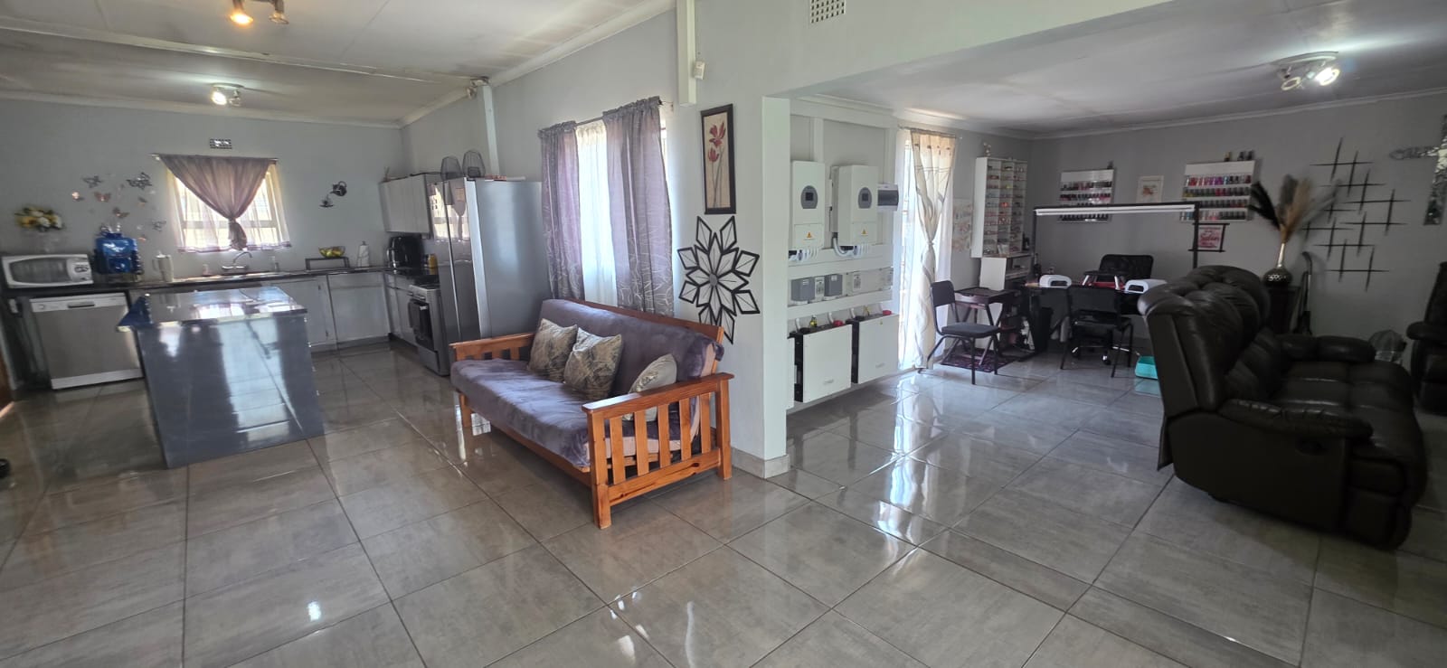 The home features 3 comfortable bedrooms, all fitted with built-in cupboards for ample storage. The living areas boast a fully tiled, open-plan layout, seamlessly connecting the lounge, dining area, and kitchen — ideal for modern family living and easy entertaining.
