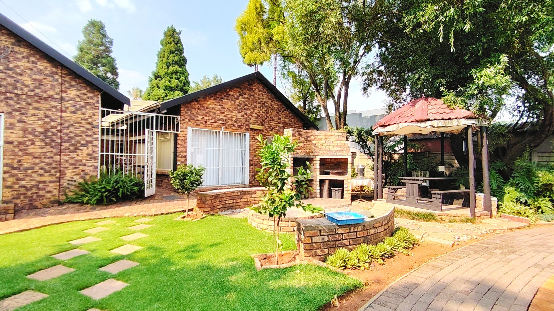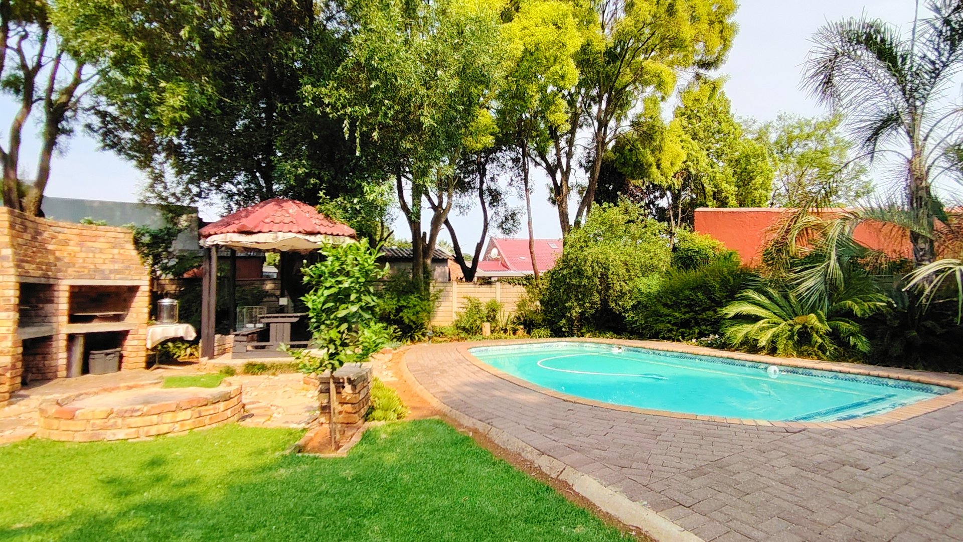 The covered entertainment area boasts a built-in braai, boma, and gazebo—ideal for hosting guests. Additional features include a double automated garage, double carport, two entrances, Wendy house, tool shed, bird cage, prepaid electricity, and fibre.