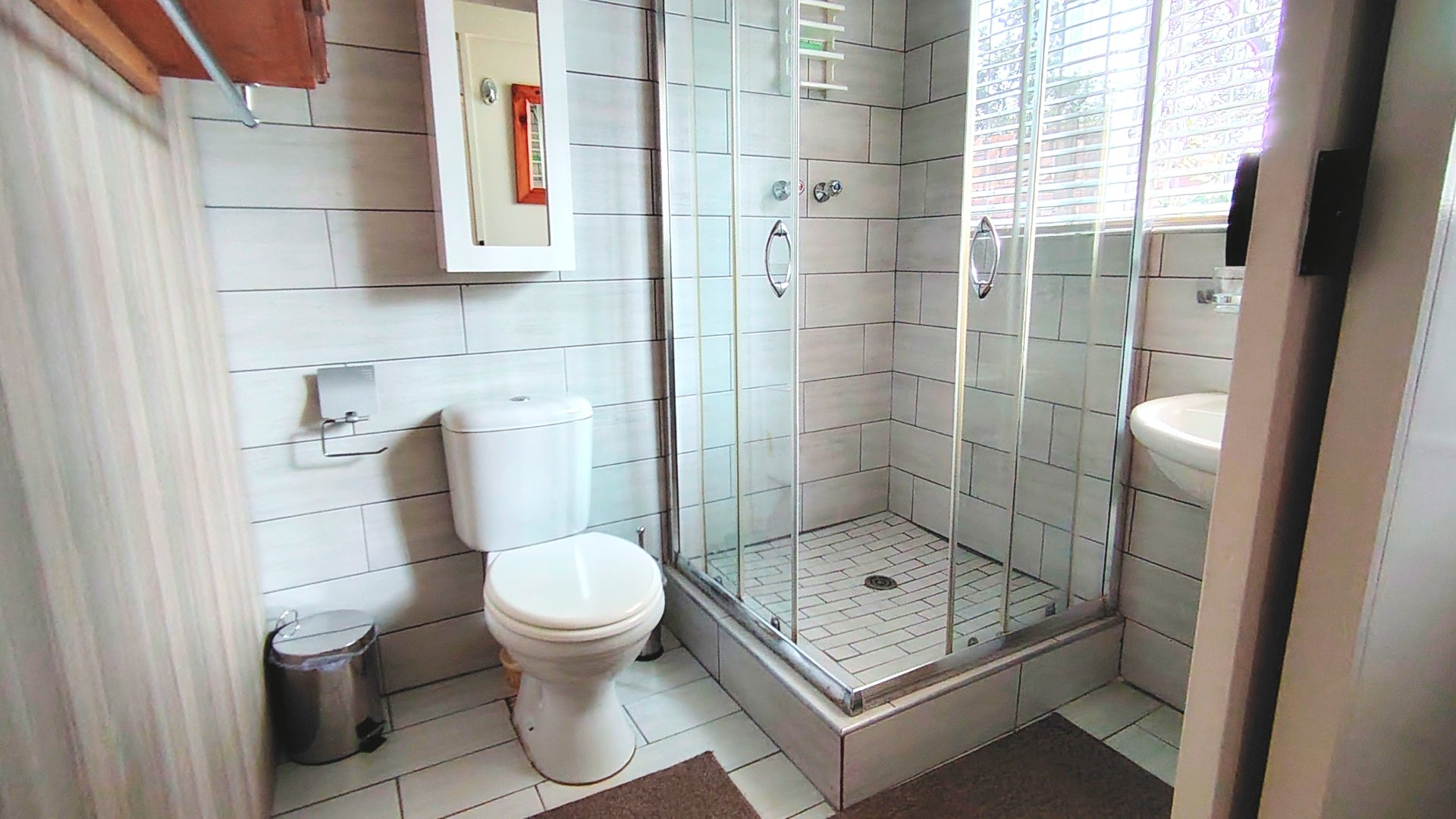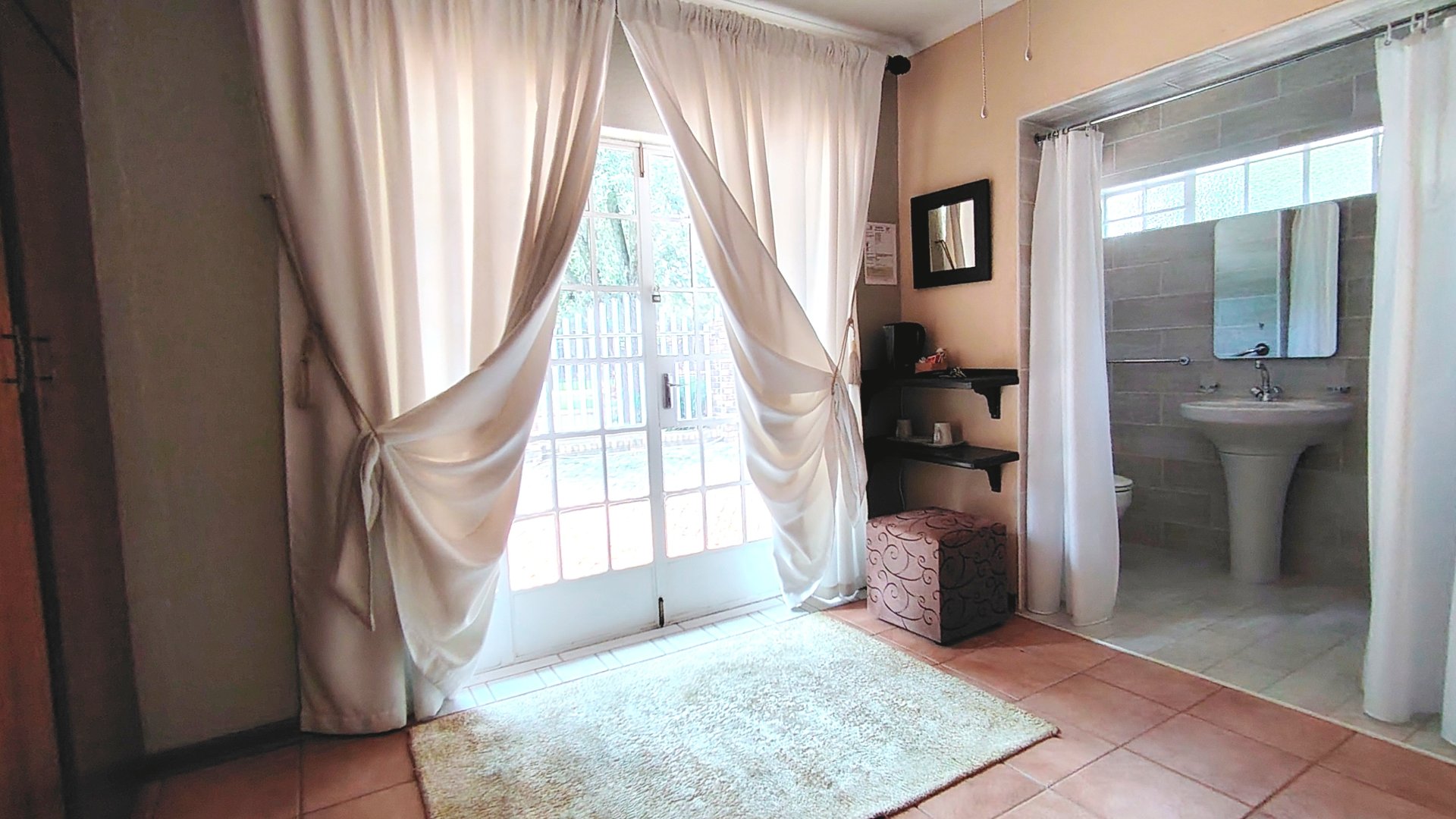 Three spacious bedrooms in the main house feature tiled flooring, ceiling fans, built-in cupboards, wall heaters, and glass doors to the front yard. Four neatly tiled bathrooms serve the main residence, including three en-suites.