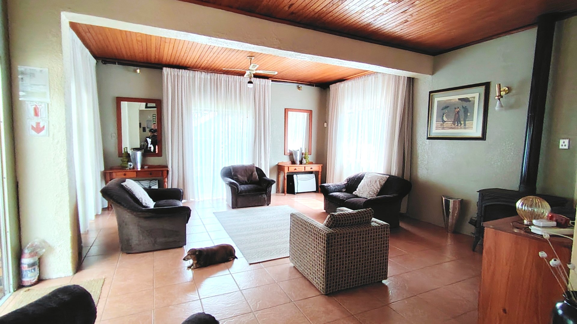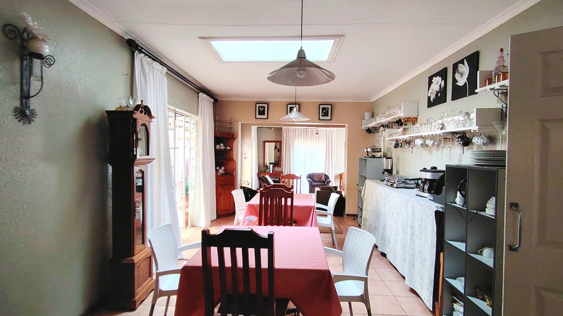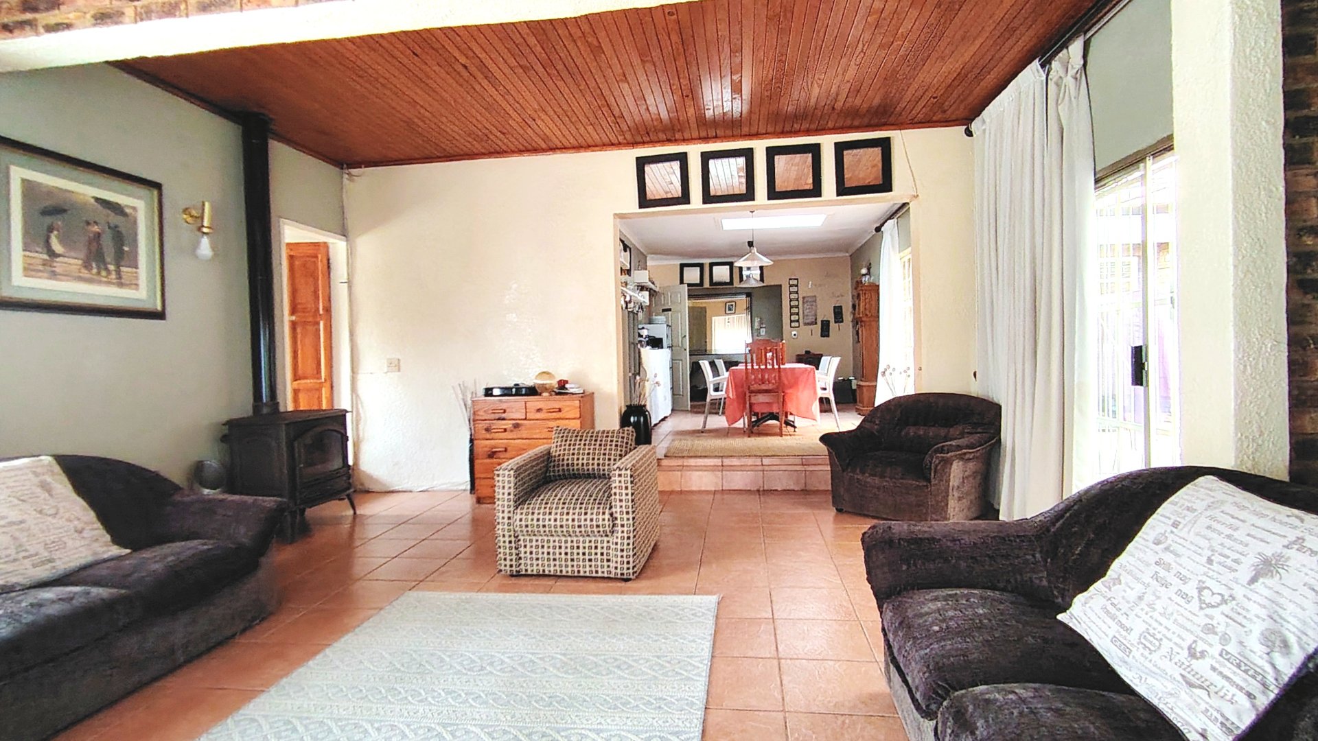 The main house offers generous living spaces, including an open-plan lounge and dining area with tiled flooring, ceiling fans, an anthracite stove, skylight, and TV points. Large patio doors lead to a covered courtyard and entertainment area. A separate TV room opens onto the front garden, adding another relaxed living option.