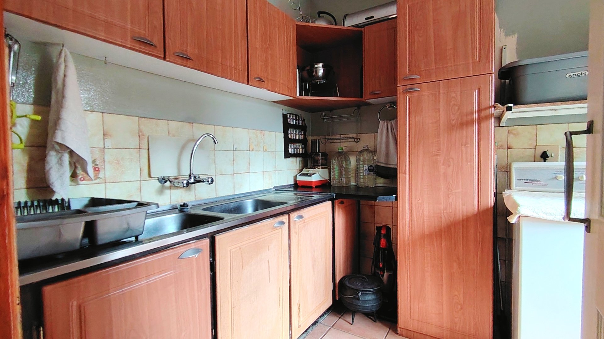 The well-equipped kitchen includes melamine countertops, wooden built-in cupboards, an eye-level oven, hob, extractor fan, double sink, laundry area, and a separate scullery.