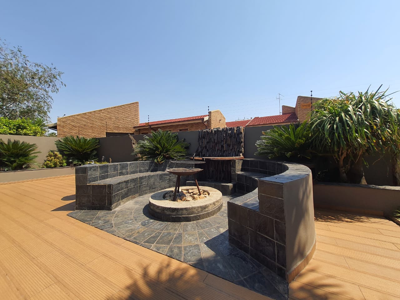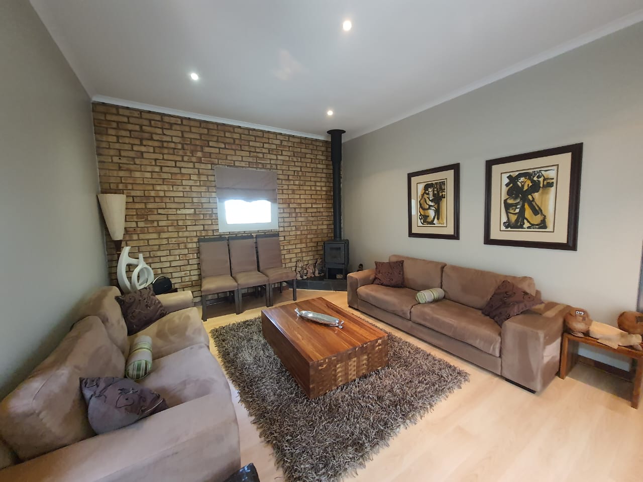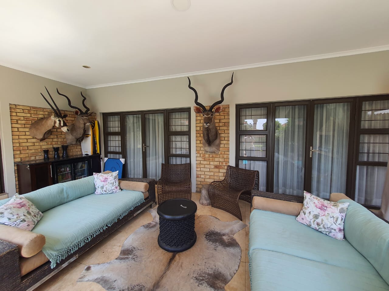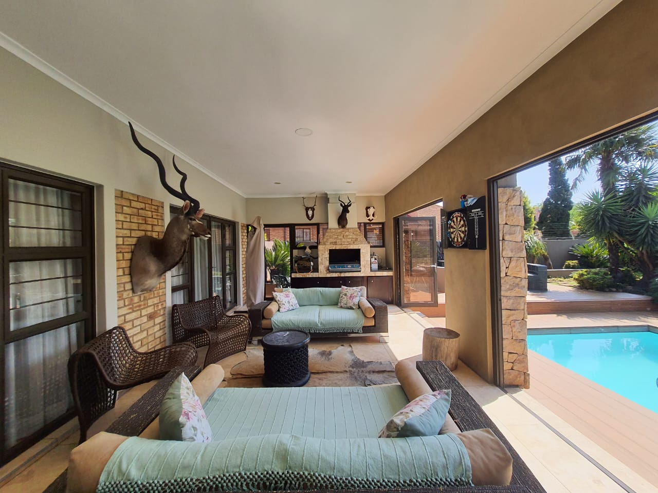 Entertainment Area With A Indoor Gas Braai With Stagger Doors Leading To A Beautiful Sparkling Pool and Boma Area