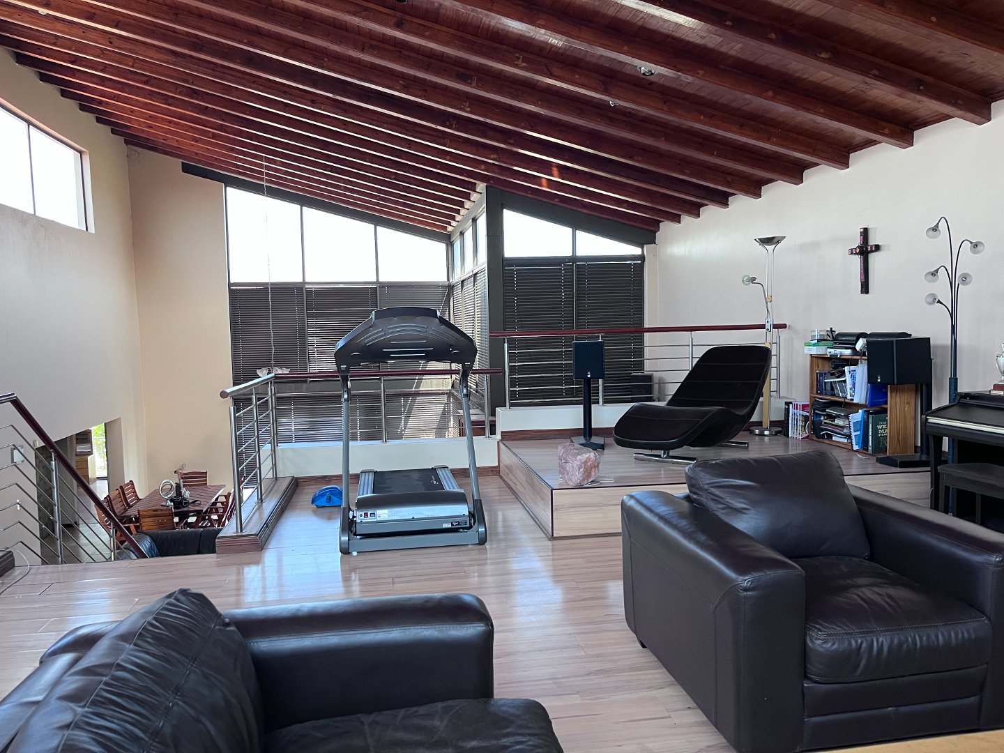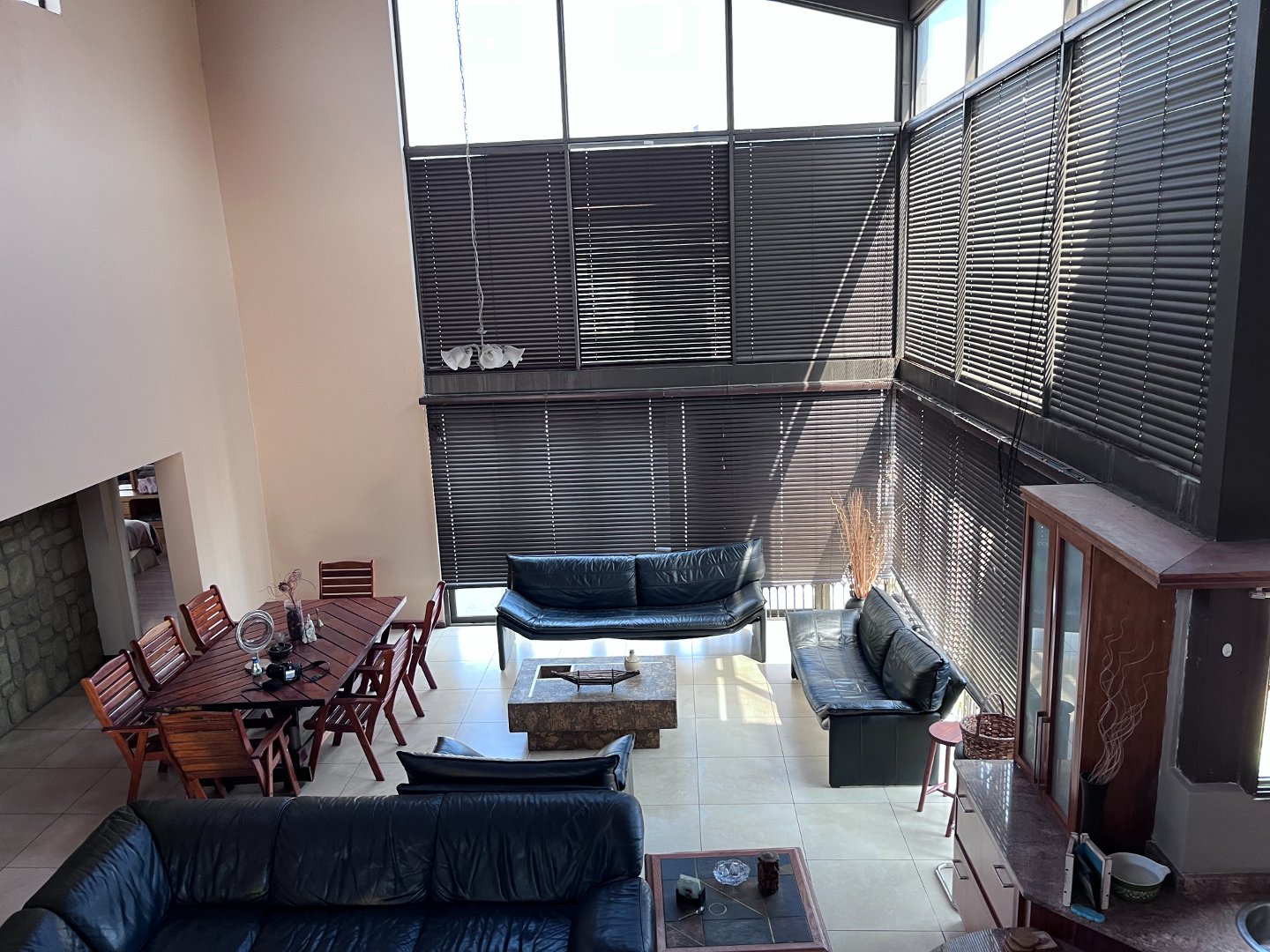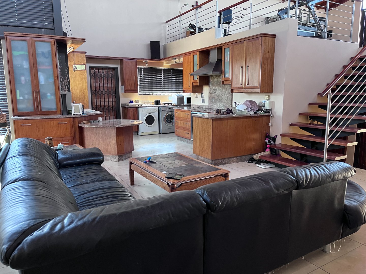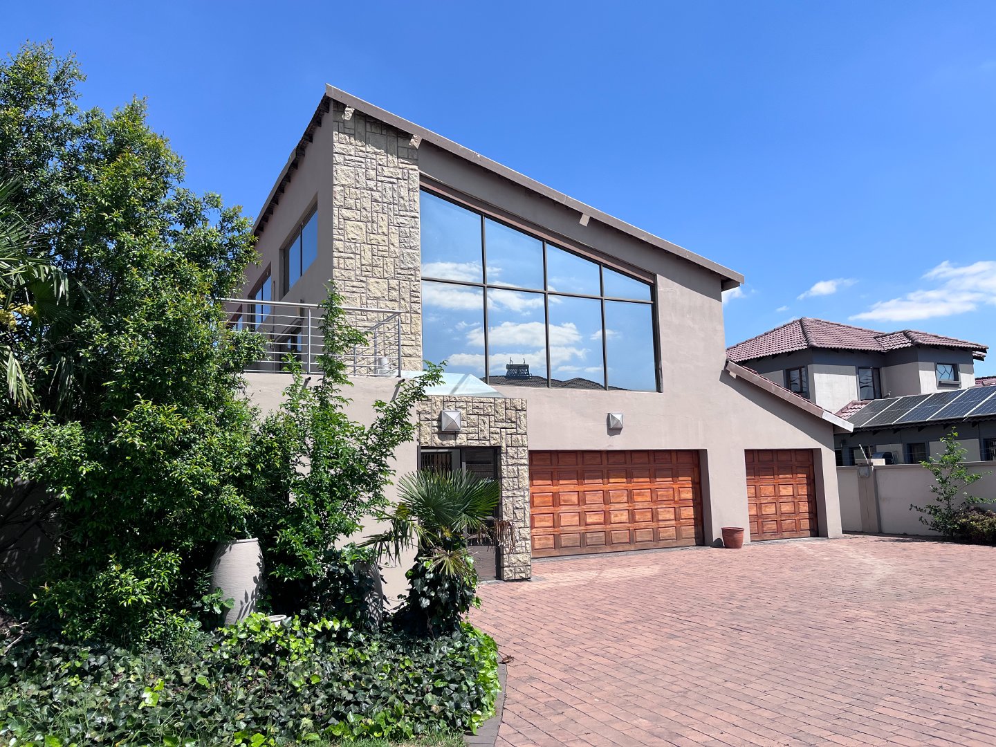 The open plan living areas with its extra large windows makes the house light and airy inside. Stacking doors opens to the outside patio area with the build-in braai. Downstairs you will also find the 4 generously sized en-suite bedrooms and a guest toilet. Upstairs is an extra large open plan area that opens to a private balcony. 3 Garages and ample parking space for guests.