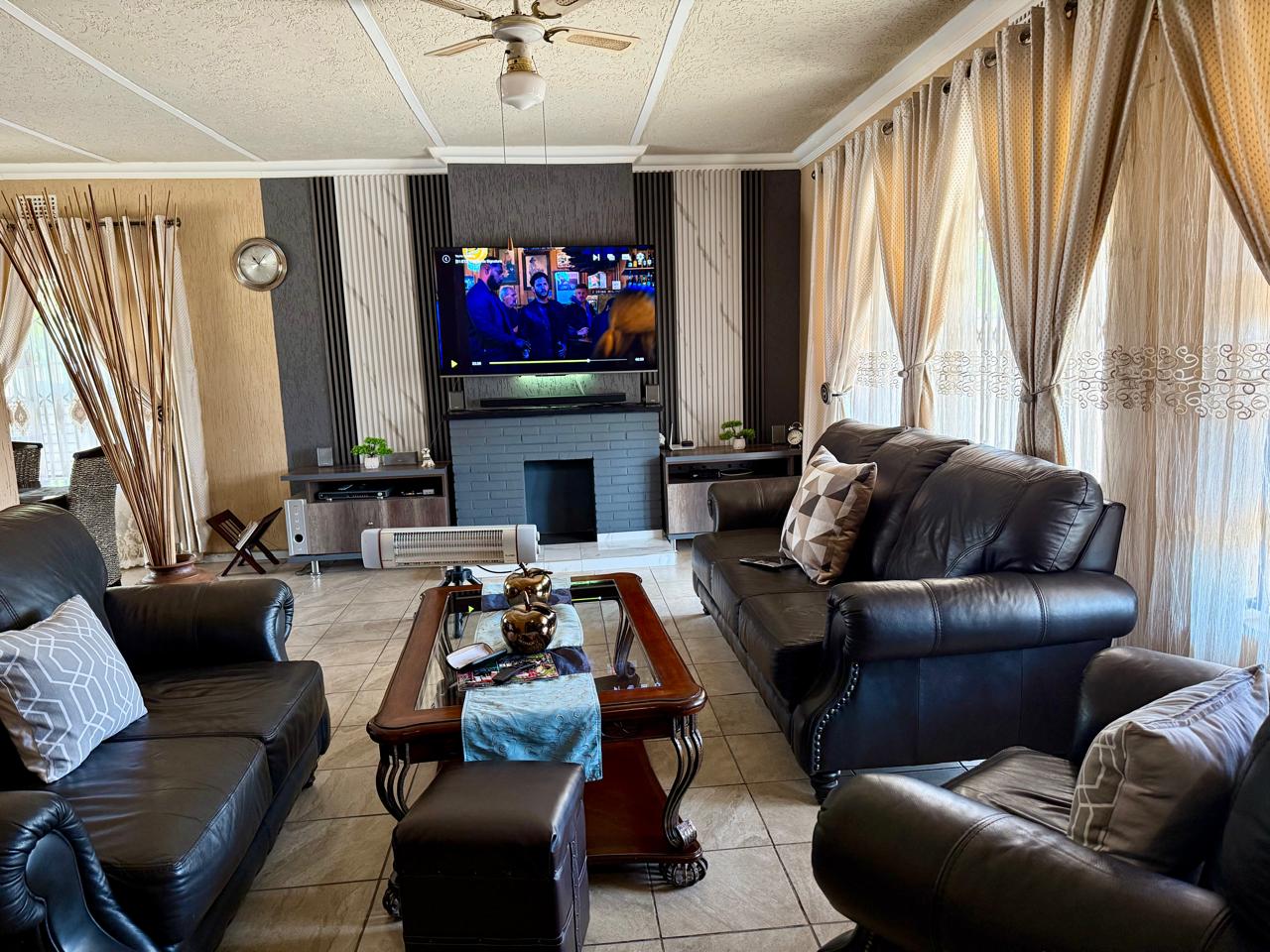 - Open-Plan Living: Spacious dining and lounge area with a warm fireplace