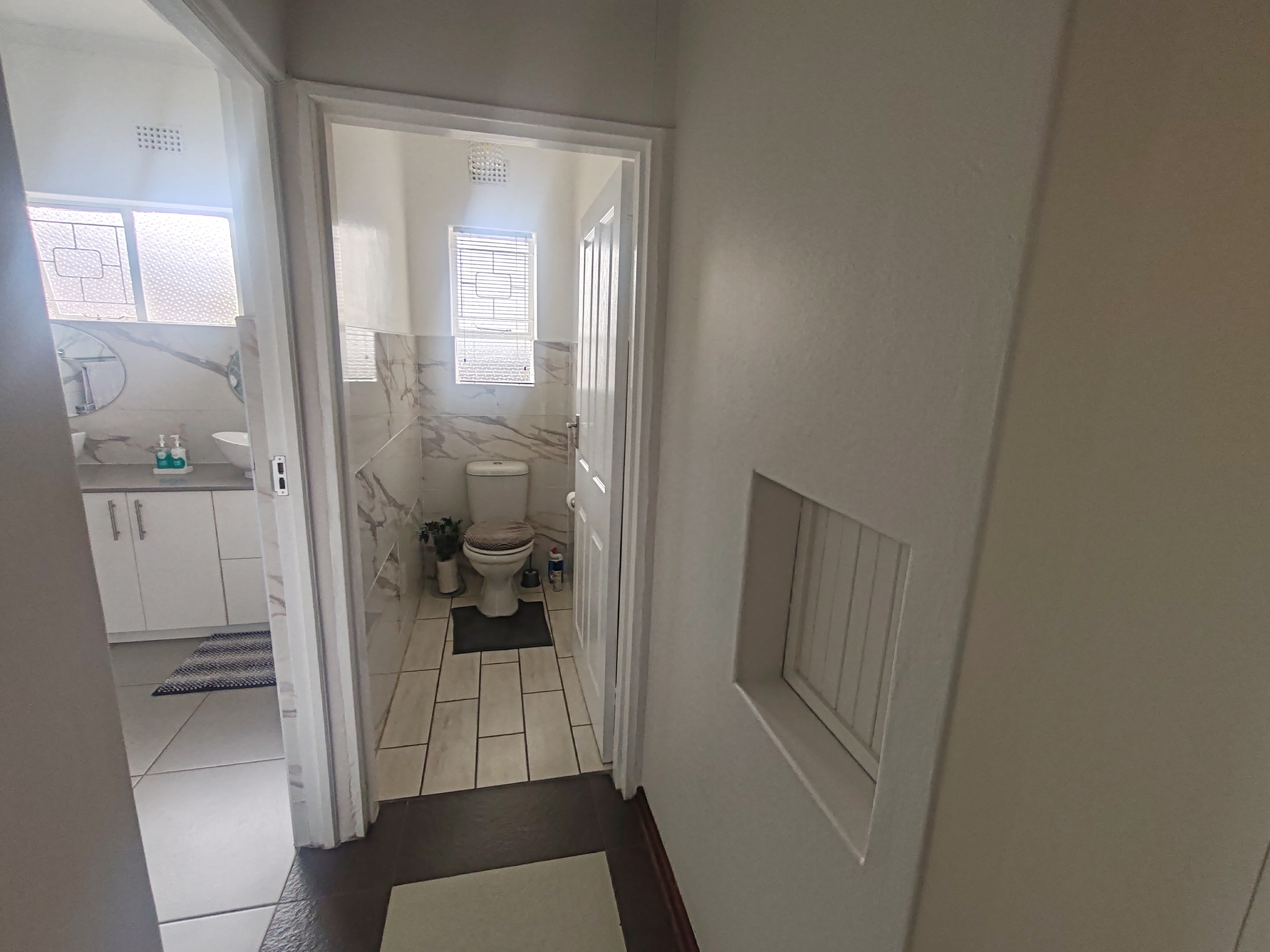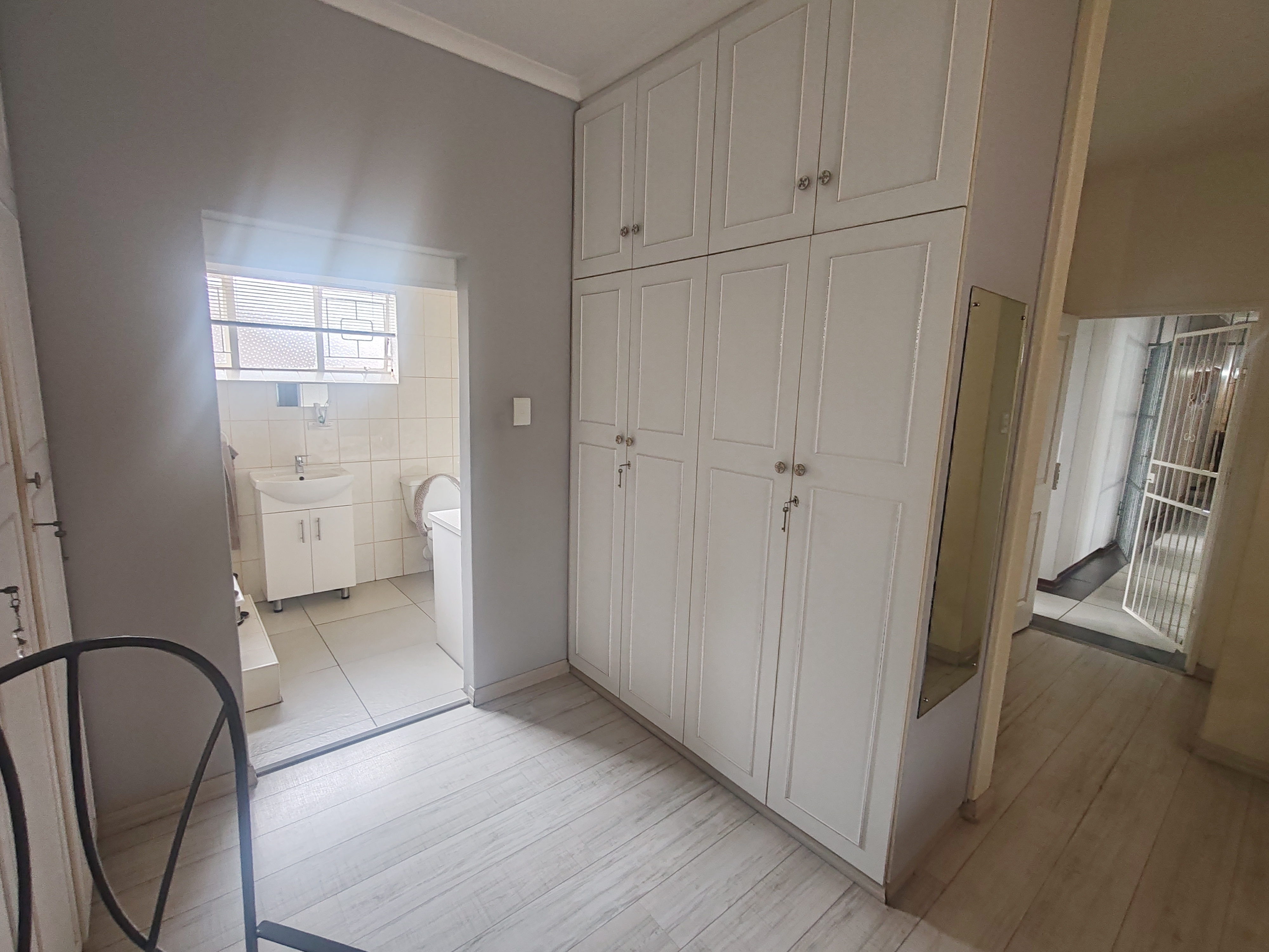 All four bedrooms are fitted with built-in cupboards. The main bedroom features an en-suite bathroom with a bath, toilet, and basin, along with an air conditioner. The main bathroom includes a shower and double basins, with a separate toilet.