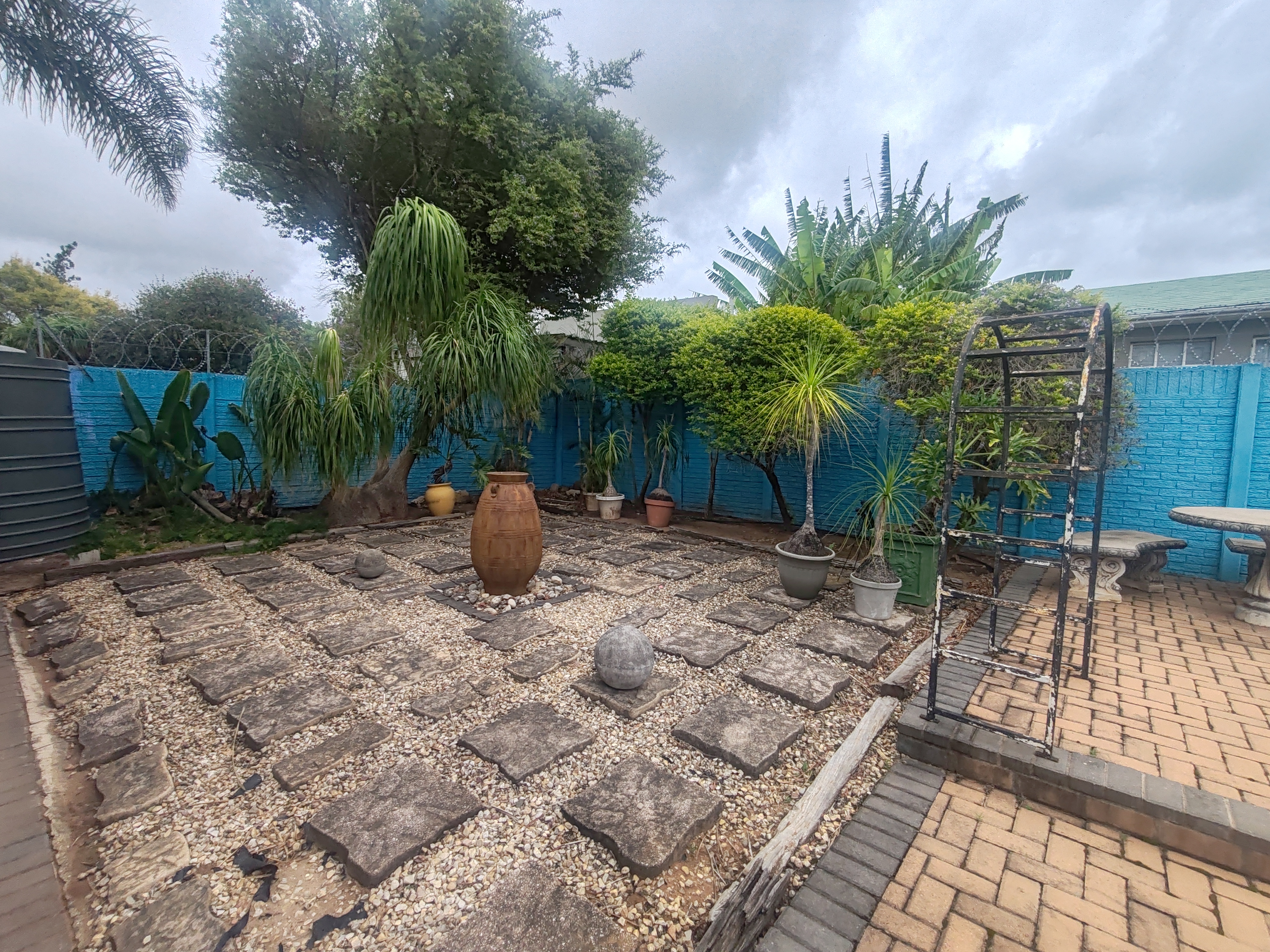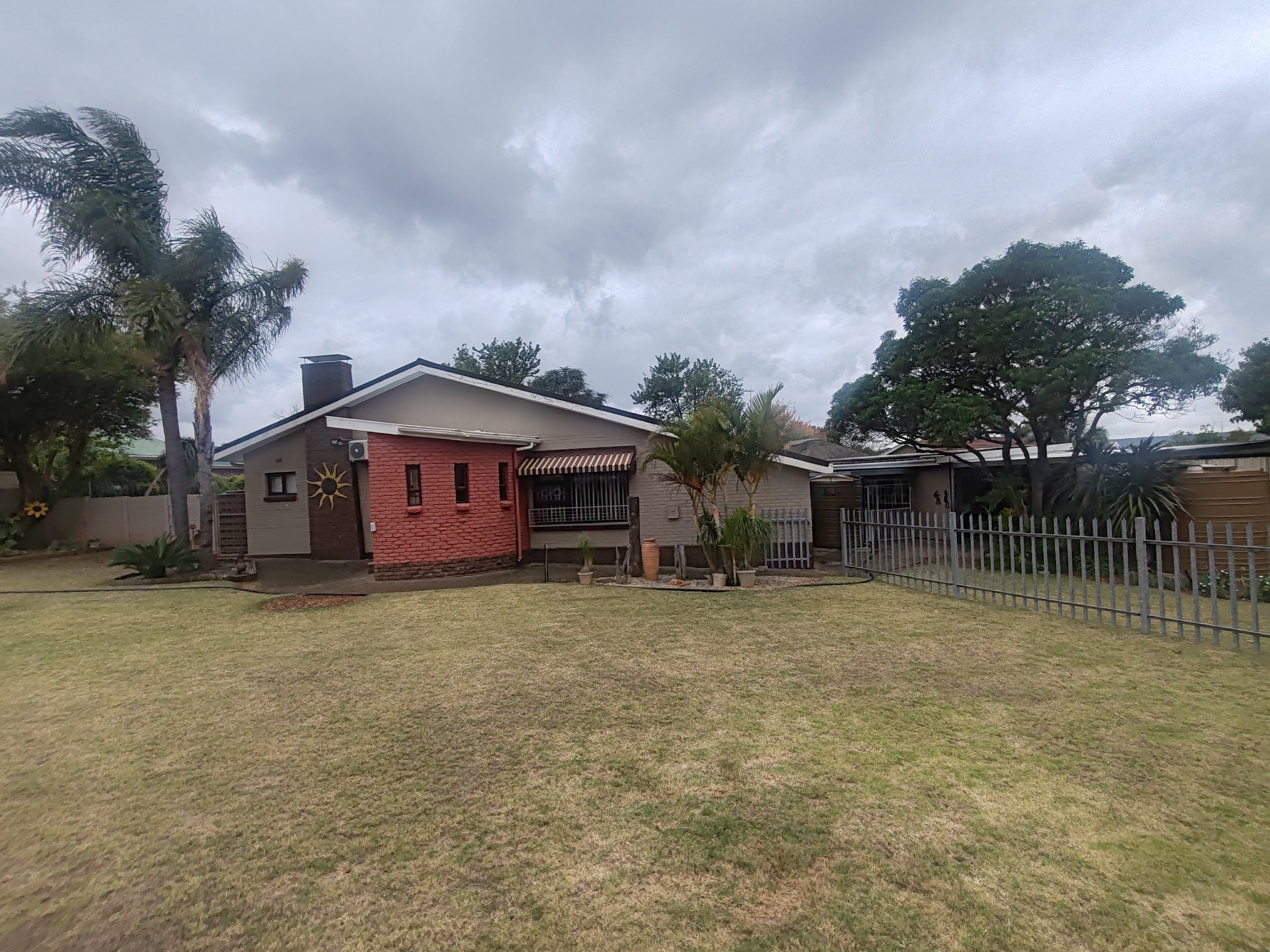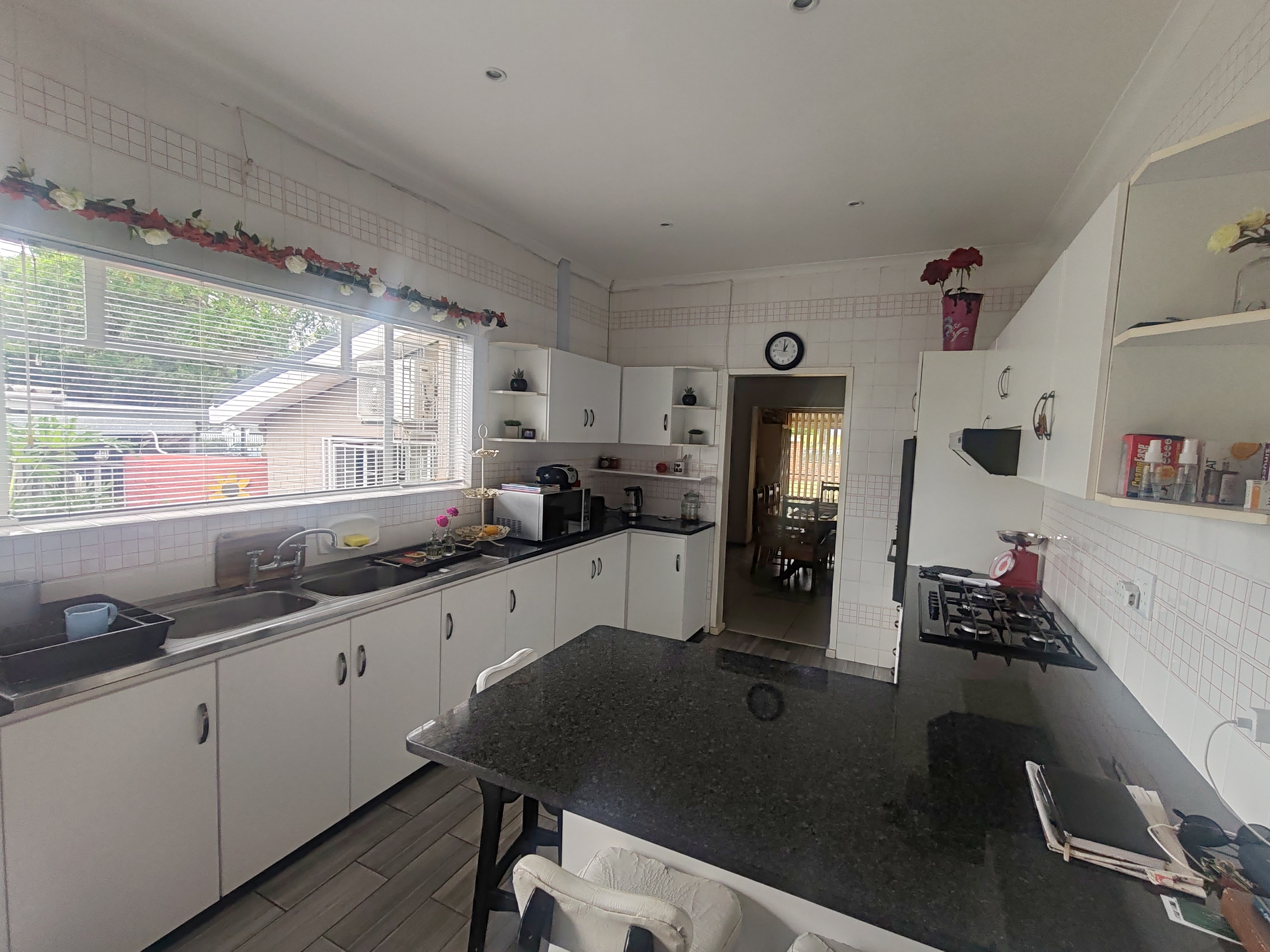 Additional structures include a double remote-controlled garage, maid’s quarters, and two carports. The home is fitted with an alarm system for peace of mind.
